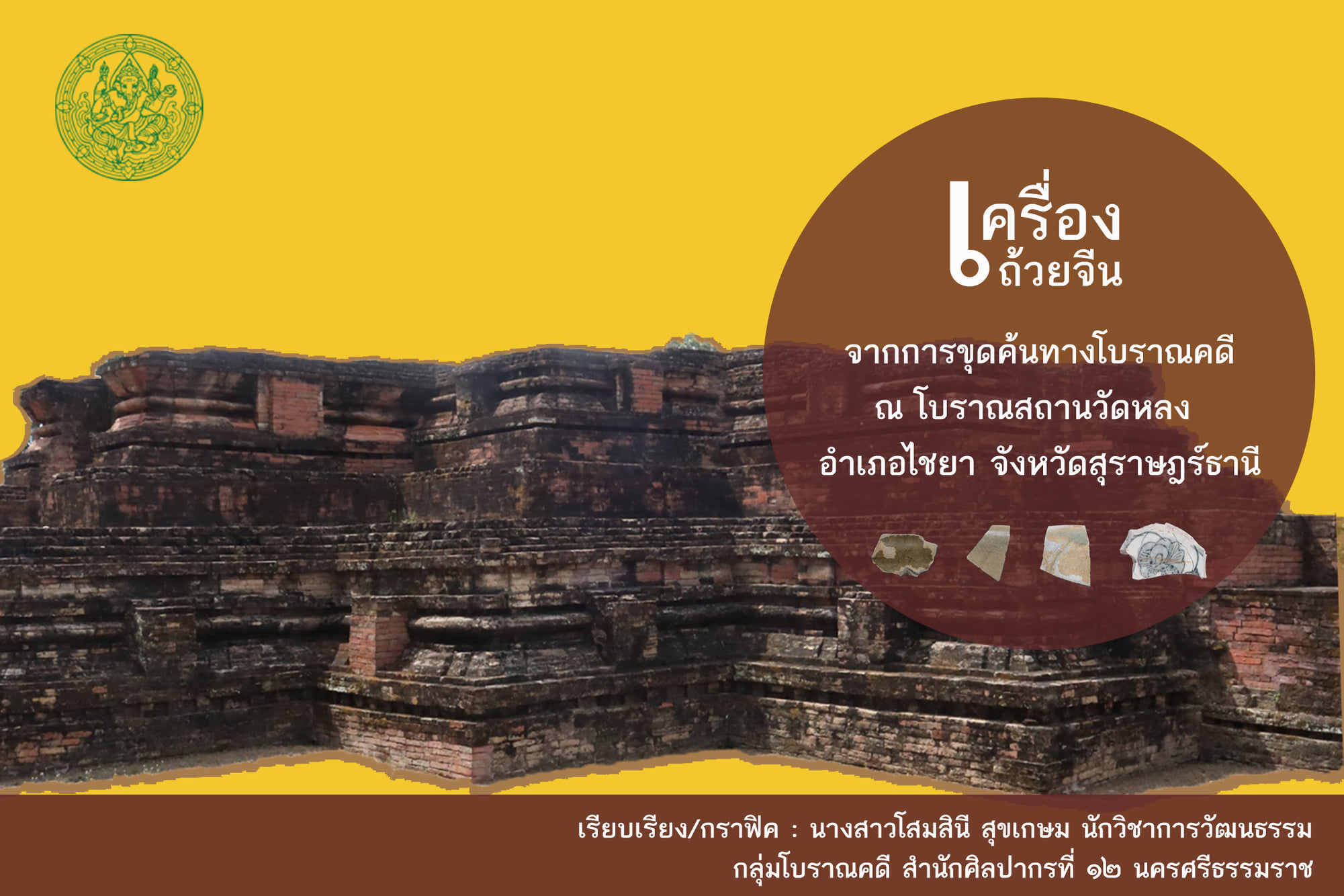 จากการดำเนินการขุดค้นทางโบราณคดี โบราณสถานวัดหลง อำเภอไชยา จังหวัดสุราษฎร์ธานี เมื่อเดือนเมษายน ๒๕๖๔ ที่ผ่านมา มีการค้นพบหลักฐานทางโบราณคดีที่สำคัญหลายประการ เช่น แนวอิฐ ลูกปัดแก้ว ลูกปัดหินกึ่งมีค่า ชิ้นส่วนเครื่องแก้วสีเขียว อิฐบัว อิฐดินเผา ชิ้นส่วนภาชนะดินเผาเนื้อดินมีลายกดประทับ ชิ้นส่วนเครื่องถ้วยจีนสมัยราชวงศ์สุ้ง (พุทธศตวรรษที่ ๑๗ – ๑๙) ชิ้นส่วนเครื่องถ้วยจีนสมัยราชวงศ์หยวน (พุทธศตวรรษที่ ๑๙ – ๒๐) เครื่องถ้วยจีนสมัยราชวงศ์หมิง (พุทธศตวรรษที่ ๒๐ – ๒๒) ที่น่าสนใจคือพบว่าชิ้นส่วนเครื่องถ้วยจีนที่พบจากการขุดค้นทางโบราณคดีครั้งนี้แสดงให้เห็นถึงการใช้พื้นที่โบราณสถานที่ต่อเนื่องยาวนานหลายสมัย จากการขุดค้นพบเครื่องถ้วยจีนทั้งหมด ๑๐๖ ชิ้น สามารถกำหนดอายุได้ ๓ สมัย ได้แก่