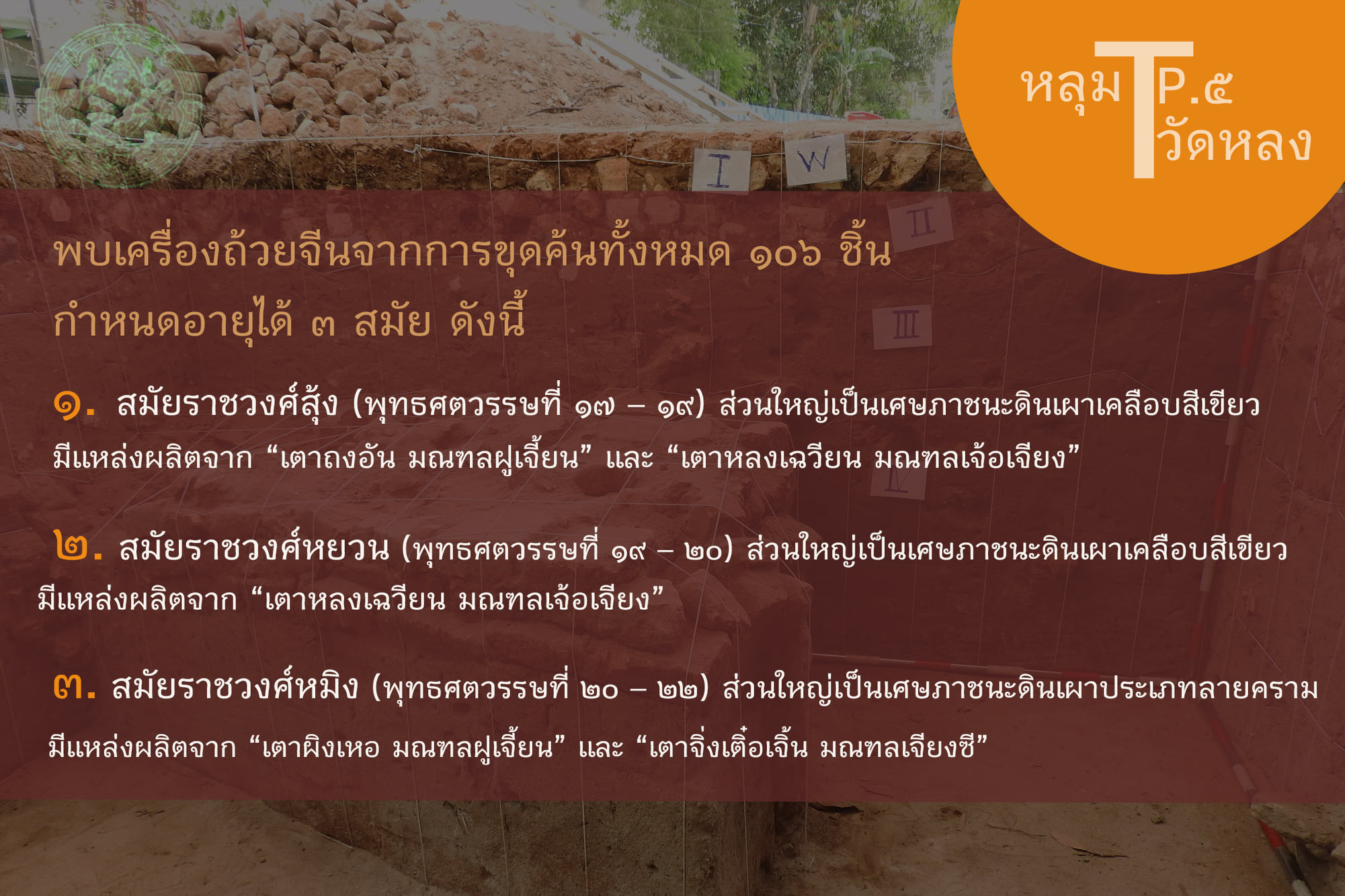 ๓. สมัยราชวงศ์หมิง พุทธศตวรรษที่ ๒๐ – ๒๒ ส่วนใหญ่เป็นเศษภาชนะดินเผาประเภทลายคราม โดยมีแหล่งผลิตจาก “เตาผิงเหอ มณฑลฝูเจี้ยน” และ “เตาจิ่งเติ๋อเจิ้น มณฑลเจียงซี” โดยการส่งออกเครื่องปั้นดินเผาในระยะนี้มักพบบริเวณภาคเหนือ ภาคกลาง ภาคตะวันออกเฉียงเหนือ และภาคใต้ของประเทศไทย