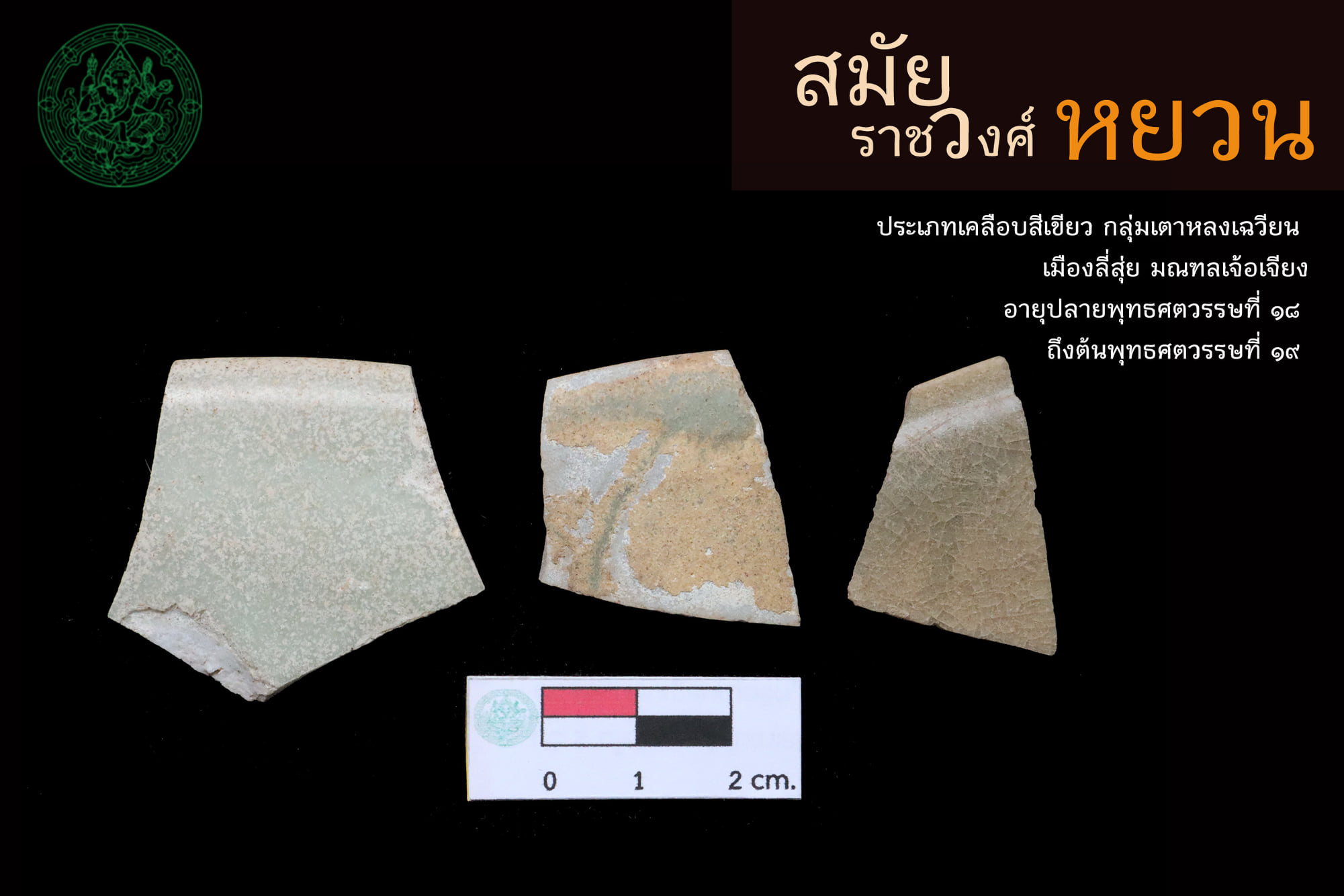 ๒. สมัยราชวงศ์หยวน พุทธศตวรรษที่ ๑๙ – ๒๐ ส่วนใหญ่เป็นเศษภาชนะดินเผาเคลือบสีเขียว มีแหล่งผลิตจาก “เตาหลงเฉวียน มณฑลเจ้อเจียง” โดยการส่งออกเครื่องปั้นดินเผาในระยะนี้มักพบบริเวณภาคเหนือและภาคกลางของประเทศไทยมากกว่าภาคใต้ ซึ่งก็สอดคล้องกับจำนวนเครื่องถ้วยจีนที่พบในหลุมขุดค้นที่มีปริมาณน้อยสุดในบรรดาราชวงศ์ต่าง ๆ ที่กำหนดอายุได้