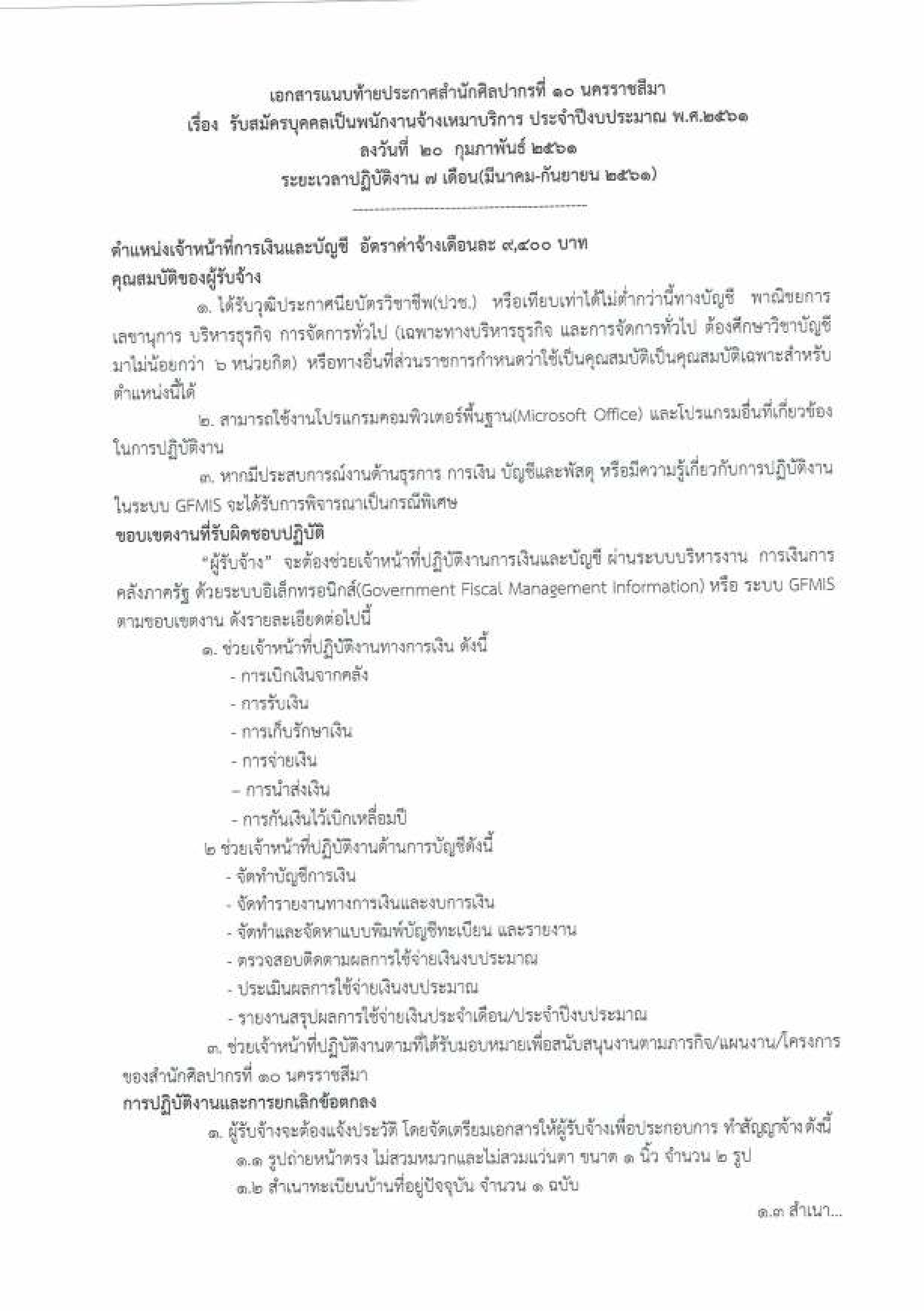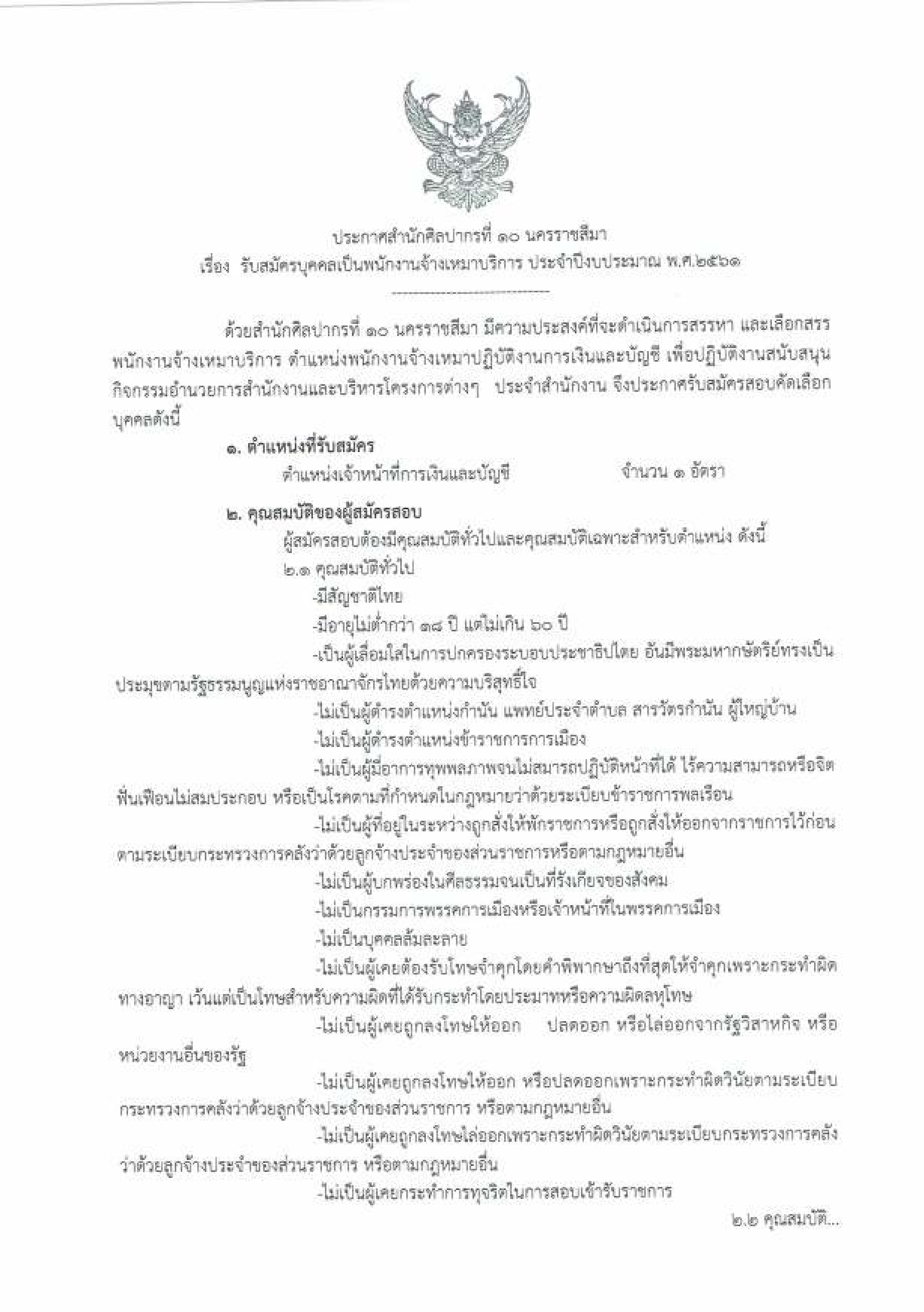 ประกาศสำนักศิลปากรที่ ๑๐ นครราชสีมา เรื่อง รับสมัครบุคคลเป็นพนักงานจ้างเหมาบริการ ประจำปีงบประมาณ พ.ศ.๒๕๖๑ ด้วยสำนักศิลปากรที่ ๑๐ นครราชสีมา มีความประสงค์ที่จะดำเนินการสรรหา และเลือกสรรพนักงานจ้างเหมาบริการ ตำแหน่งพนักงานจ้างเหมาปฏิบัติงานการเงินและบัญชี เพื่อปฏิบัติงานสนับสนุนกิจกรรมอำนวยการสำนักงานและบริหารโครงการต่างๆ ประจำสำนักงาน รายละเอียดตามเอกสารแนบ