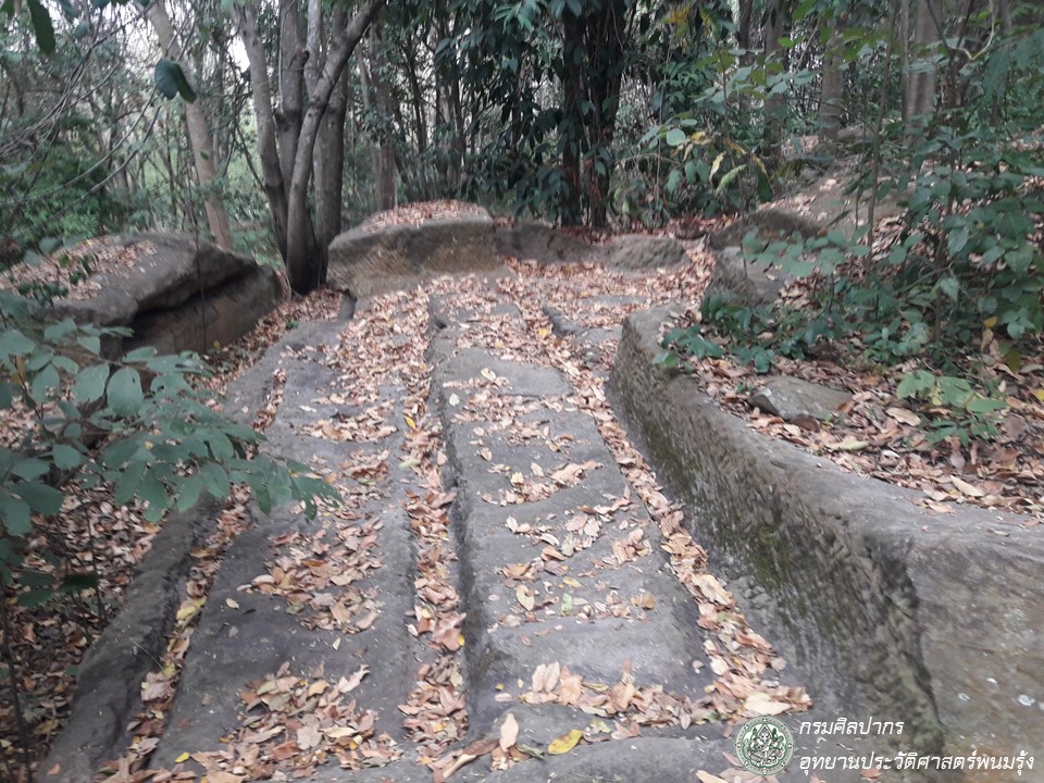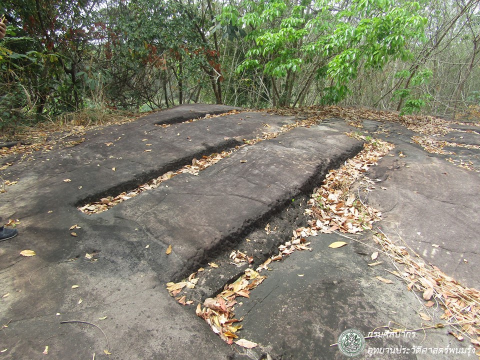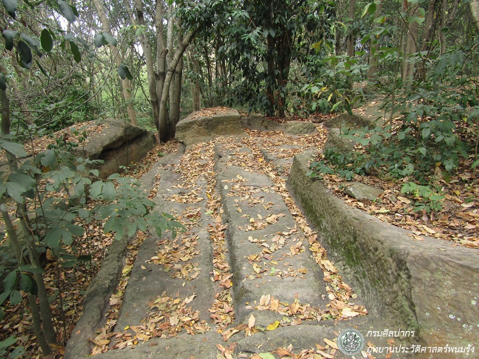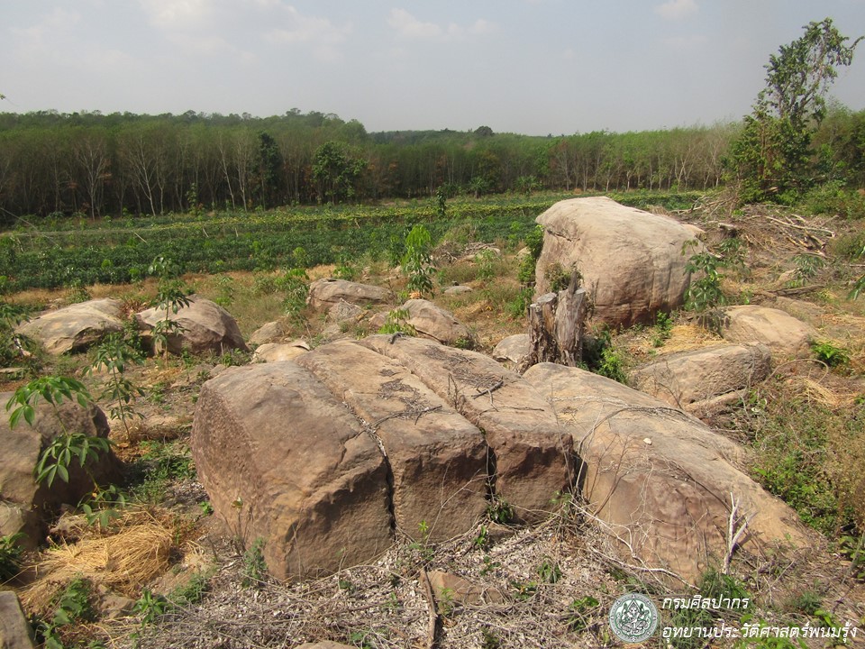 นักธรณีวิทยาให้ความเห็นว่าหินทรายจากบริเวณดังกล่าวมีลักษณะคล้ายคลึงกับที่ใช้สร้างปราสาทพนมรุ้งและปราสาทเมืองต่ำทุกประการ นั่นคือเป็นหินทรายสีชมพู ที่มีเม็ดทรายเป็นแร่ควอตซ์ (Quartz) เม็ดทรายขนาดปานกลาง การประสานตัว (การเกาะตัว) ค่อนข้างดี ทำให้เนื้อแน่น (แข็ง) และค่อนข้างเหนียว จัดอยู่ในหินทรายหมวดหินพระวิหาร (Phra Wihan Formation) ซึ่งเป็นหน่วยหนึ่งในหินชุดโคราช (Khorat Group) //นักโบราณคดีสันนิษฐานว่าในกระบวนการตัดหิน เริ่มต้นจากการปรับหน้าหินให้เรียบ จากนั้นเซาะร่องบนหินด้วยสิ่วปลายแหลม แล้วใช้ลิ่มสอดบนร่องใช้ค้อนทุบลงไปบนลิ่ม หินจะแยกออกจากกันเป็นก้อน แล้วจึงเคลื่อนย้ายไปสร้างปราสาท โดยกระบวนการตัดหินจะเริ่มทำในช่วงต้นฤดูแล้ง แล้วกลิ้งหินลงไปตามความลาดชันของไหล่เขาลงสู่ห้วยมะไฟ เมื่อเข้าฤดูฝนห้วยมะไฟเริ่มมีน้ำไหลหลาก คนโบราณอาจใช้ไม้ไผ่ทำเป็นแพแล้วงัดหินขนาดต่าง ๆ ขึ้นบนนั้นรอจนปริมาณน้ำมีมากและสูงขึ้น จึงล่องแพไปตามสายน้ำ โดยมีผู้ควบคุมค้ำยันให้แพล่องจนเข้าลำปะเทียแล้วเข้าคลองปูนทางทิศใต้ของเขาพนมรุ้ง จากนั้นจึงหยุดแพแล้วงัดก้อนหินขึ้นบกโดยใช้แรงงานของคนและสัตว์เช่น ช้าง ม้า ชักลากขึ้นสู่บริเวณสถานที่ก่อสร้าง