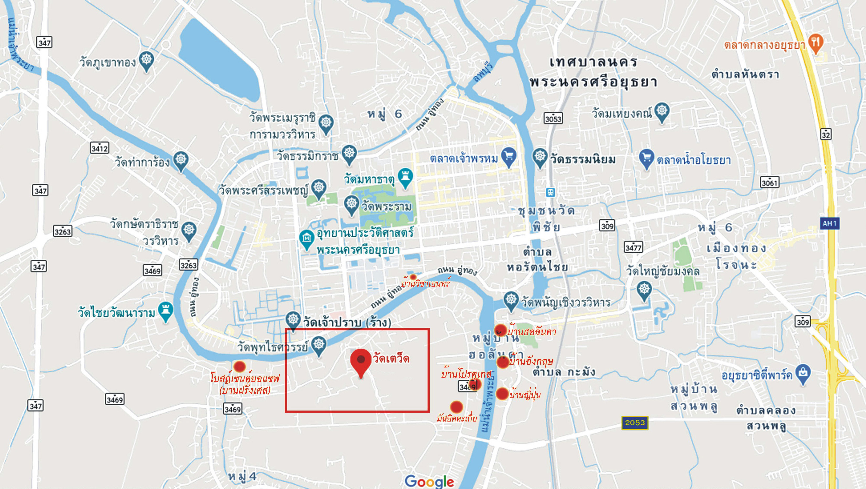 ภาพที่ ๑ แผนที่ทางอากาศแสดงตำแหน่งที่ตั้งโบราณสถานวัดเตว็ด และชุมชนชาวต่างชาติ (ที่มา : Google Maps)