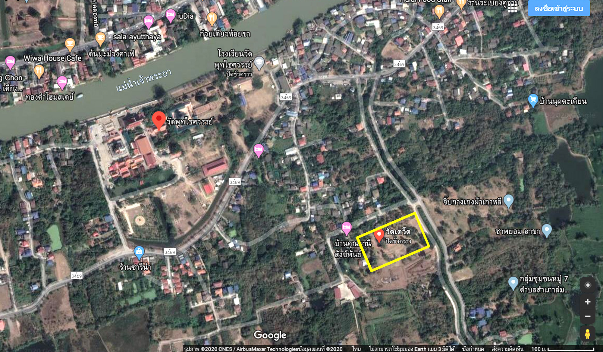 ภาพที่ ๒ ภาพถ่ายทางอากาศแสดงตำแหน่งที่ตั้งโบราณสถานวัดพุทไธศวรรย์ และวัดเตว็ด (ที่มา : Google Maps)