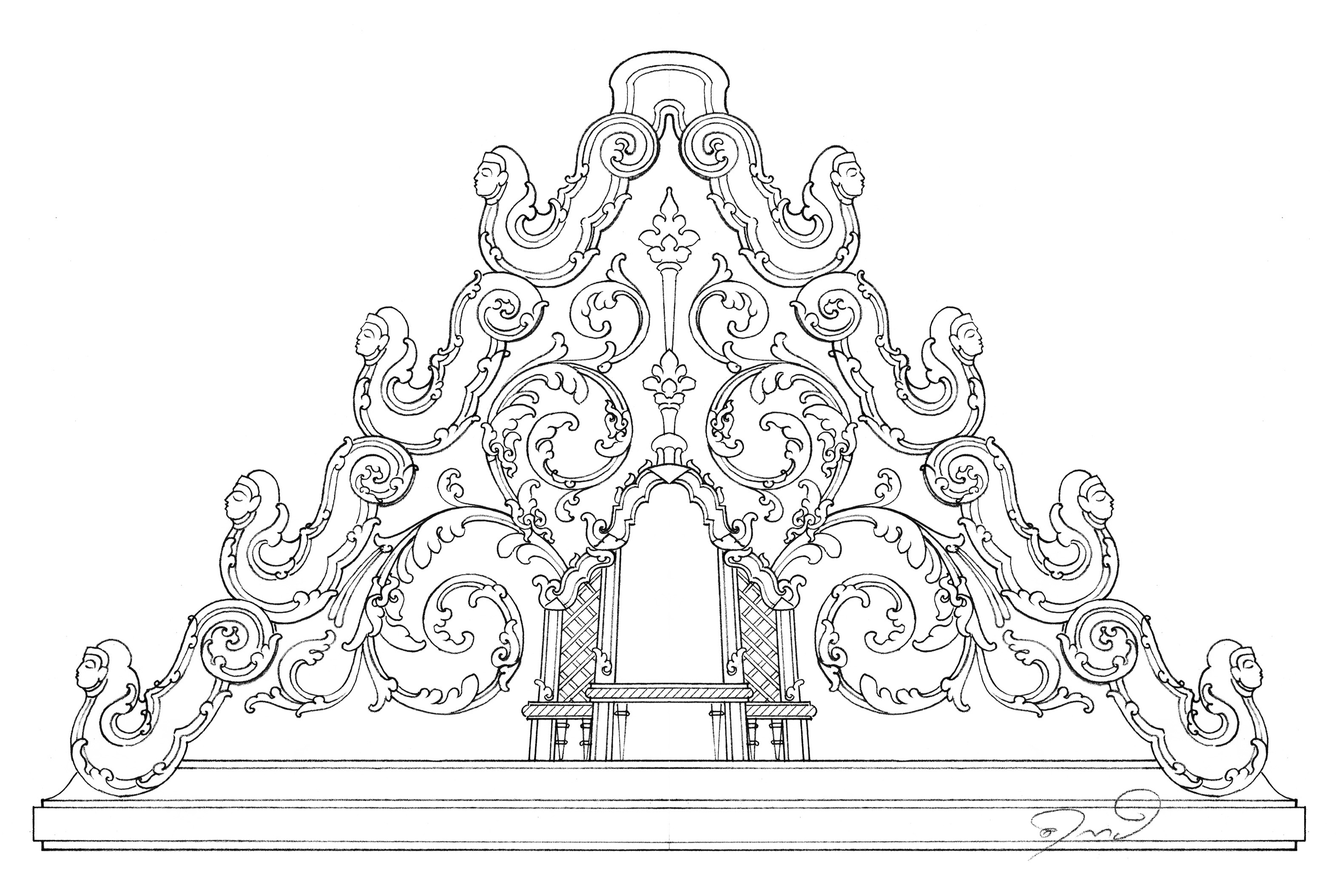ภาพที่ ๘ ลายเส้นสันนิษฐานรูปแบบลวดลายปูนปั้นหน้าบันตำหนัก (กุฏิ?) วัดเตว็ด