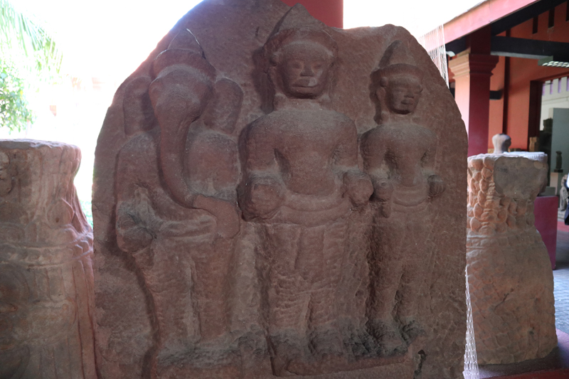ภาพที่ ๓ แผ่นหินทรายสลักภาพพระศิวะ พระคเณศ สกันทกุมาร จากพิพิธภัณฑสถานแห่งชาติพนมเปญ Triad of Shiva,Ganesa and Skanda Chikreng,Kampong Thom 12th C