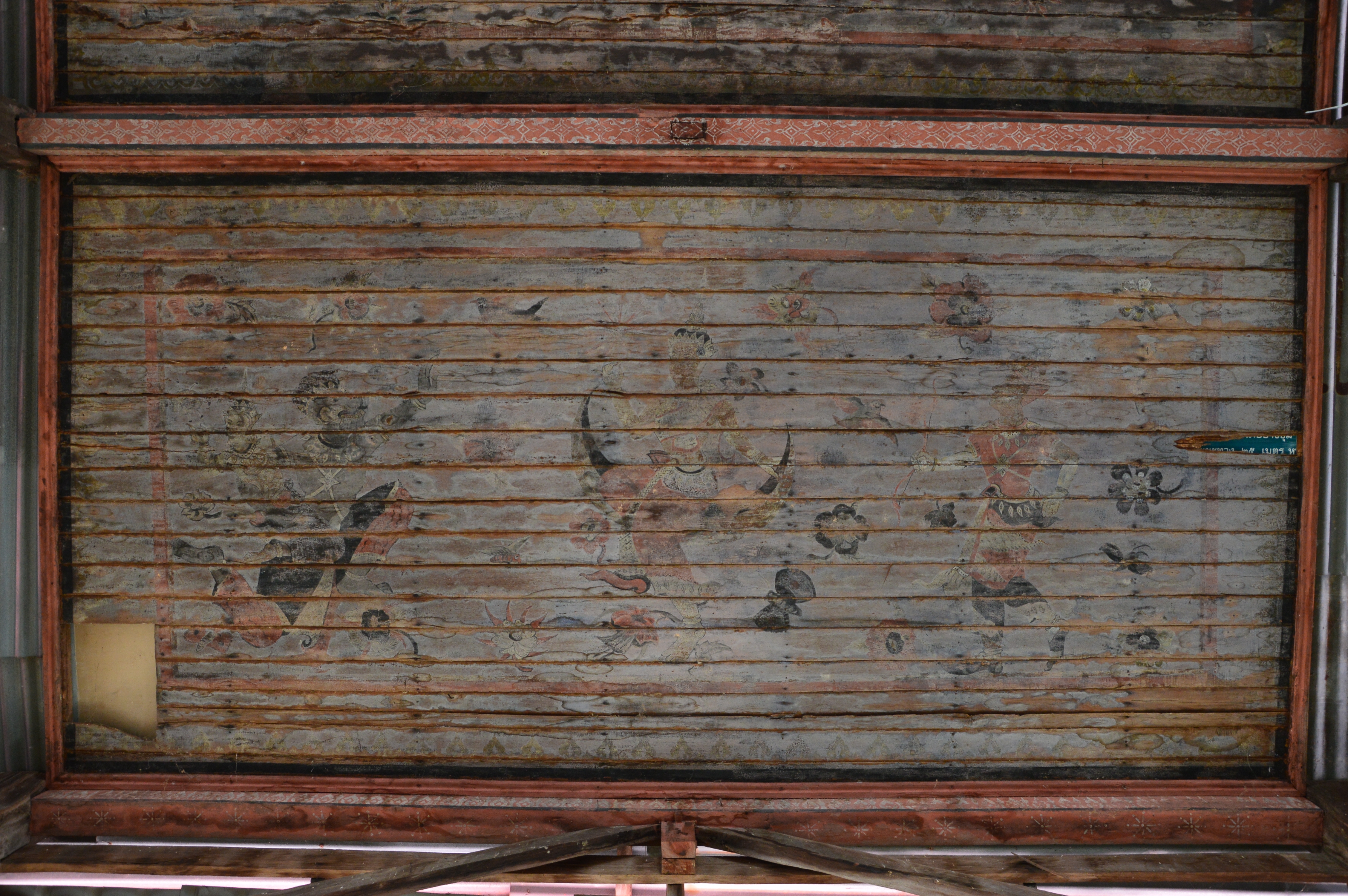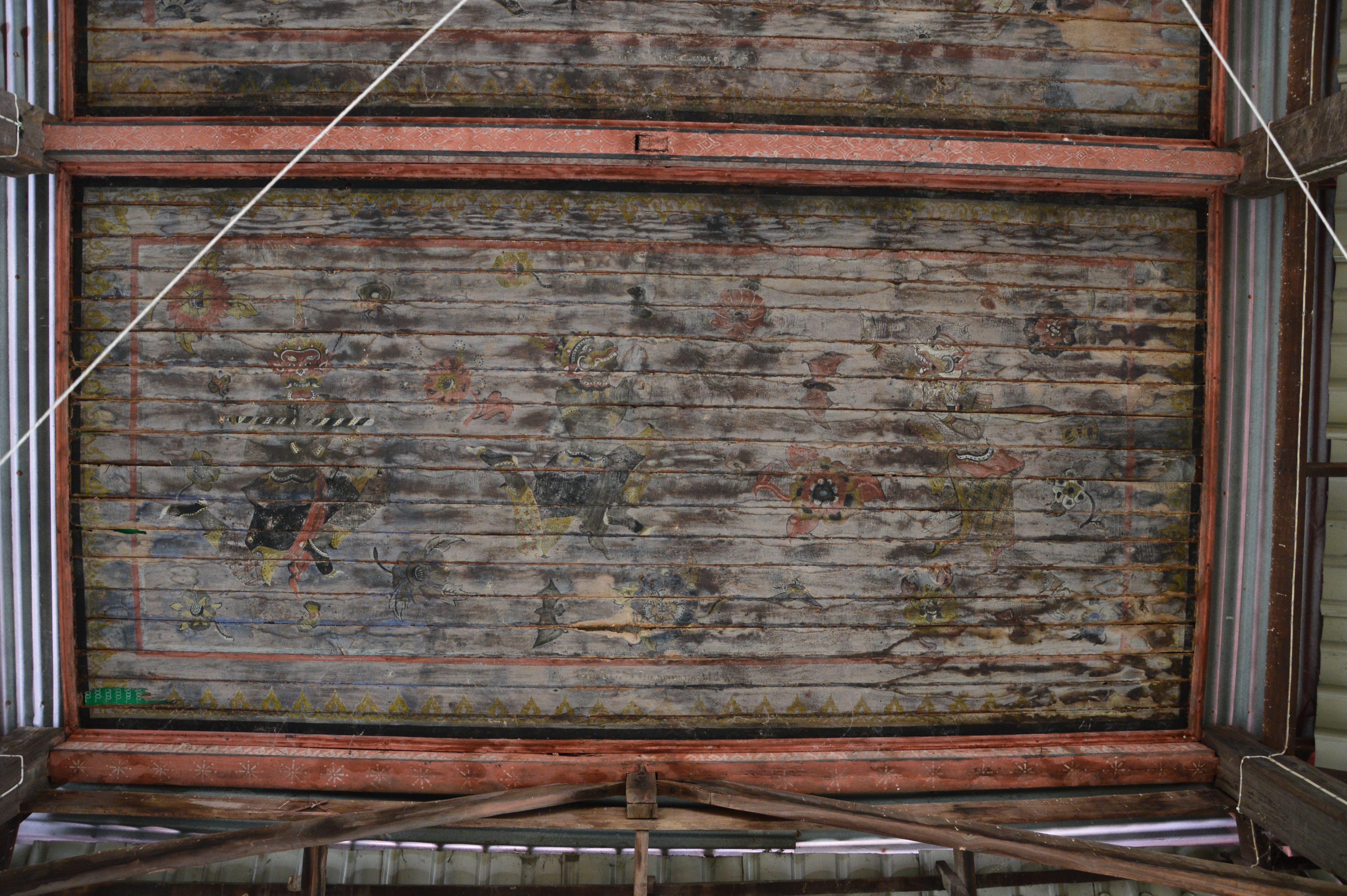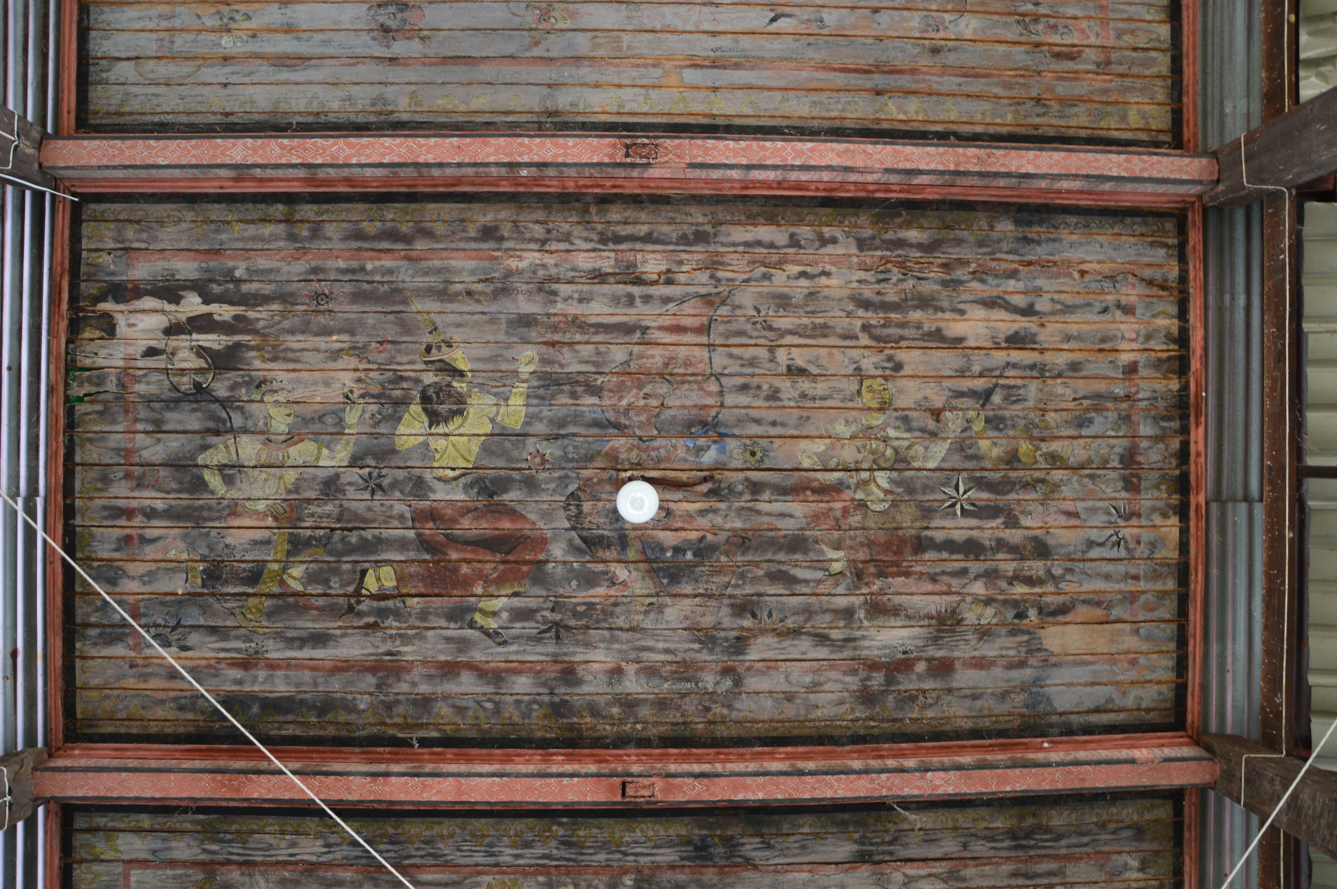 ภาพเขียนบนฝ้าเพดานแบ่งออกเป็นสามช่อง เขียนในราวปีพ.ศ.๒๔๘๕ พร้อมกับสร้างศาลา ภาพเขียนด้วยสีฝุ่นบนพื้นไม้ สันนิษฐานว่าน่าจะเป็นเรื่องราวในเรื่องรามเกียรติ์ทั้งสามตอน สภาพค่อนข้างลบเลือน แผ่นไม้มีรอยแตกสภาพสีหลุดร่อนบางส่วน