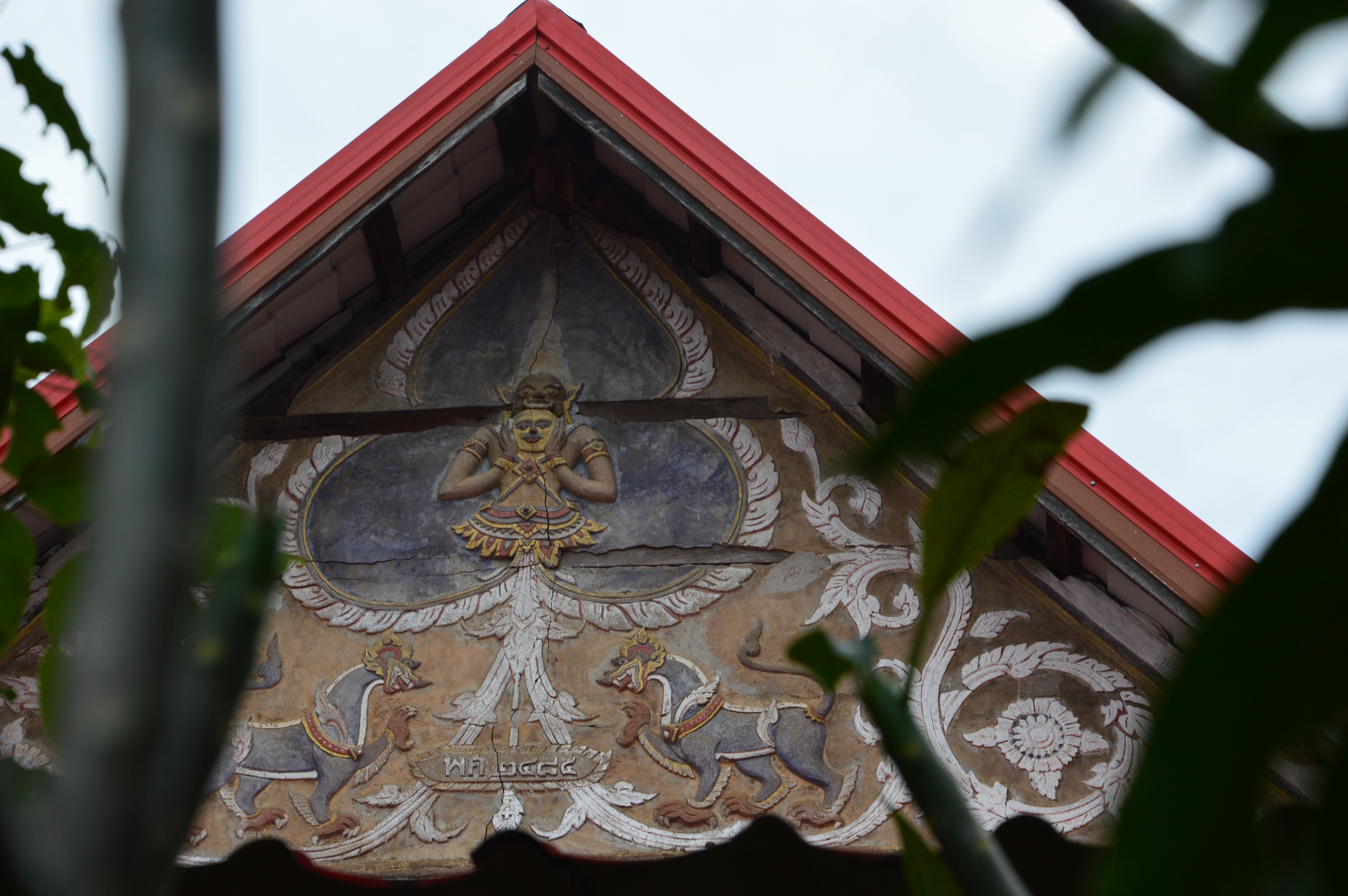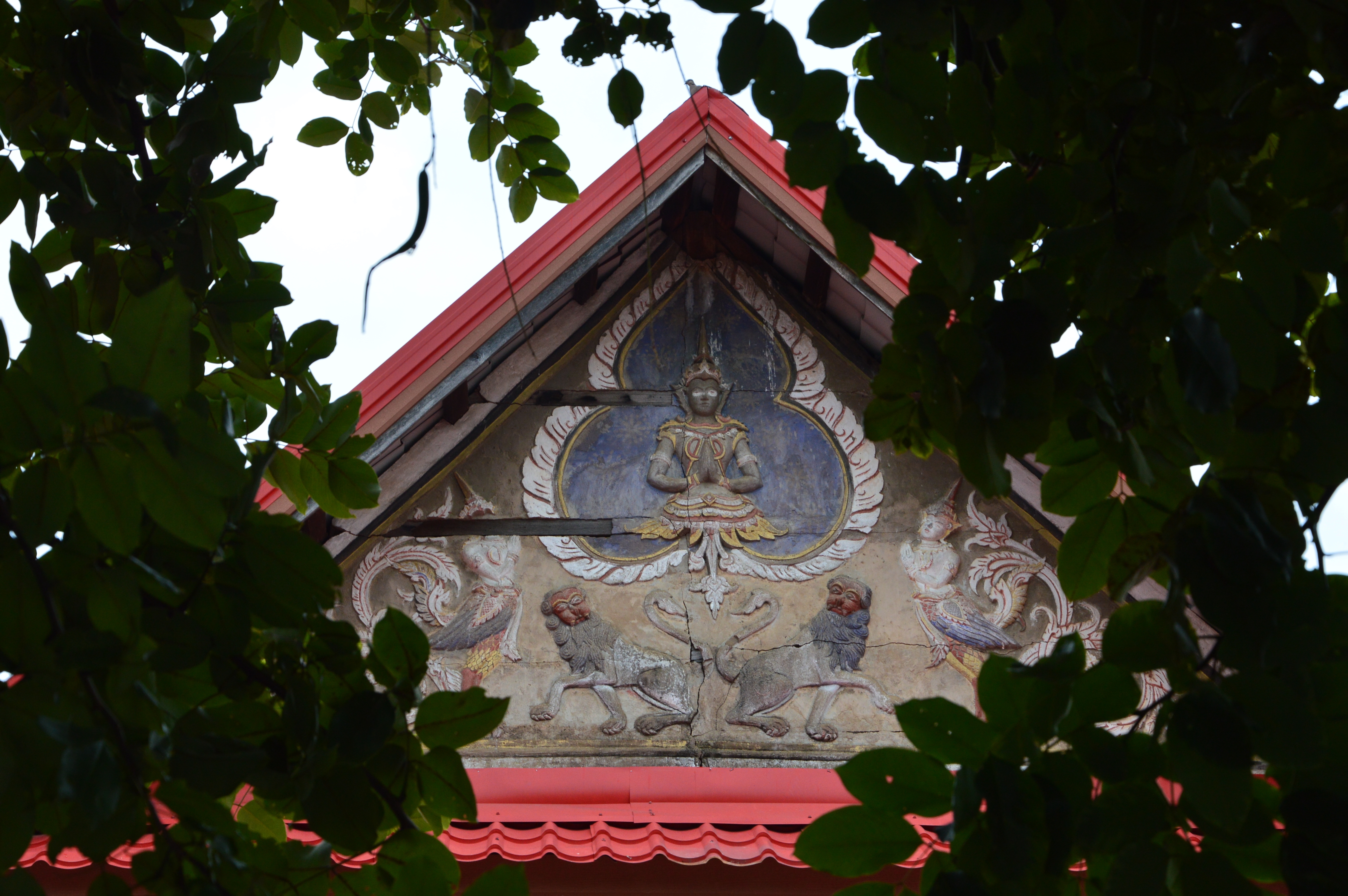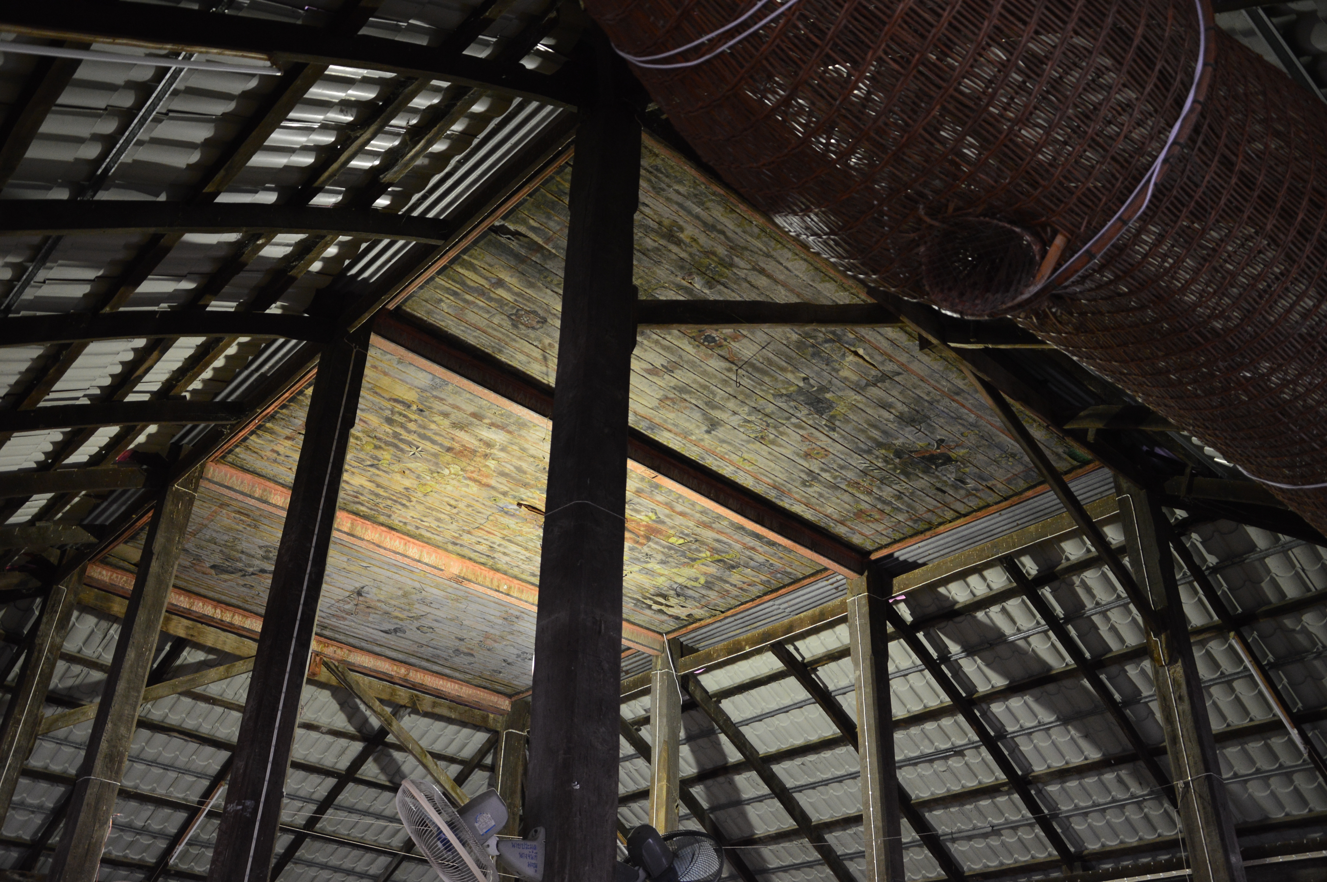 ภาพเขียนบนฝ้าเพดานแบ่งออกเป็นสามช่อง เขียนในราวปีพ.ศ.๒๔๘๕ พร้อมกับสร้างศาลา ภาพเขียนด้วยสีฝุ่นบนพื้นไม้ สันนิษฐานว่าน่าจะเป็นเรื่องราวในเรื่องรามเกียรติ์ทั้งสามตอน สภาพค่อนข้างลบเลือน แผ่นไม้มีรอยแตกสภาพสีหลุดร่อนบางส่วน