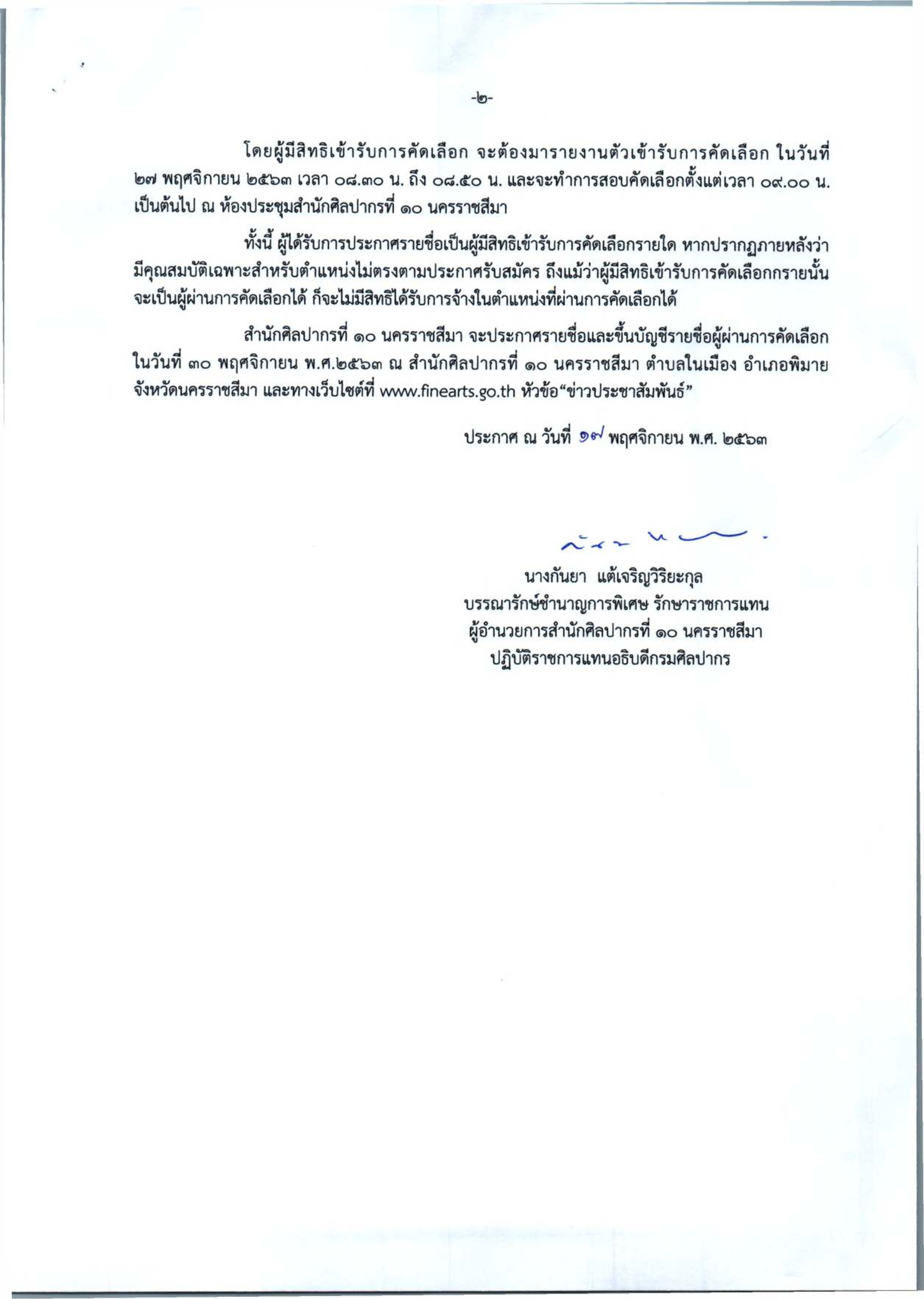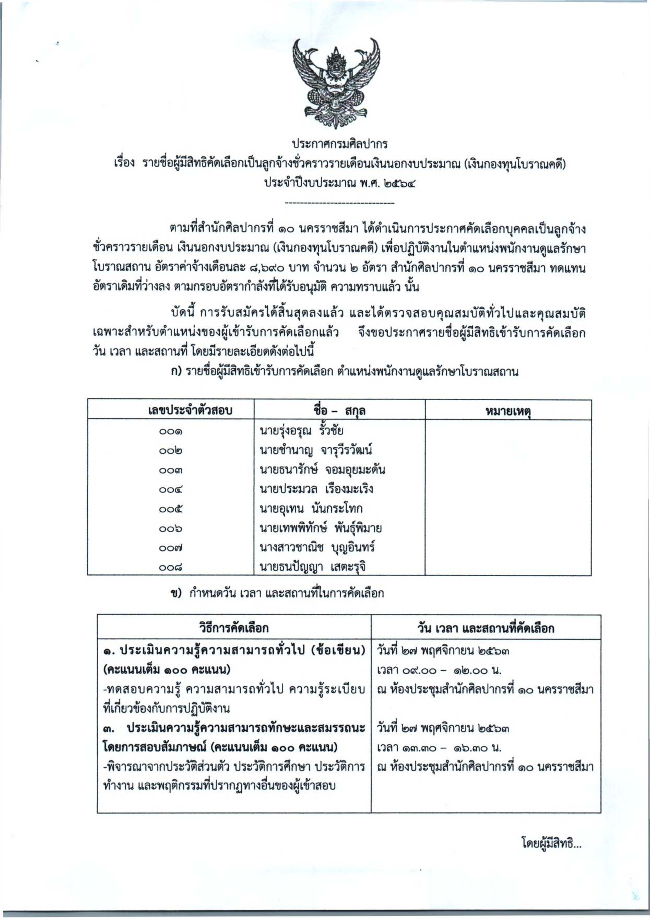 ประกาศสำนักศิลปากรที่ ๑๐ นครราชสีมา เรื่อง รายชื่อผู้มีสิทธิคัดเลือกเป็นลูกจ้างชั่วคราวรายเดือนเงินนอกงบประมาณ (เงินกองทุนโบราณคดี) ประจำปีงบประมาณ พ.ศ. ๒๕๖๔