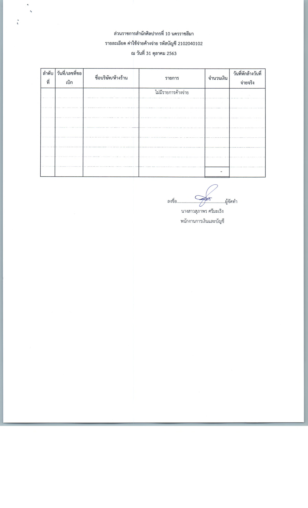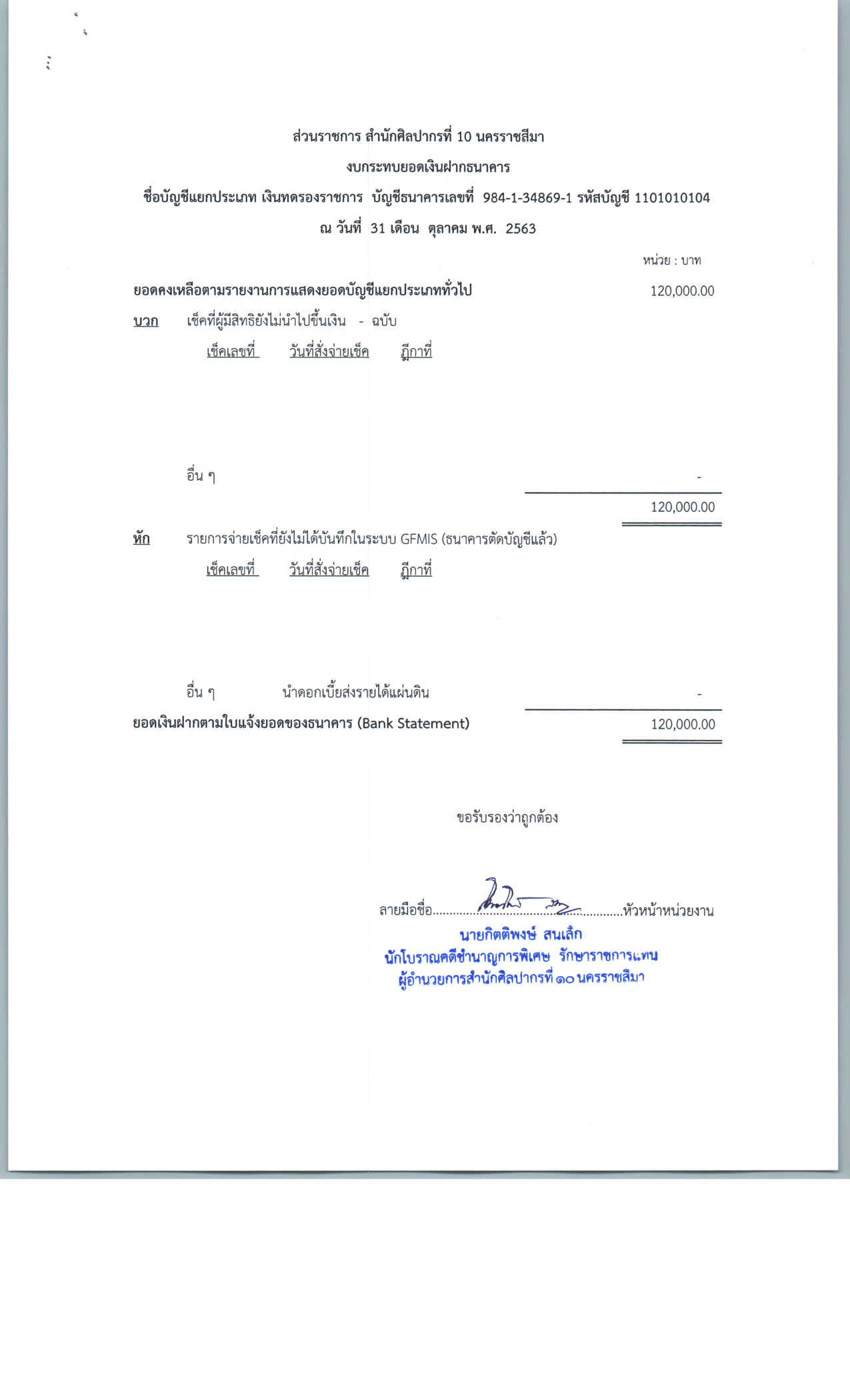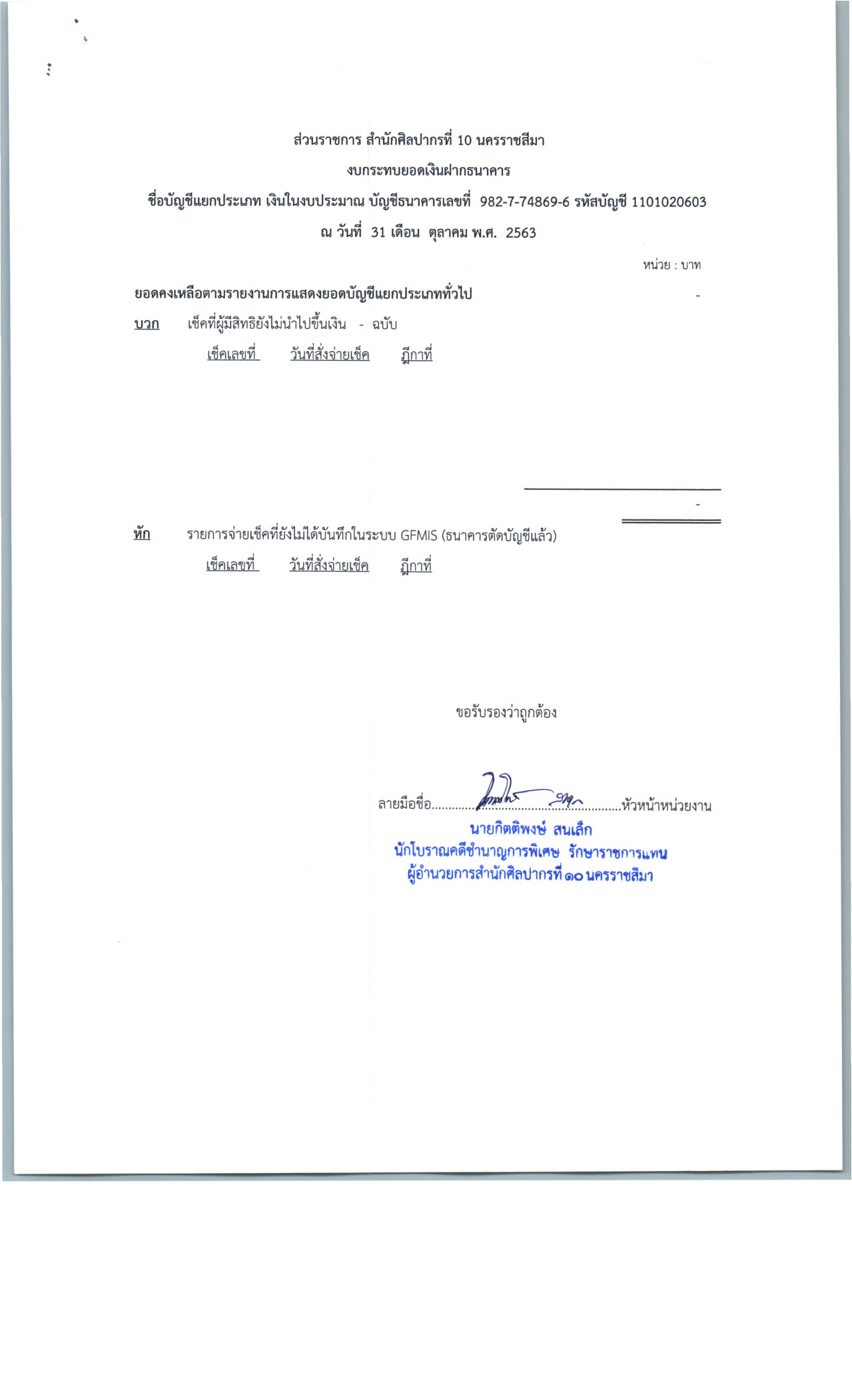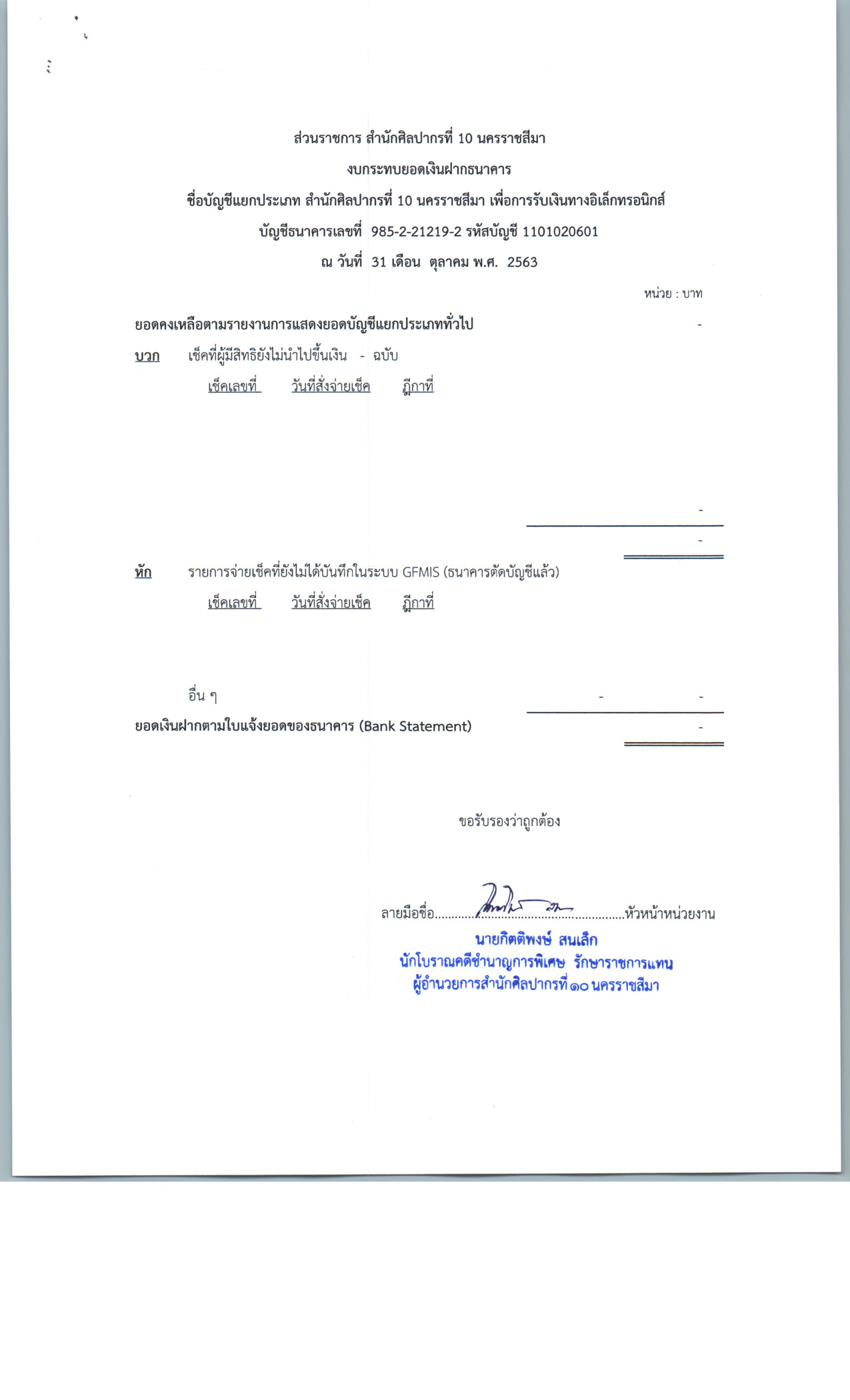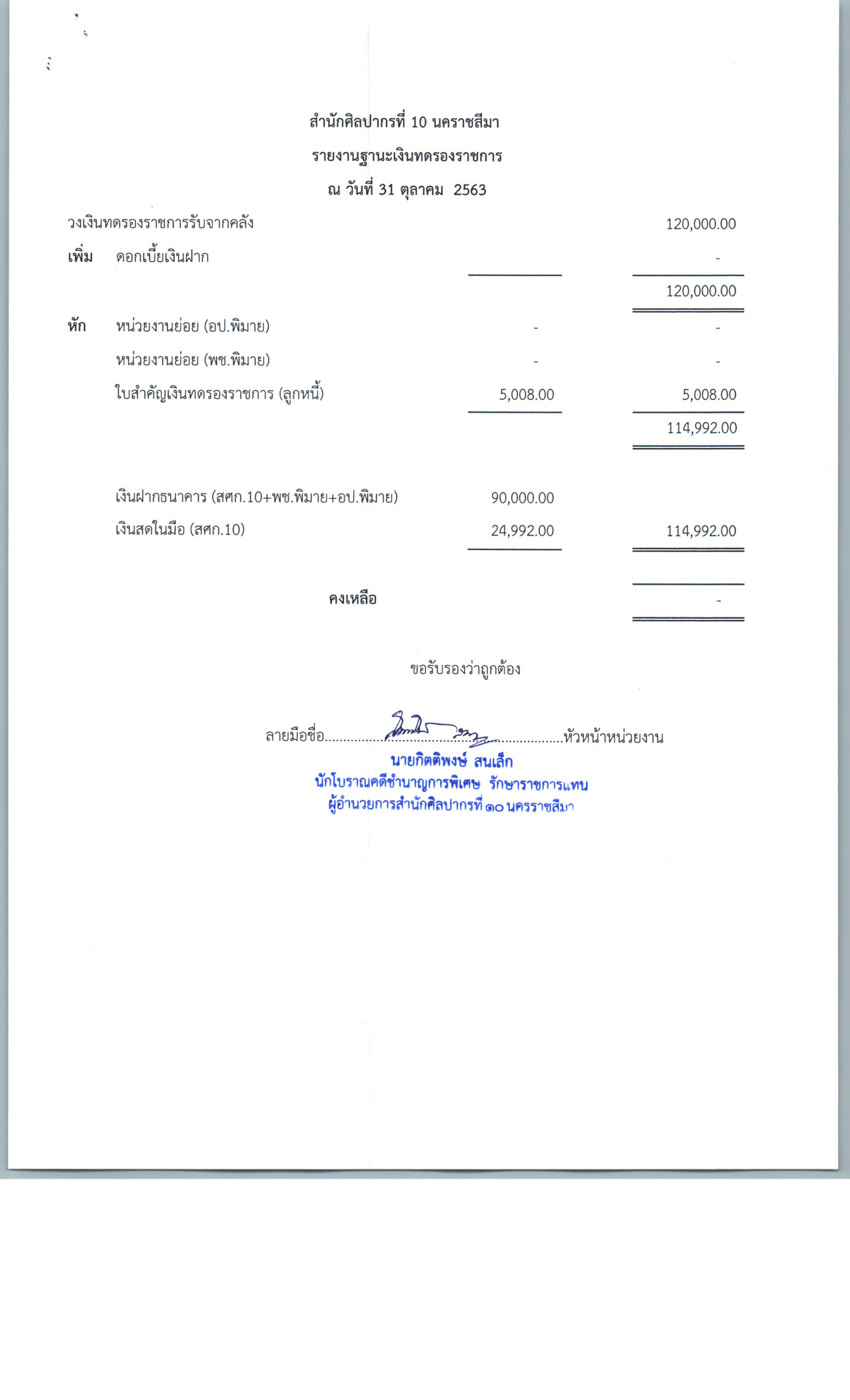 รายงานบัญชีงบทดลองและเอกสารประกอบงบทดลอง สำนักศิลปากรที่ ๑๐ นครราชสีมา (เดือนตุลาคม ๒๕๖๓)