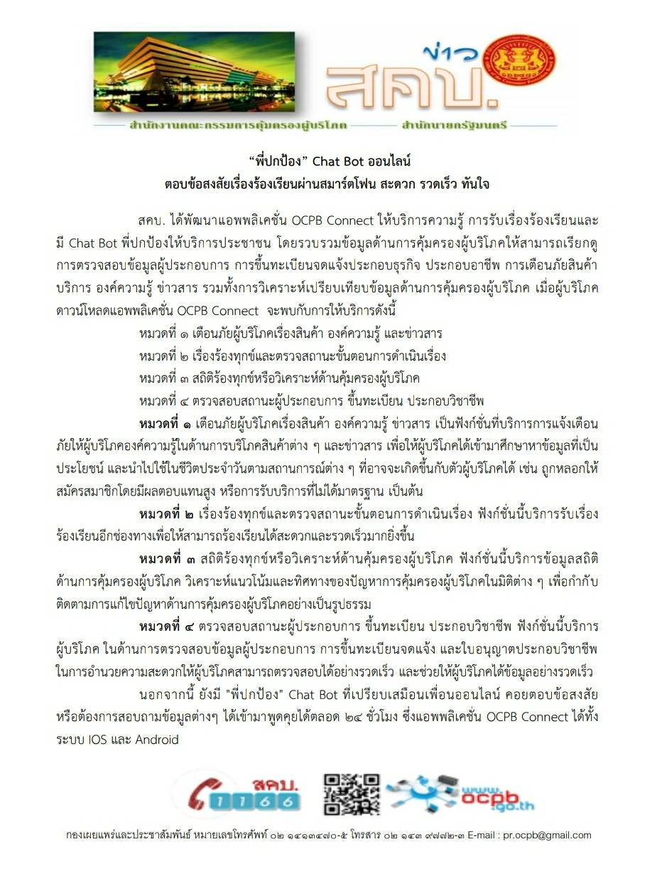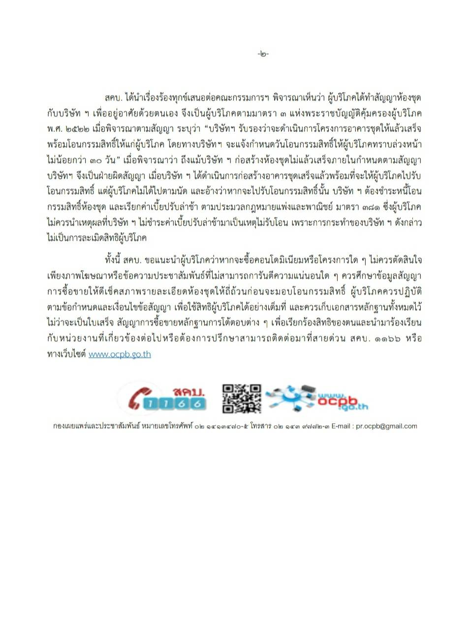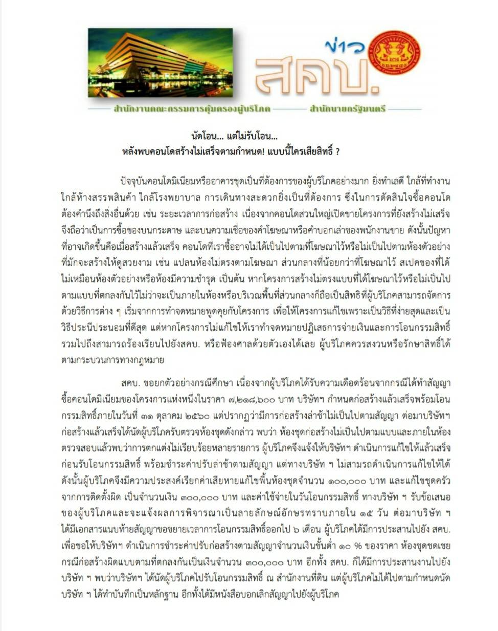 ข่าวประชาสัมพันธ์จากสำนักงานคณะกรรมการคุ้มครองผู้บริโภค เรื่อง... "พี่ปกป้อง" Chat Bot ออนไลน์ และ "นัดโอนแต่ไม่รับโอน หลังพบคอนโดสร้างไม่เสร็จตามกำหนด แบบนี้ใครเสียสิทธิ์"
