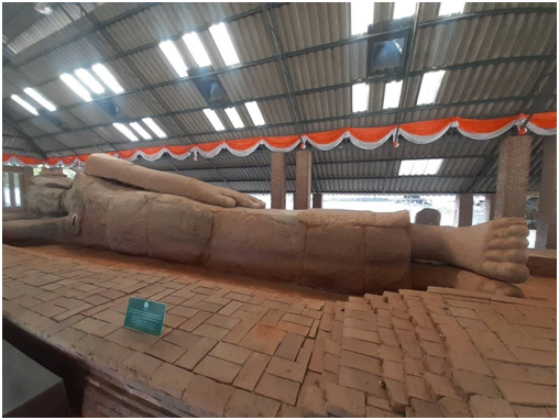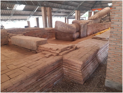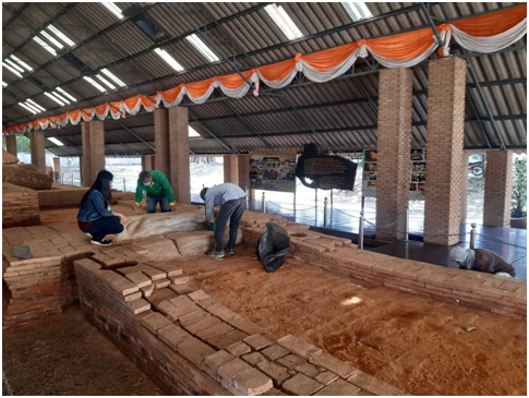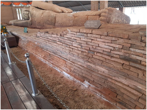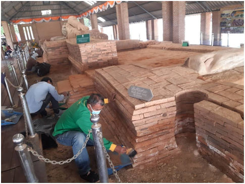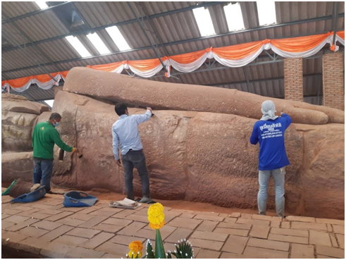 การดำเนินงานทำความสะอาดคราบเกลือที่เกิดจากความชื้นและความเค็มของดิน โบราณสถานพระนอน ณ วัดธรรมจักรเสมาราม ตำบลเสมา อำเภอสูงเนิน จังหวัดนครราชสีมา โดย นางสาวนิตยา สาระรัตน์ นายช่างศิลปกรรมอาวุโส และคณะ