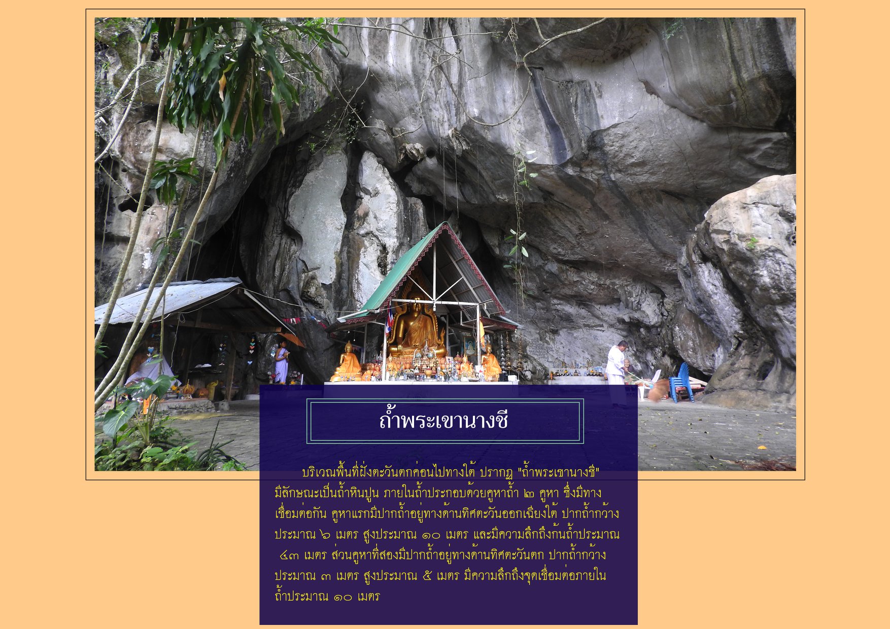 บริเวณพื้นที่ฝั่งตะวันตกค่อนไปทางใต้ ปรากฏ "ถ้ำพระเขานางชี" มีลักษณะเป็นถ้ำหินปูน ภายในถ้ำประกอบด้วยคูหาถ้ำ ๒ คูหาซึ่งมีทางเชื่อมต่อกัน คูหาแรกมีปากถ้ำอยู่ทางด้านทิศตะวันออกเฉียงใต้ ปากถ้ำกว้างประมาณ ๖ เมตร สูงประมาณ ๑๐ เมตร และมีความลึกถึงก้นถ้ำประมาณ ๔๓ เมตร ส่วนคูหาที่สองมีปากถ้ำอยู่ทางด้านทิศตะวันตก ปากถ้ำกว้างประมาณ ๓ เมตร สูงประมาณ ๕ เมตร มีความลึกถึงจุดเชื่อมต่อภายในถ้ำประมาณ ๑๐ เมตร