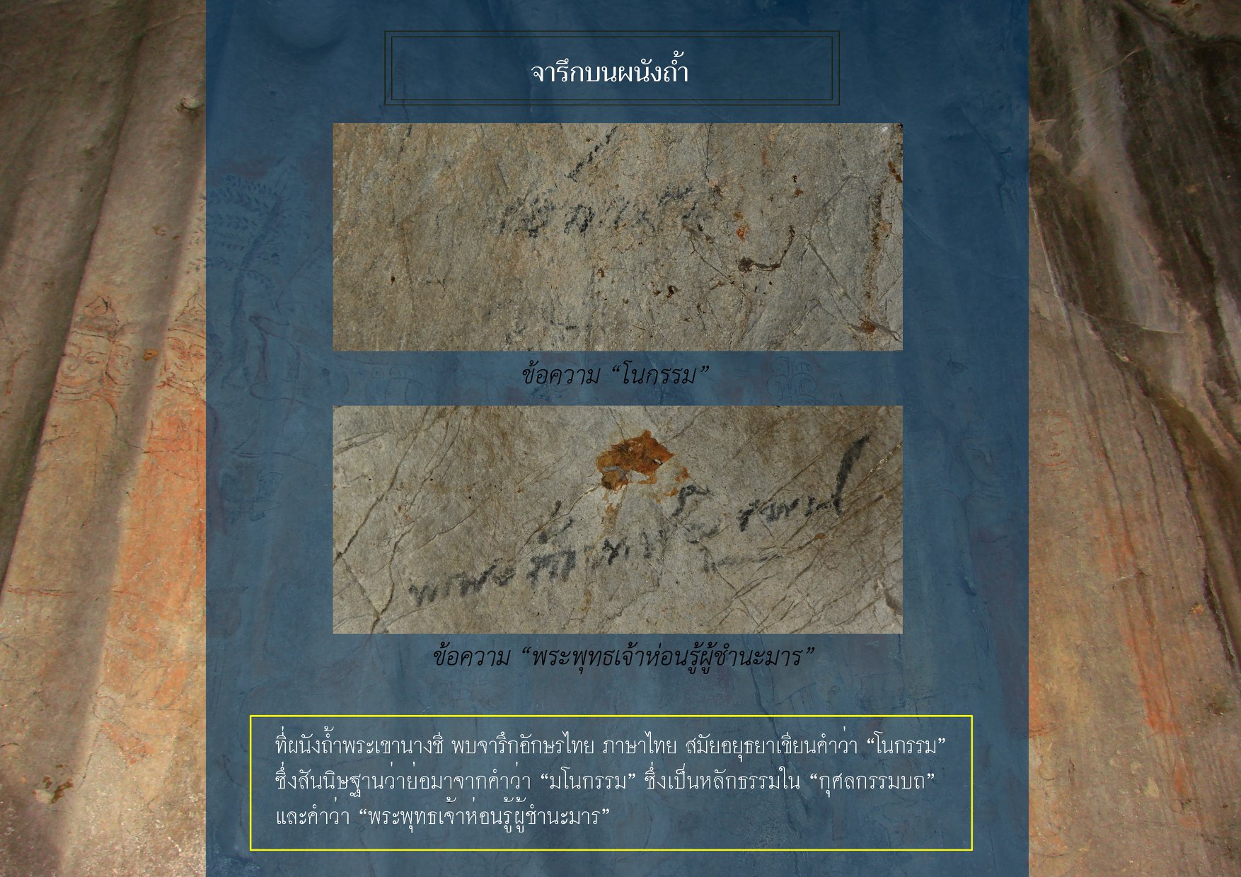ที่ผนังถ้ำพระเขานางชี พบจารึกอักษรไทย ภาษาไทย สมัยอยุธยาเขียนคำว่า “โนกรรม” ซึ่งสันนิษฐานว่าย่อมาจากคำว่า “มโนกรรม” ซึ่งเป็นหลักธรรมใน “กุศลกรรมบถ” และคำว่า “พระพุทธเจ้าห่อนรู้ผู้ชำนะมาร”