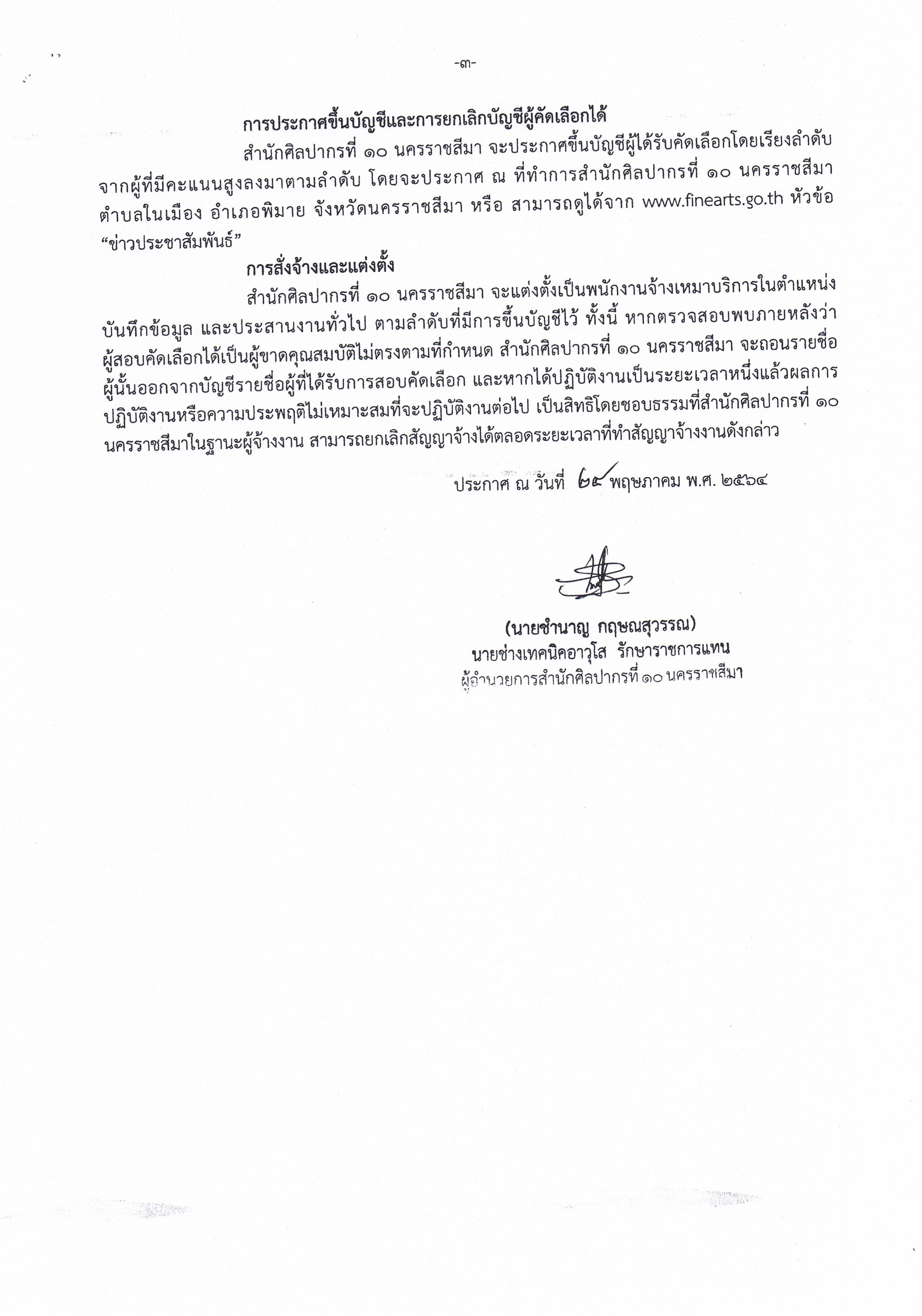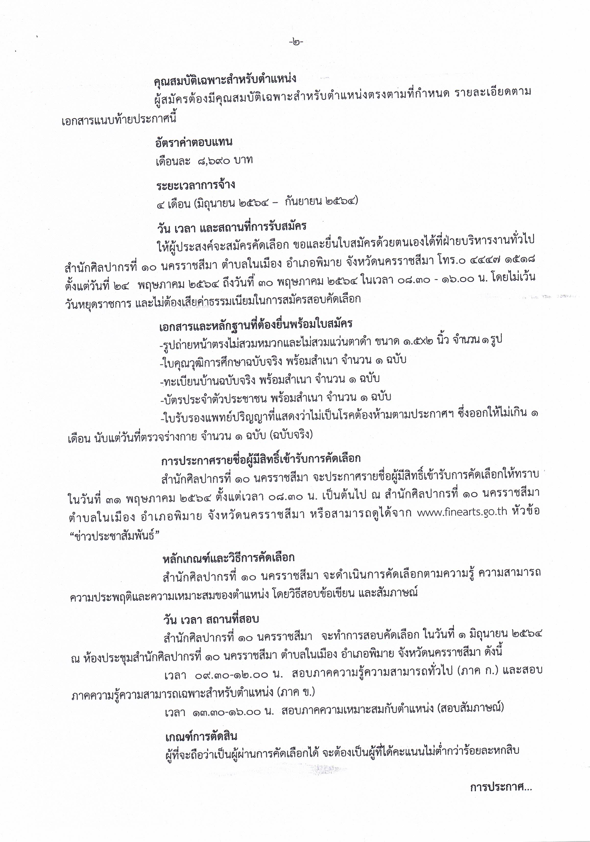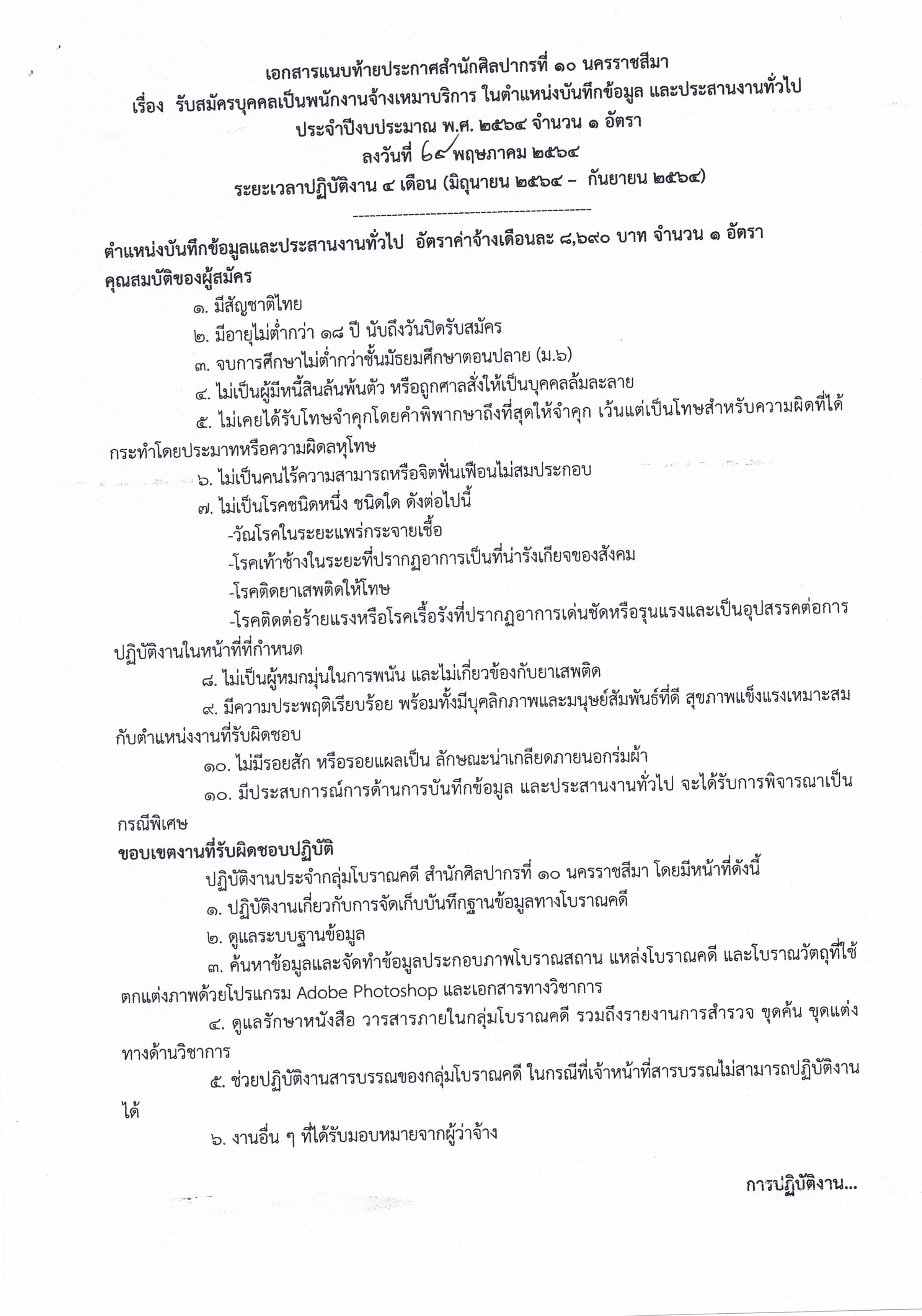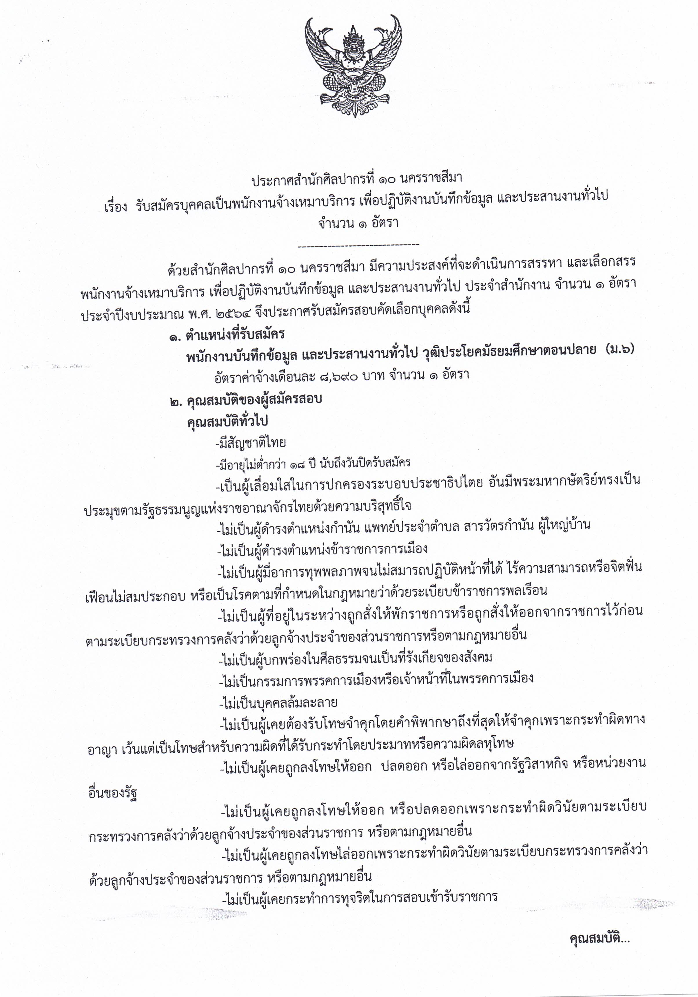 ประกาศสำนักศิลปากรที่ ๑๐ นครราชสีมา เรื่อง รับสมัครบุคคลเป็นพนักงานจ้างเหมาบริการ เพื่อปฏิบัติงานบันทึกข้อมูล และประสานงานทั่วไป จำนวน ๑ อัตรา ประจำปีงบประมาณ พ.ศ. ๒๕๖๔
