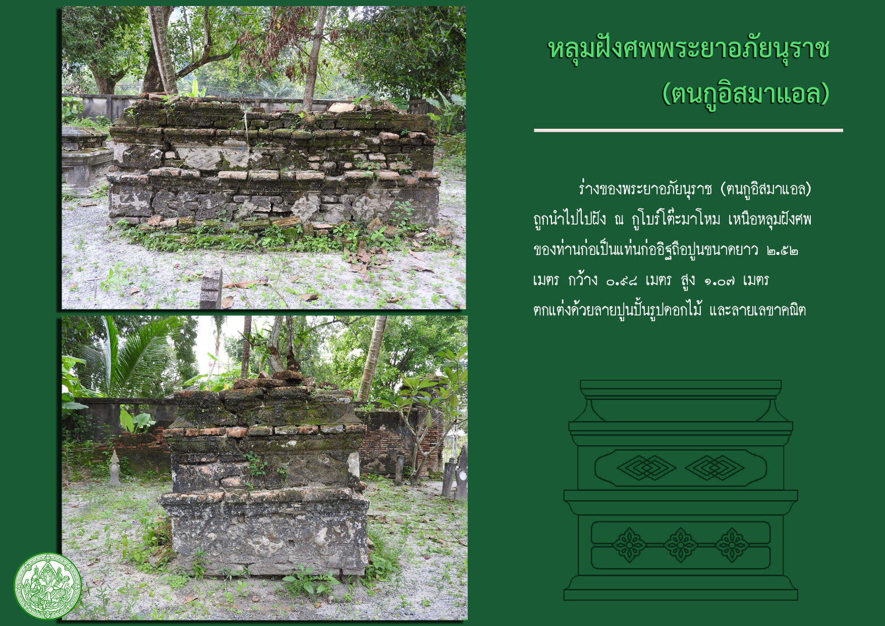 ร่างของพระยาอภัยนุราช (ตนกูอิสมาแอล) ถูกนำไปไปฝัง ณ กูโบร์โต๊ะมาโหม เหนือหลุมฝังศพของท่านก่อเป็นแท่นก่ออิฐถือปูนขนาดยาว ๒.๕๒ เมตร กว้าง ๐.๙๘ เมตร สูง ๑.๐๗ เมตร ตกแต่งด้วยลายปูนปั้นรูปดอกไม้ และลายเลขาคณิต