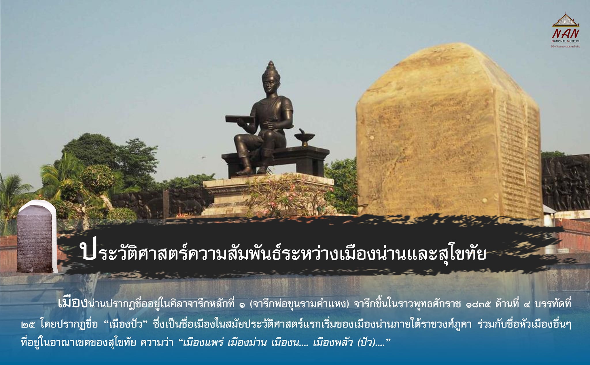 --- เมืองน่านปรากฏชื่ออยู่ในศิลาจารึกหลักที่ ๑ (จารึกพ่อขุนรามคำแหง) จารึกขึ้นในราวพุทธศักราช ๑๘๓๕ ด้านที่ ๔ บรรทัดที่ ๒๕ โดยปรากฏชื่อ “เมืองปัว” ซึ่งเป็นชื่อเมืองในสมัยประวัติศาสตร์แรกเริ่มของเมืองน่านภายใต้ราชวงศ์ภูคา ร่วมกับชื่อหัวเมืองอื่นๆที่อยู่ในอาณาเขตของสุโขทัย ความว่า “เมืองแพร่ เมืองม่าน เมืองน.... เมืองพลัว (ปัว)....”