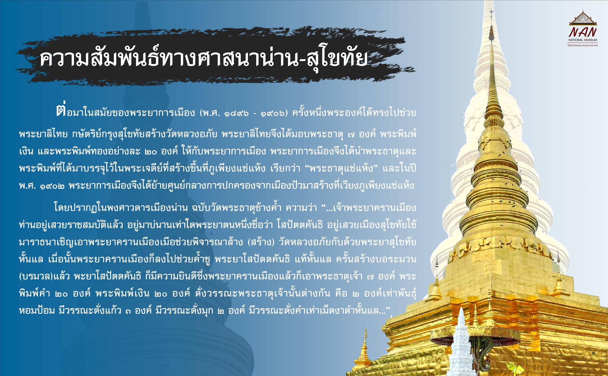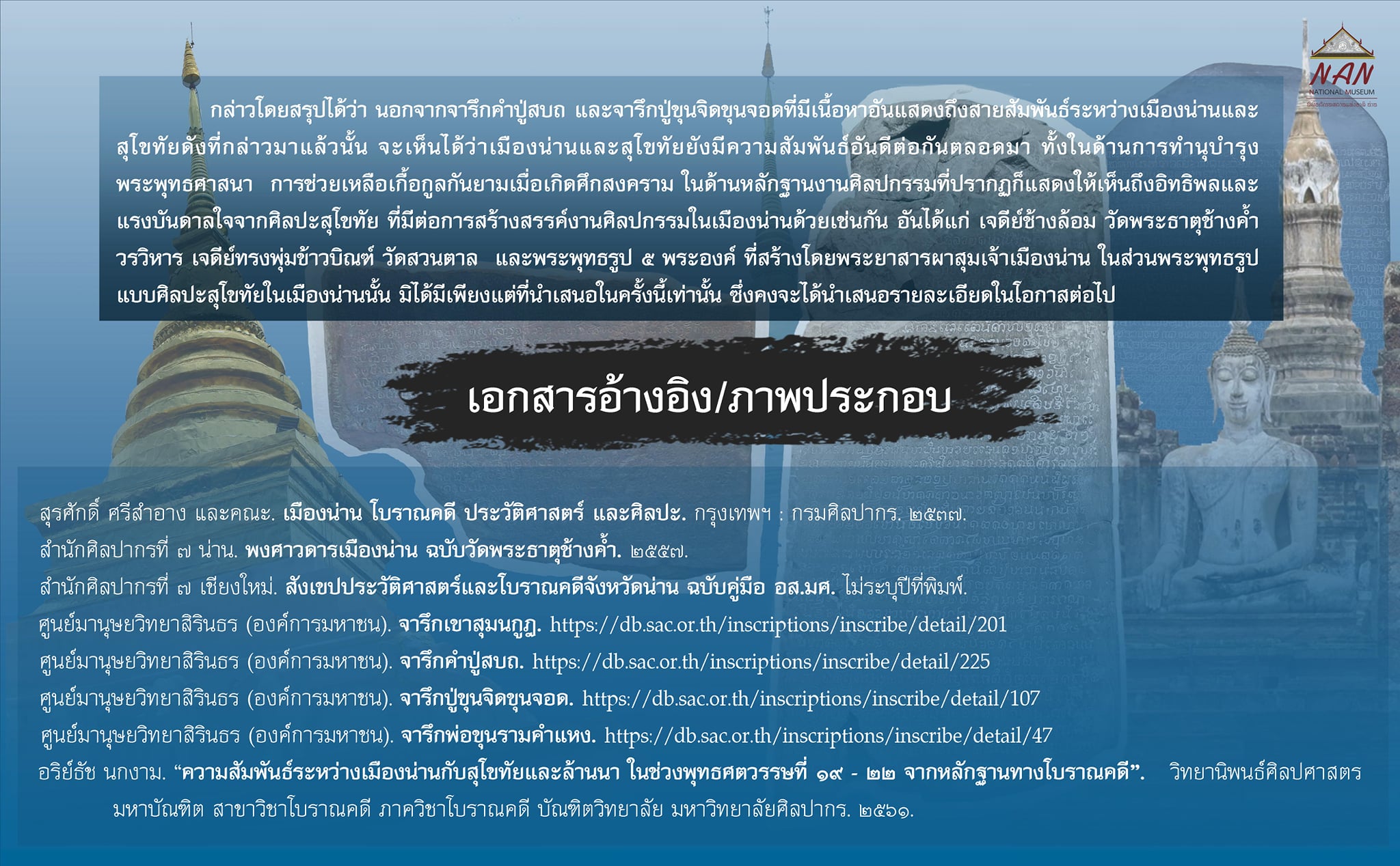 --- กล่าวโดยสรุปได้ว่า นอกจากจารึกคำปู่สบถ และจารึกปู่ขุนจิดขุนจอดที่มีเนื้อหาอันแสดงถึงสายสัมพันธ์ระหว่างเมืองน่านและสุโขทัยดังที่กล่าวมาแล้วนั้น จะเห็นได้ว่าเมืองน่านและสุโขทัยยังมีความสัมพันธ์อันดีต่อกันตลอดมา ทั้งในด้านการทำนุบำรุงพระพุทธศาสนา การช่วยเหลือเกื้อกูลกันยามเมื่อเกิดศึกสงคราม ในด้านหลักฐานงานศิลปกรรมที่ปรากฏก็แสดงให้เห็นถึงอิทธิพลและแรงบันดาลใจจากศิลปะสุโขทัย ที่มีต่อการสร้างสรรค์งานศิลปกรรมในเมืองน่านด้วยเช่นกัน อันได้แก่ เจดีย์ช้างล้อม วัดพระธาตุช้างค้ำวรวิหาร เจดีย์ทรงพุ่มข้าวบิณฑ์ วัดสวนตาล และพระพุทธรูป ๕ พระองค์ ที่สร้างโดยพระยาสารผาสุมเจ้าเมืองน่าน ในส่วนพระพุทธรูปแบบศิลปะสุโขทัยในเมืองน่านนั้น มิได้มีเพียงแต่ที่นำเสนอในครั้งนี้เท่านั้น ซึ่งคงจะได้นำเสนอรายละเอียดในโอกาสต่อไป
