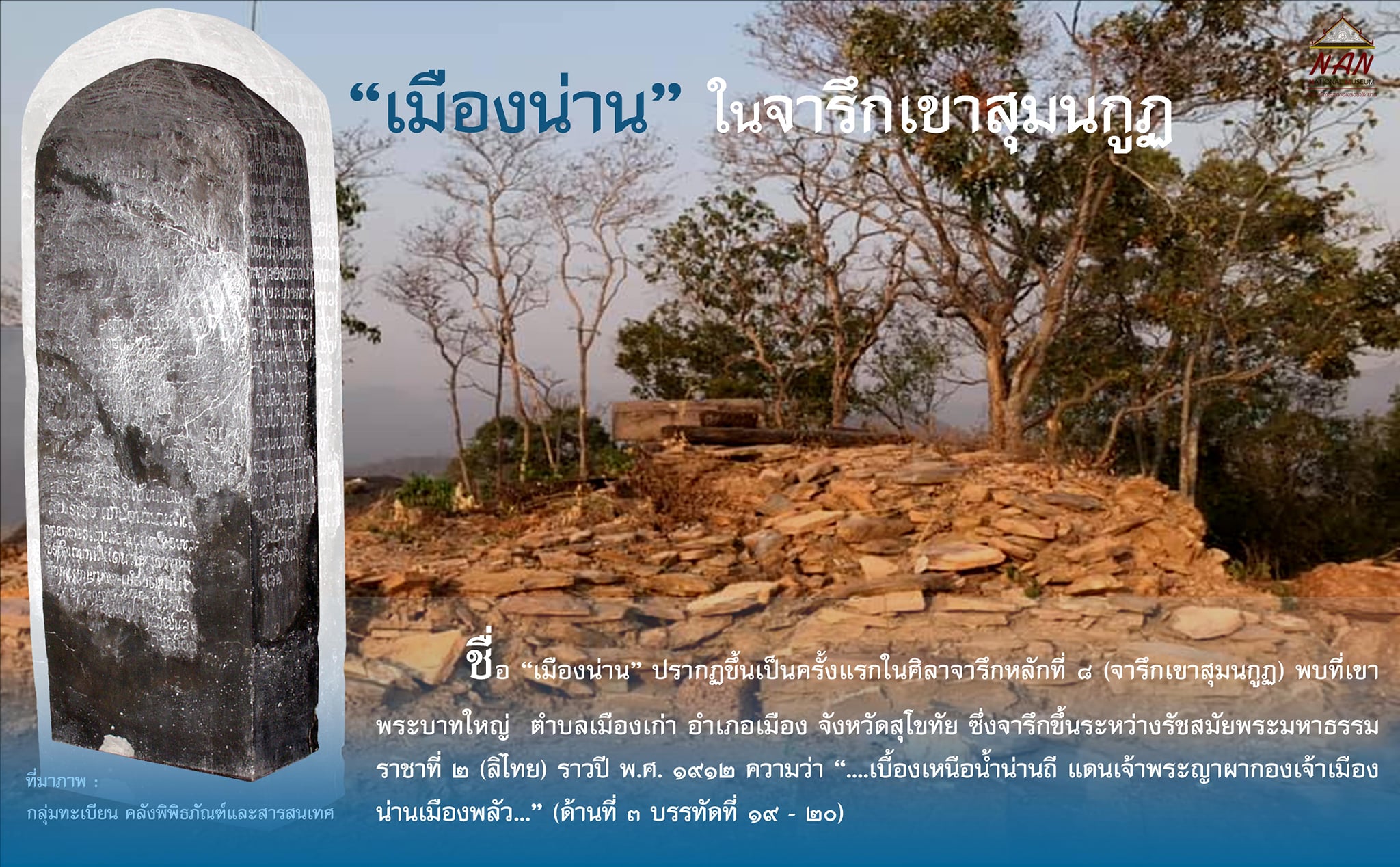 --- ชื่อ “เมืองน่าน” ปรากฏขึ้นเป็นครั้งแรกในศิลาจารึกหลักที่ ๘ (จารึกเขาสุมนกูฏ) พบที่เขาพระบาทใหญ่ ตำบลเมืองเก่า อำเภอเมือง จังหวัดสุโขทัย ซึ่งจารึกขึ้นระหว่างรัชสมัยพระมหาธรรมราชาที่ ๒ (ลิไทย) ราวปี พ.ศ. ๑๙๑๒ ความว่า “....เบื้องเหนือน้ำน่านถี แดนเจ้าพระญาผากองเจ้าเมืองน่านเมืองพลัว...” (ด้านที่ ๓ บรรทัดที่ ๑๙ - ๒๐)