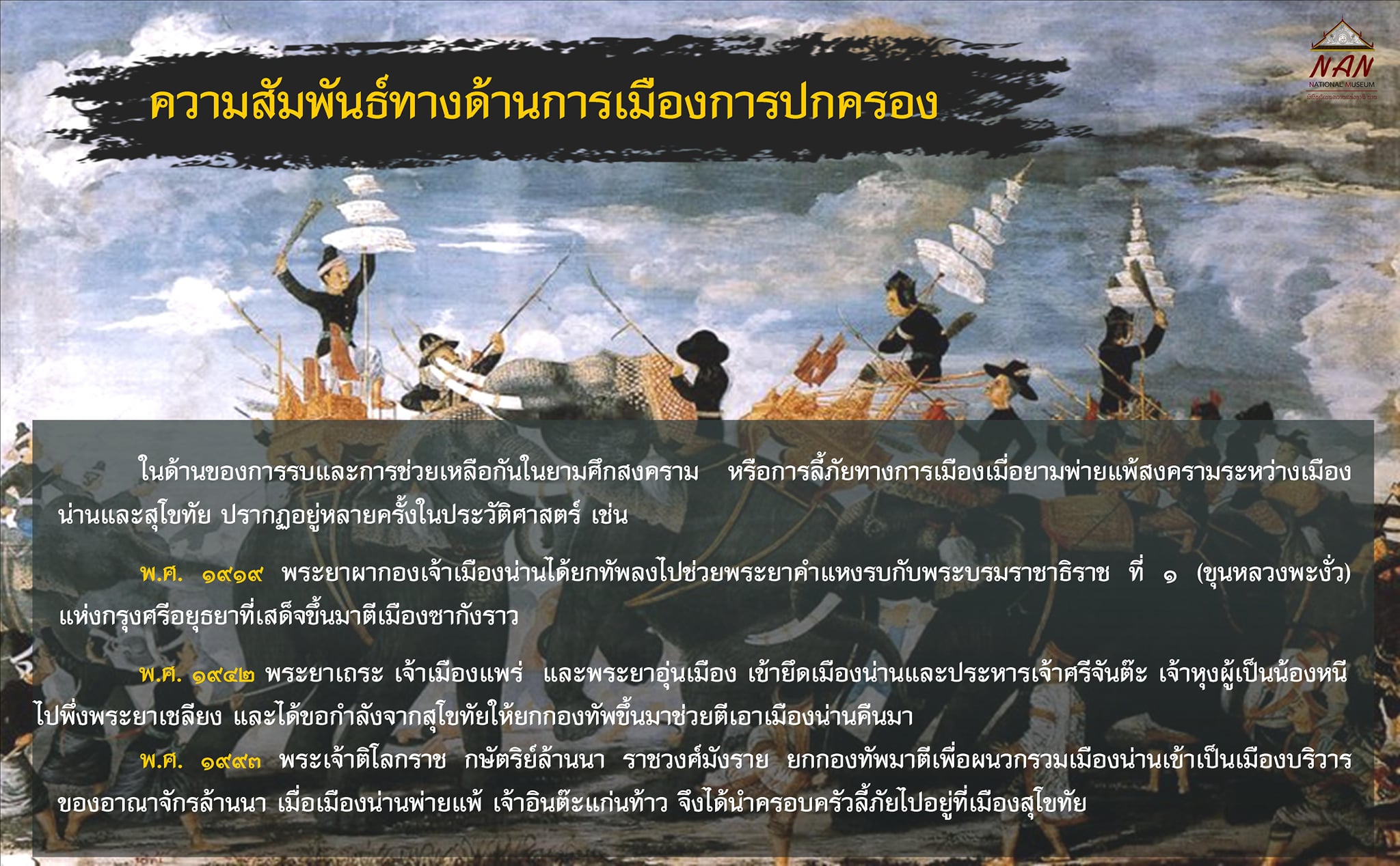 --- ความสัมพันธ์ทางด้านการเมืองการปกครอง ในด้านของการรบและการช่วยเหลือกันในยามศึกสงคราม หรือการลี้ภัยทางการเมืองเมื่อยามพ่ายแพ้สงครามระหว่างเมืองน่านและสุโขทัย ปรากฏอยู่หลายครั้งในประวัติศาสตร์ เช่น