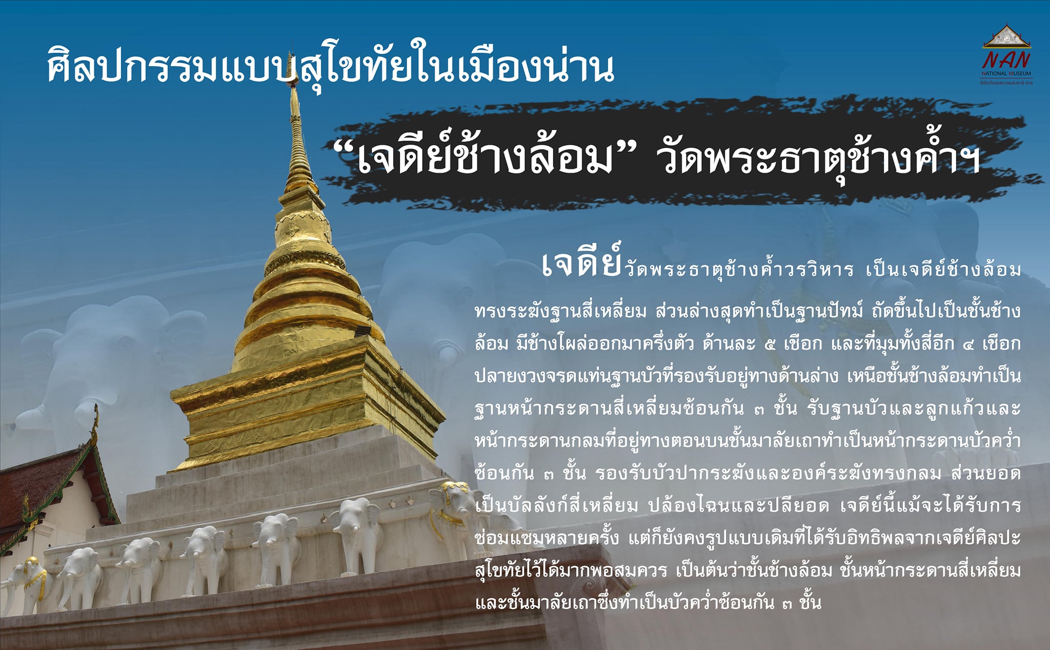 --- งานศิลปกรรมแบบสุโขทัยที่ปรากฏในเมืองน่าน ได้แก่ เจดีย์ช้างล้อม วัดพระธาตุช้างค้ำวรวิหาร เป็นเจดีย์ช้างล้อมทรงระฆังฐานสี่เหลี่ยม ส่วนล่างสุดทำเป็นฐานปัทม์ ถัดขึ้นไปเป็นชั้นช้างล้อม มีช้างโผล่ออกมาครึ่งตัว ด้านละ ๕ เชือก และที่มุมทั้งสี่อีก ๔ เชือก ปลายงวงจรดแท่นฐานบัวที่รองรับอยู่ทางด้านล่าง เหนือชั้นช้างล้อมทำเป็นฐานหน้ากระดานสี่เหลี่ยมซ้อนกัน ๓ ชั้น รับฐานบัวและลูกแก้วและหน้ากระดานกลมที่อยู่ทางตอนบนชั้นมาลัยเถาทำเป็นหน้ากระดานบัวคว่ำซ้อนกัน ๓ ชั้น รองรับบัวปากระฆังและองค์ระฆังทรงกลม ส่วนยอดเป็นบัลลังก์สี่เหลี่ยม ปล้องไฉนและปลียอด เจดีย์นี้แม้จะได้รับการซ่อมแซมหลายครั้ง แต่ก็ยังคงรูปแบบเดิมที่ได้รับอิทธิพลจากเจดีย์ศิลปะสุโขทัยไว้ได้มากพอสมควร เป็นต้นว่าชั้นช้างล้อม ชั้นหน้ากระดานสี่เหลี่ยมและชั้นมาลัยเถาซึ่งทำเป็นบัวคว่ำซ้อนกัน ๓ ชั้น