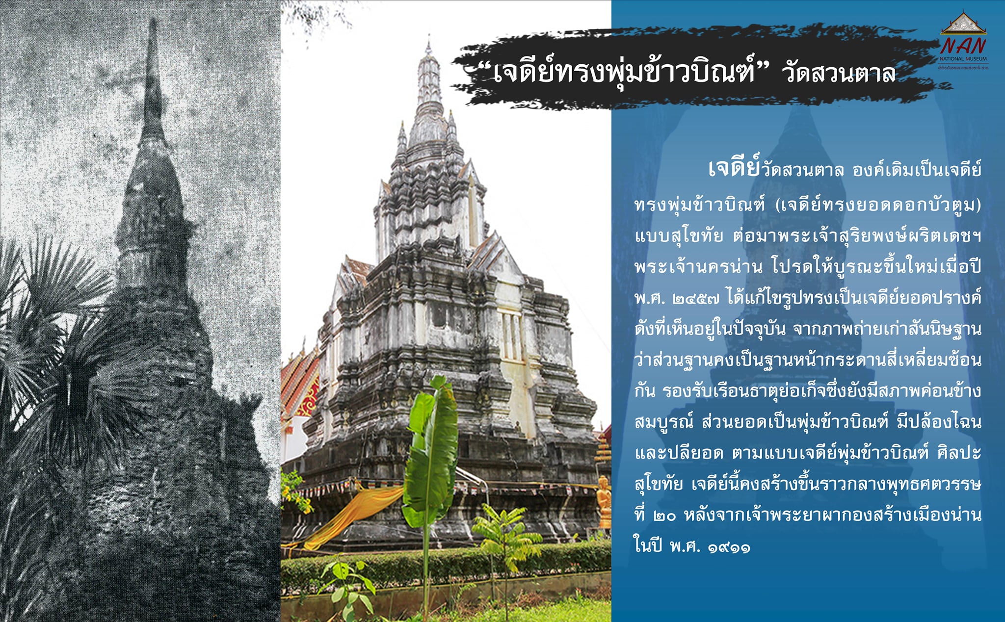 --- เจดีย์วัดสวนตาล องค์เดิมเป็นเจดีย์ทรงพุ่มข้าวบิณฑ์ (เจดีย์ทรงยอดดอกบัวตูม) แบบสุโขทัย ต่อมาพระเจ้าสุริยพงษ์ผริตเดชฯ พระเจ้านครน่าน โปรดให้บูรณะขึ้นใหม่เมื่อปี พ.ศ. ๒๔๕๗ ได้แก้ไขรูปทรงเป็นเจดีย์ยอดปรางค์ดังที่เห็นอยู่ในปัจจุบัน จากภาพถ่ายเก่าสันนิษฐานว่าส่วนฐานคงเป็นฐานหน้ากระดานสี่เหลี่ยมซ้อนกัน รองรับเรือนธาตุย่อเก็จซึ่งยังมีสภาพค่อนข้างสมบูรณ์ ส่วนยอดเป็นพุ่มข้าวบิณฑ์ มีปล้องไฉนและปลียอด ตามแบบเจดีย์พุ่มข้าวบิณฑ์ ศิลปะสุโขทัย เจดีย์นี้คงสร้างขึ้นราวกลางพุทธศตวรรษที่ ๒๐ หลังจากเจ้าพระยาผากองสร้างเมืองน่านในปี พ.ศ. ๑๙๑๑