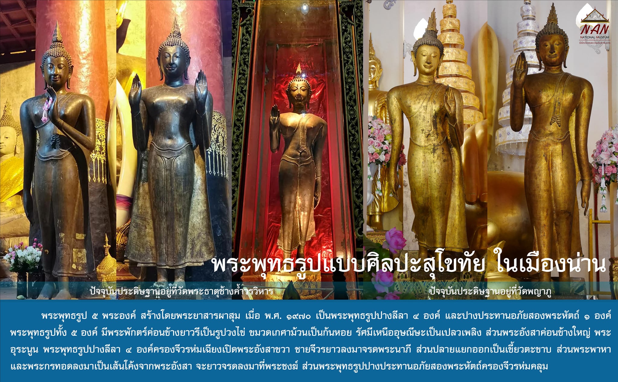 --- พระพุทธรูปแบบศิลปะสุโขทัยในเมืองน่าน เช่น พระพุทธรูป ๕ พระองค์ สร้างโดยพระยาสารผาสุม เมื่อ พ.ศ. ๑๙๗๐ ปัจจุบันประดิษฐานอยู่ที่วัดพระธาตุช้างค้ำฯ ๓ องค์ และวัดพญาภู ๒ องค์ โดยเป็นพระพุทธรูปปางลีลา ๔ องค์ และปางประทานอภัยสองพระหัตถ์ ๑ องค์ พระพุทธรูปทั้ง ๕ องค์ มีพระพักตร์ค่อนข้างยาวรีเป็นรูปวงไข่ ขมวดเกศาม้วนเป็นก้นหอย รัศมีเหนืออุษณีษะเป็นเปลวเพลิง ส่วนพระอังสาค่อนข้างใหญ่ พระอุระนูน พระพุทธรูปปางลีลา ๔ องค์ครองจีวรห่มเฉียงเปิดพระอังสาขวา ชายจีวรยาวลงมาจรดพระนาภี ส่วนปลายแยกออกเป็นเขี้ยวตะขาบ ส่วนพระพาหาและพระกรทอดลงมาเป็นเส้นโค้งจากพระอังสา จะยาวจรดลงมาที่พระชงฆ์ ส่วนพระพุทธรูปปางประทานอภัยสองพระหัตถ์ครองจีวรห่มคลุม