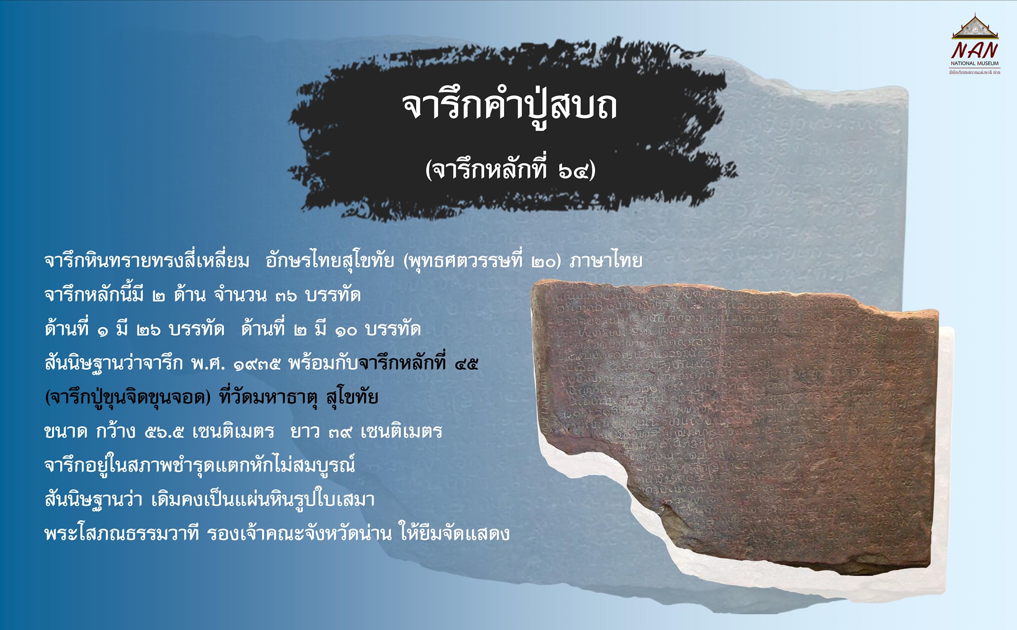 --- จารึกคำปู่สบถ (จารึกหลักที่ ๖๔) ลักษณะเป็นจารึกหินทรายทรงสี่เหลี่ยม อักษรไทยสุโขทัย (พุทธศตวรรษที่ ๒๐) ภาษาไทย จารึกหลักนี้มี ๒ ด้าน จำนวน ๓๖ บรรทัด ด้านที่ ๑ มี ๒๖ บรรทัด ด้านที่ ๒ มี ๑๐ บรรทัด สันนิษฐานว่าจารึก พ.ศ. ๑๙๓๕ พร้อมกับจารึกหลักที่ ๔๕ (จารึกปู่ขุนจิดขุนจอด) ที่วัดมหาธาตุ สุโขทัย มีขนาด กว้าง ๕๖.๕ เซนติเมตร ยาว ๓๙ เซนติเมตร จารึกอยู่ในสภาพชำรุดแตกหักไม่สมบูรณ์ สันนิษฐานว่า เดิมคงเป็นแผ่นหินรูปใบเสมา พระโสภณธรรมวาที รองเจ้าคณะจังหวัดน่าน ให้ยืมจัดแสดง