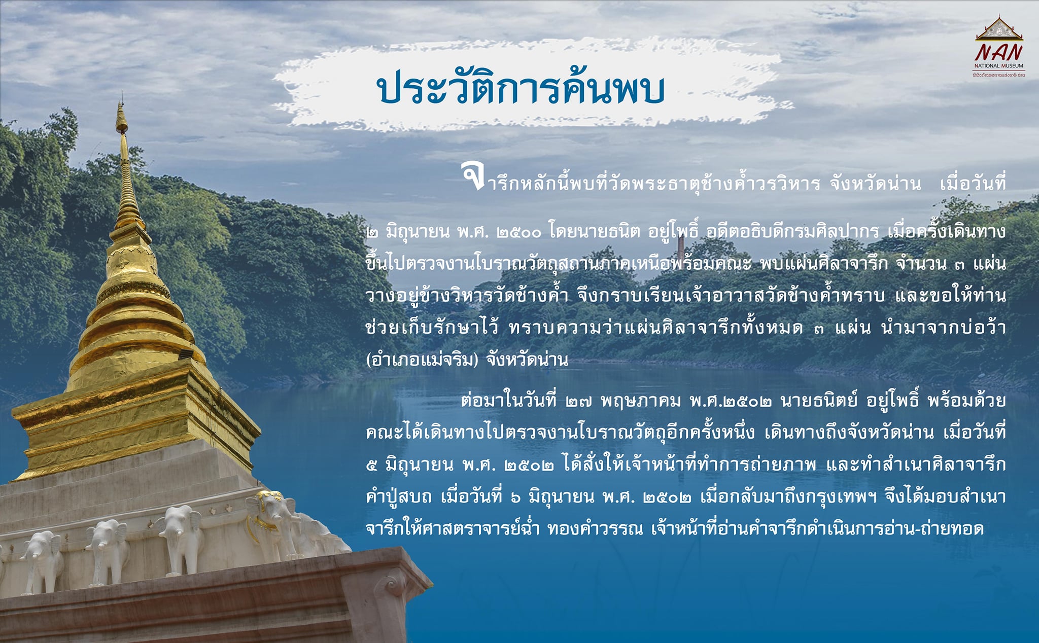 --- จารึกหลักนี้พบที่วัดพระธาตุช้างค้ำวรวิหาร จังหวัดน่าน เมื่อวันที่ ๒ มิถุนายน พ.ศ. ๒๕๐๐ โดยนายธนิต อยู่โพธิ์ อดีตอธิบดีกรมศิลปากร เมื่อครั้งเดินทางขึ้นไปตรวจงานโบราณวัตถุสถานภาคเหนือพร้อมคณะ พบแผ่นศิลาจารึก จำนวน ๓ แผ่น วางอยู่ข้างวิหารวัดช้างค้ำ จึงกราบเรียนเจ้าอาวาสวัดช้างค้ำทราบ และขอให้ท่านช่วยเก็บรักษาไว้ ทราบความว่าแผ่นศิลาจารึกทั้งหมด ๓ แผ่น นำมาจากบ่อว้า (อำเภอแม่จริม) จังหวัดน่าน