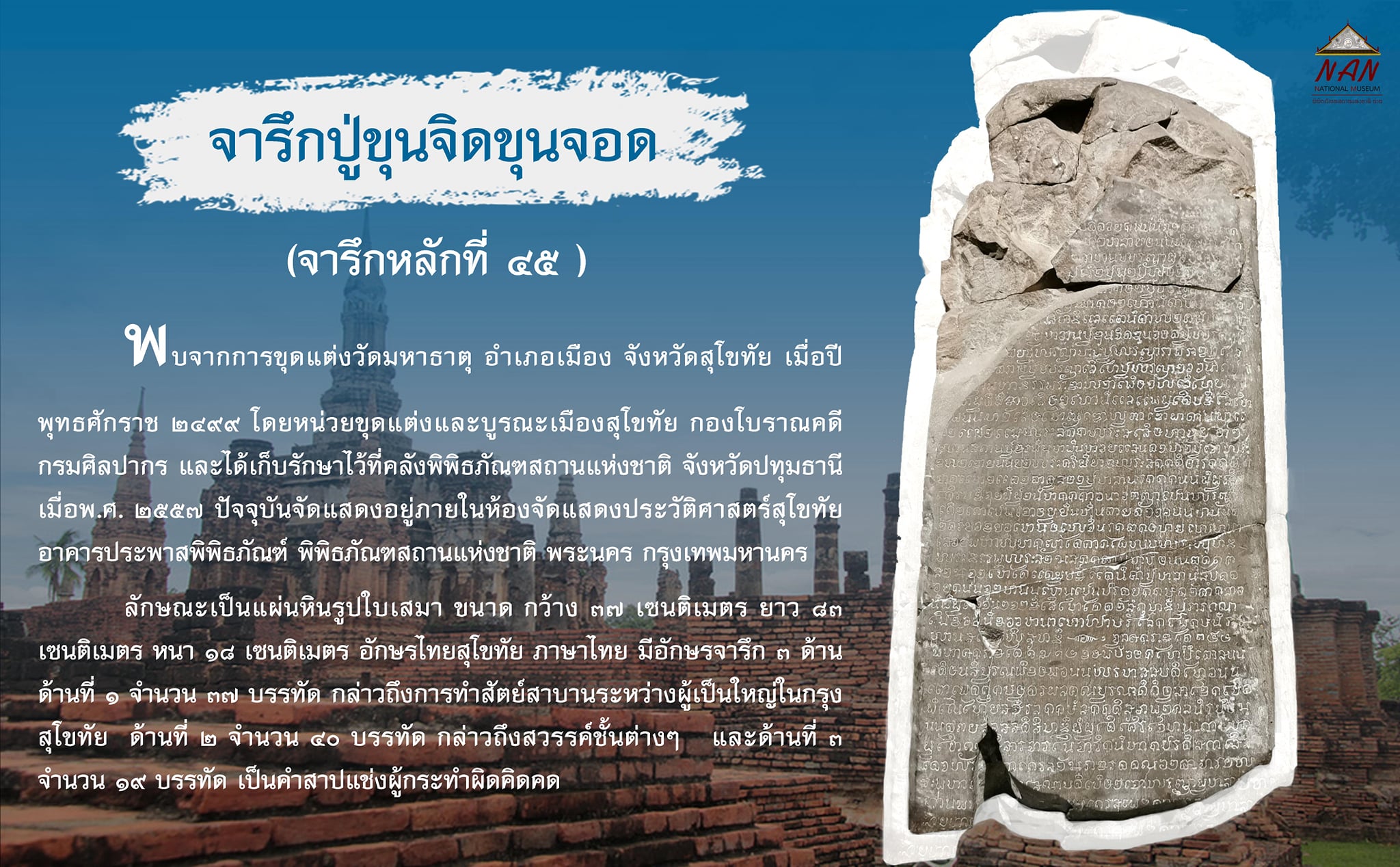 --- จารึกปู่ขุนจิดขุนจอด (จารึกหลักที่ ๔๕) พบจากการขุดแต่งวัดมหาธาตุ อำเภอเมือง จังหวัดสุโขทัย เมื่อปีพุทธศักราช ๒๔๙๙ โดยหน่วยขุดแต่งและบูรณะเมืองสุโขทัย กองโบราณคดี กรมศิลปากร และได้เก็บรักษาไว้ที่คลังพิพิธภัณฑสถานแห่งชาติ จังหวัดปทุมธานี เมื่อพ.ศ. ๒๕๕๗ ปัจจุบันจัดแสดงอยู่ภายในห้องจัดแสดงประวัติศาสตร์สุโขทัย อาคารประพาสพิพิธภัณฑ์ พิพิธภัณฑสถานแห่งชาติ พระนคร กรุงเทพมหานคร