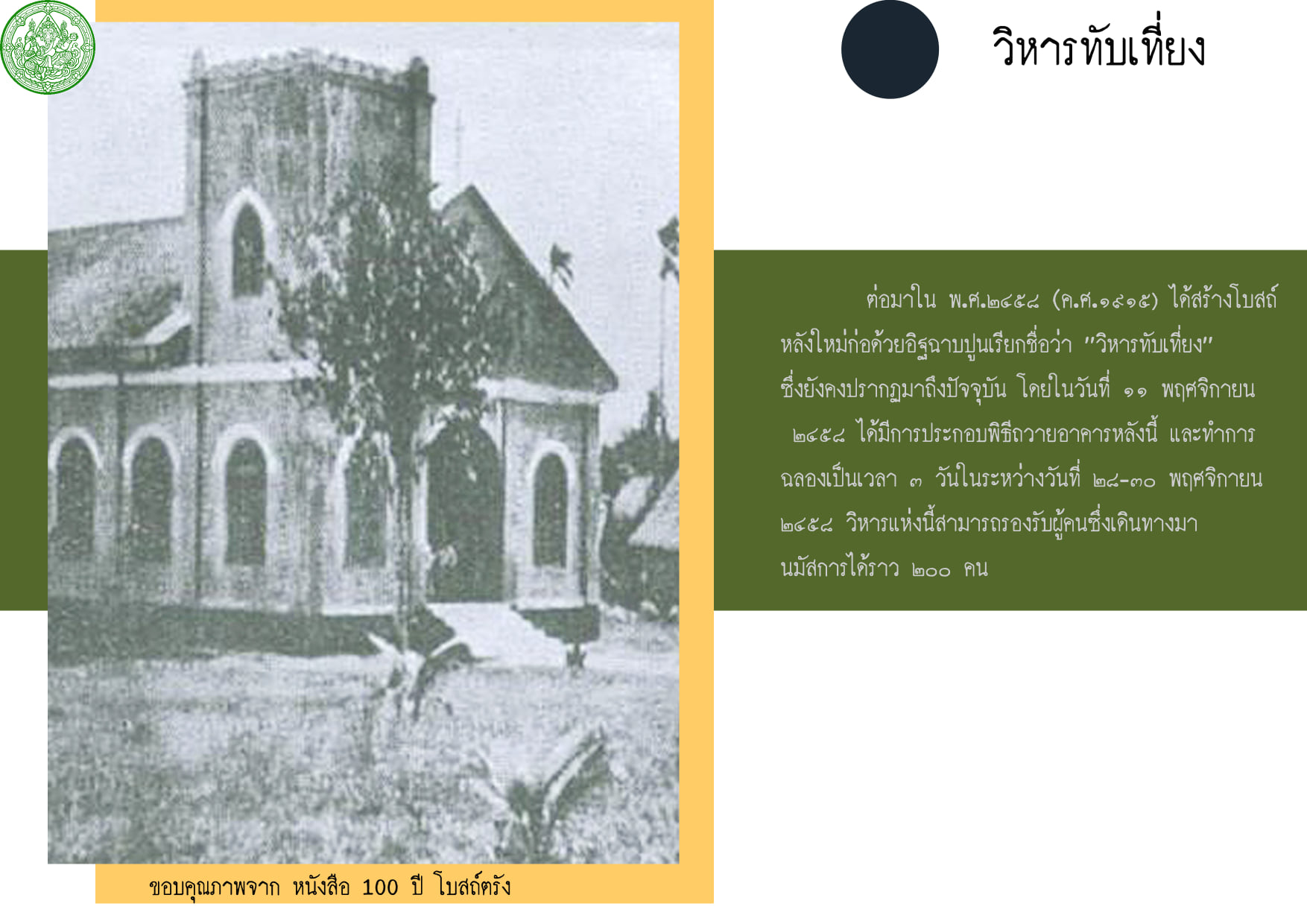 ต่อมาใน พ.ศ.๒๔๕๘ (ค.ศ.๑๙๑๕) ได้สร้างโบสถ์หลังใหม่ก่อด้วยอิฐฉาบปูนเรียกชื่อว่า “วิหารทับเที่ยง” ซึ่งยังคงปรากฏมาถึงปัจจุบัน โดยในวันที่ ๑๑ พฤศจิกายน ๒๔๕๘ ได้มีการประกอบพิธีถวายอาคารหลังนี้ และทำการการฉลองเป็นเวลา ๓ วันในระหว่างวันที่ ๒๘-๓๐ พฤศจิกายน ๒๔๕๘ วิหารแห่งนี้สามารถรองรับผู้คนซึ่งเดินทางมานมัสการได้ราว ๒๐๐ คน