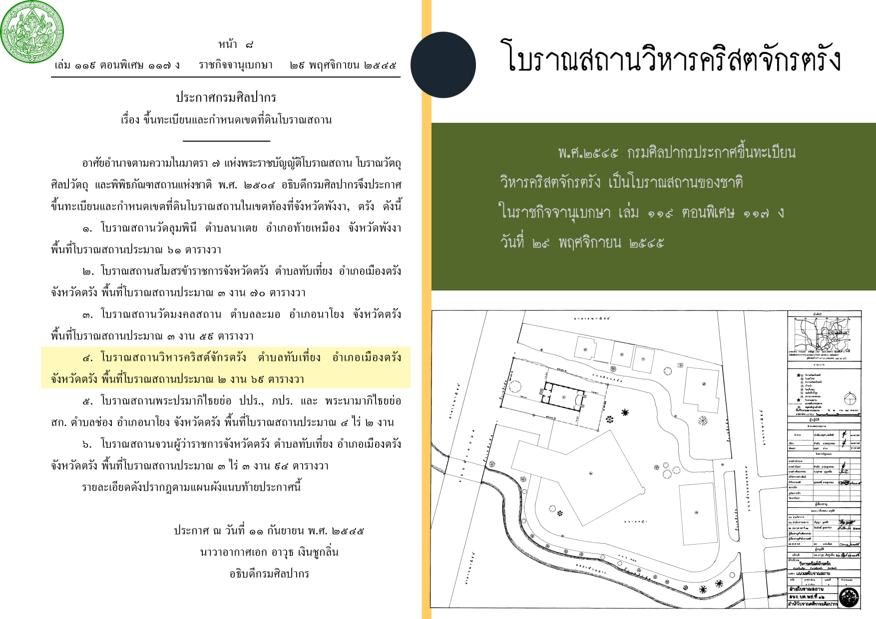 พ.ศ.๒๕๔๕ กรมศิลปากรประกาศขึ้นทะเบียนวิหารคริสตจักรตรัง เป็นโบราณสถานของชาติ ในราชกิจจานุเบกษา เล่ม ๑๑๙ ตอนพิเศษ ๑๑๗ ง วันที่ ๒๙ พฤศจิกายน ๒๕๔๕
