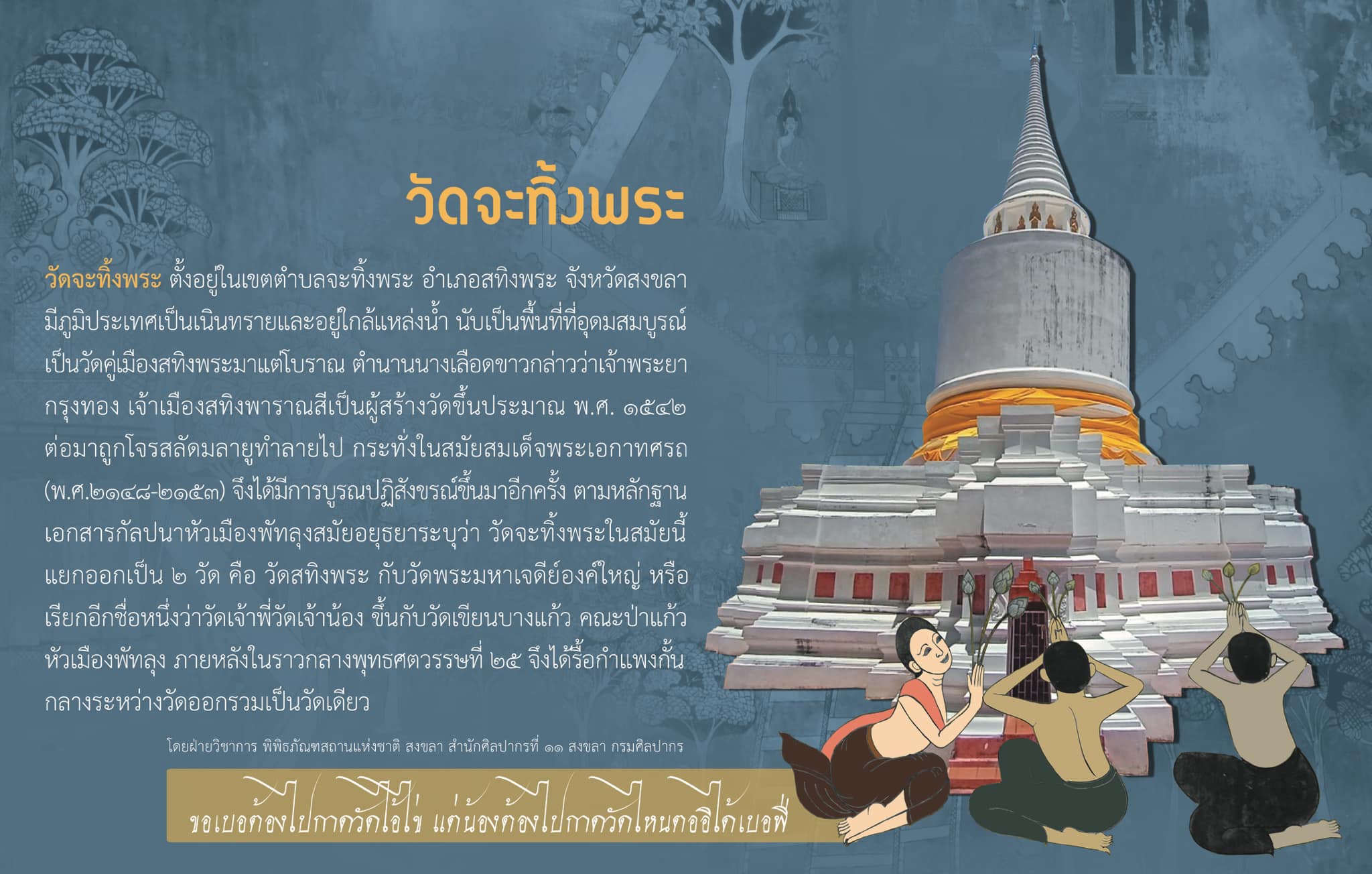 ภาพที่พิพิธภัณฑสถานแห่งชาติ สงขลา นำมาใช้ประชาสัมพันธ์ เป็นภาพจำลองมาจากจิตรกรรมฝาผนังภายในวิหารพระพุทธไสยาสน์ หรือวิหารพ่อเฒ่านอน วัดจะทิ้งพระ อำเภอสทิงพระ จังหวัดสงขลา