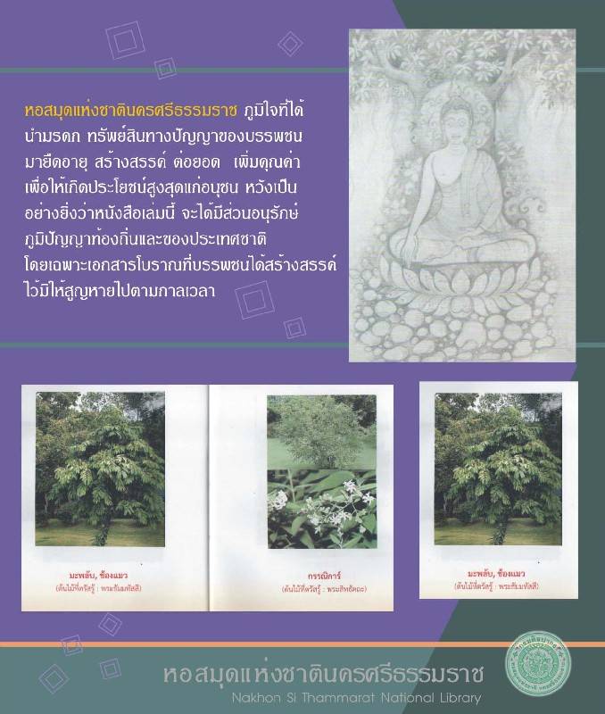 หอสมุดแห่งชาตินครศรีธรรมราช ภาคภูมิใจที่ได้นำมรดก ทรัพย์สินทางปัญญาของบรรพชนมายืดอายุ สร้างสรรค์ ต่อยอด เพิ่มคุณค่า เพื่อให้เกิดประโยชน์สูงสุดแก่อนุชน หวังเป็นอย่างยิ่งว่าหนังสือเล่มนี้ จะได้มีส่วนช่วยปกป้อง คุ้มครอง อนุรักษ์ภูมิปัญญาท้องถิ่นและของประเทศชาติโดยเฉพาะเอกสารโบราณที่บรรพชนได้สร้างสรรค์ไว้มิให้สูญหายไปตามกาลเวลา