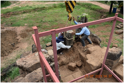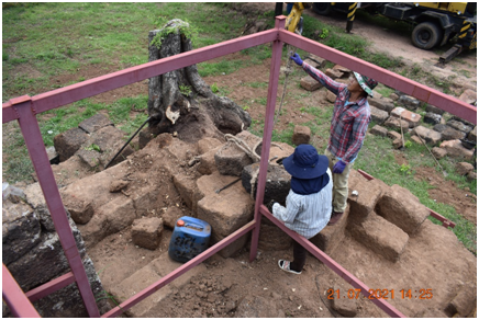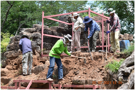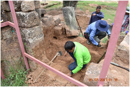 - ดำเนินการขุดลอกหน้าดินบนตัวปรางค์ด้านทิศตะวันตก ให้เห็นหินก้อนล่างที่เป็นส่วนประกอบหลัก