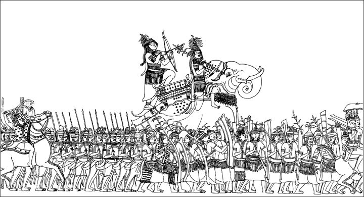 ภาพ ลายเส้นจากสลักหินบนระเบียงปราสาทนครวัด ถอดแบบภาพ โดย อาจารย์คงศักดิ์ กุลกลางดอน คณะจิตรกรรมประติมากรรมและภาพพิมพ์ มหาวิทยาลัยศิลปากร
