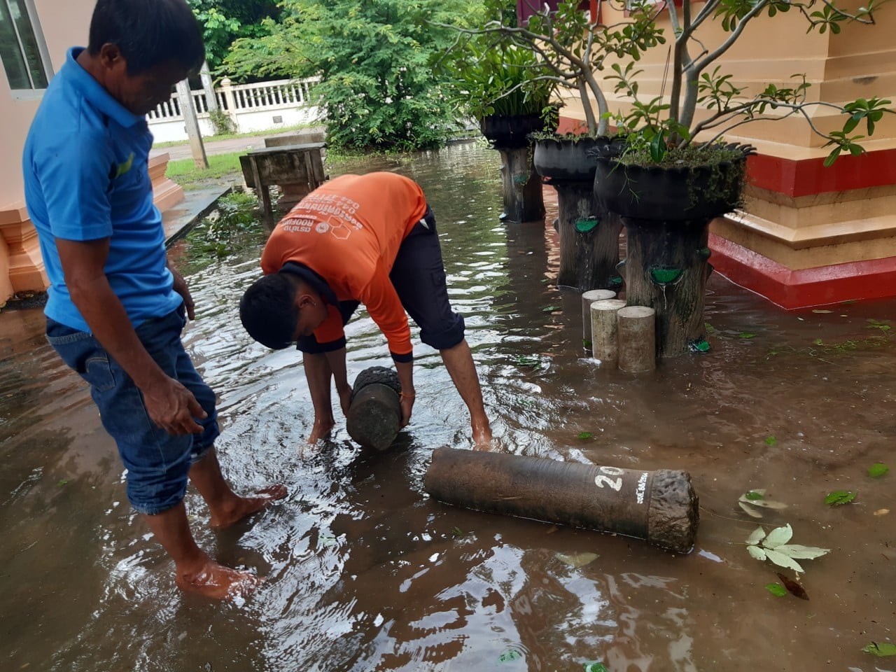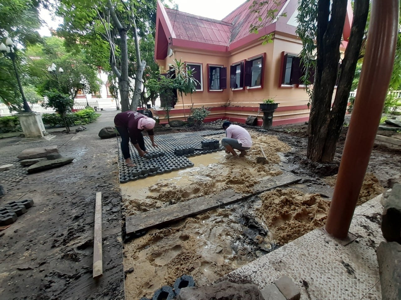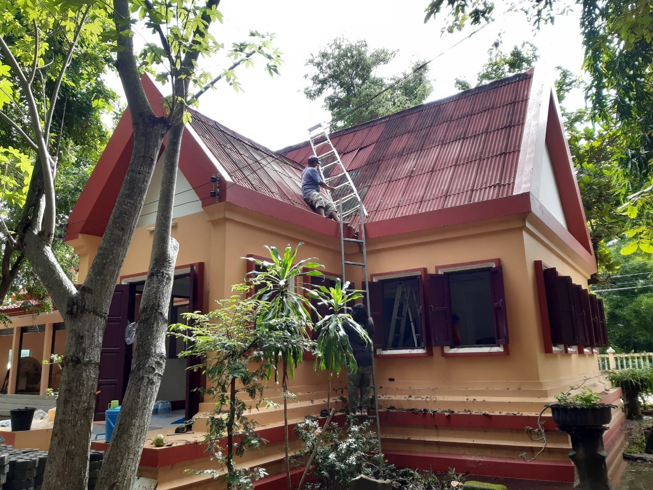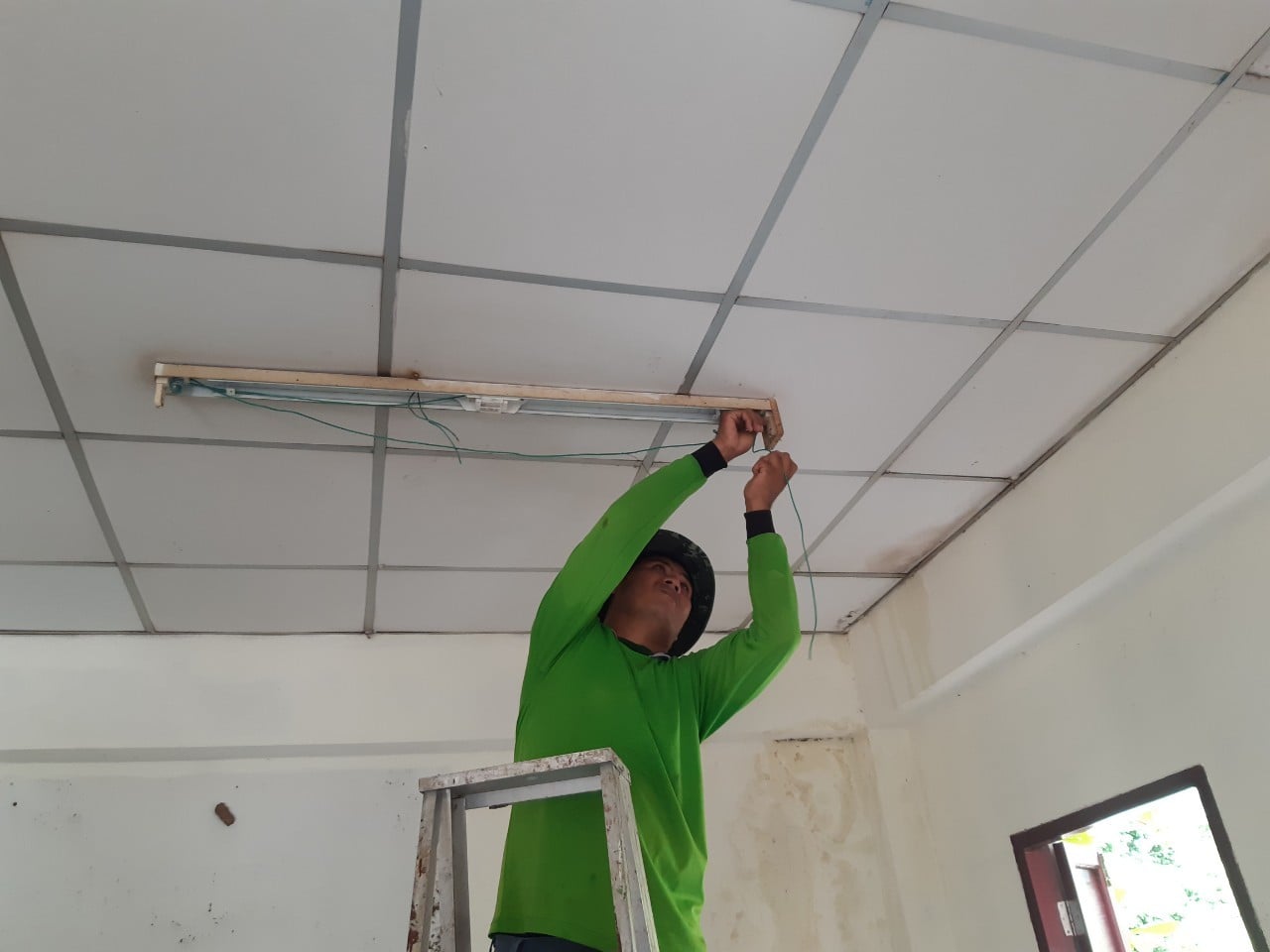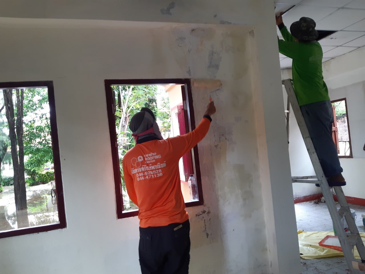 -ดำเนินการปรับปรุงภายอาคาร งานฝ้าเพดาน ถอดรื้อฝ้าแผ่นเรียบลงมาเพื่อดำเนินการซ่อมแซมทาสีใหม่ บางแผ่นทำการเปลี่ยนใหม่ แล้วนำติดตั้งกลับที่เดิมแล้วเสร็จ