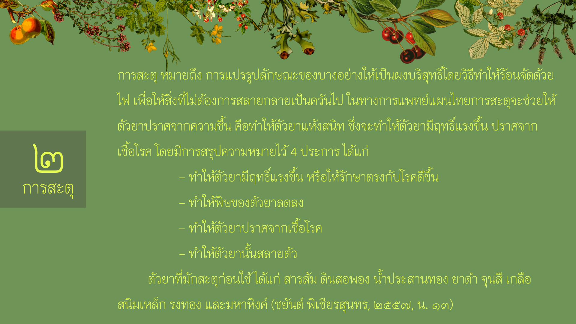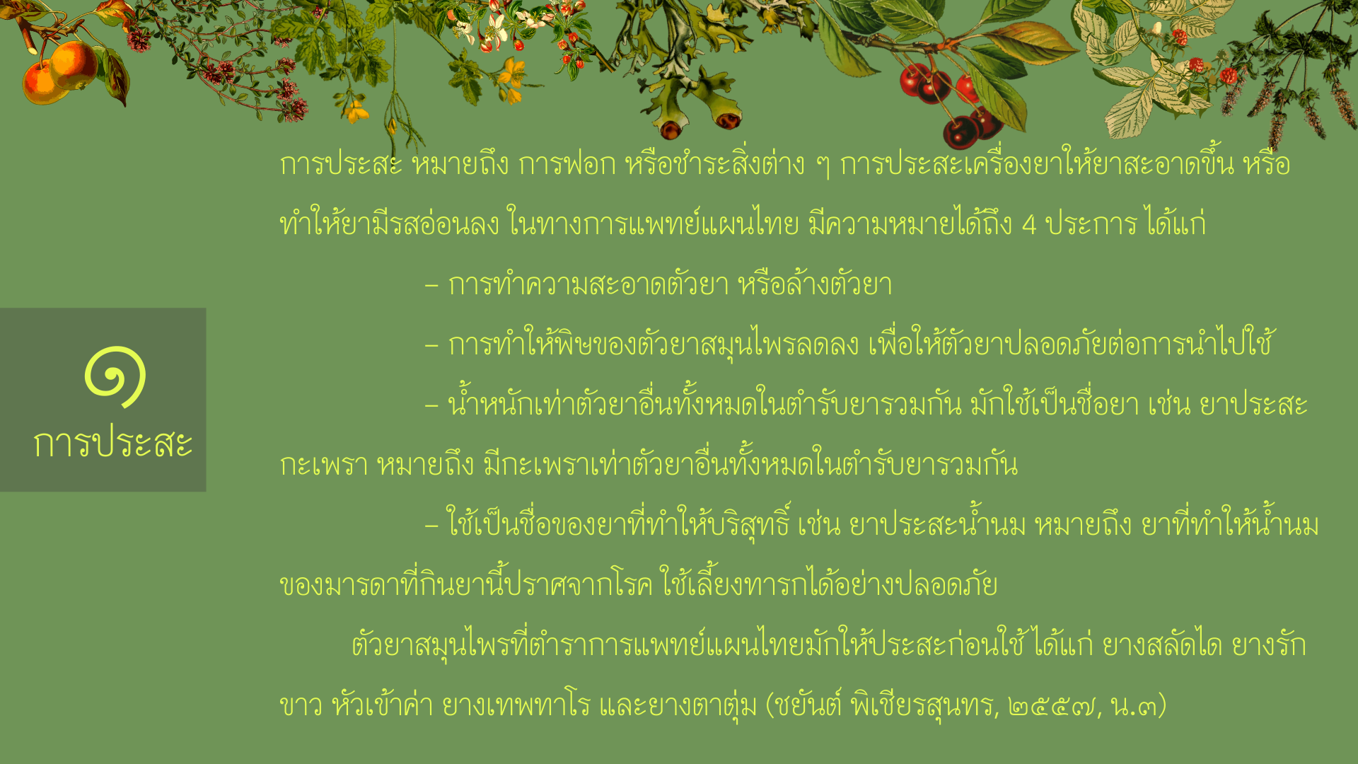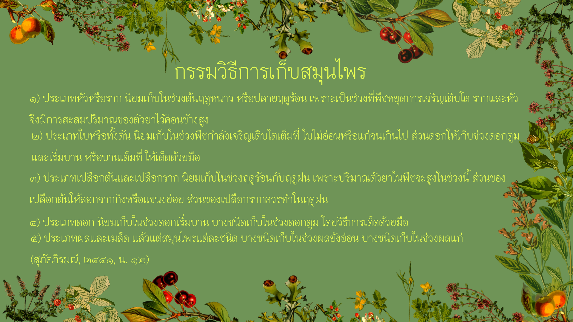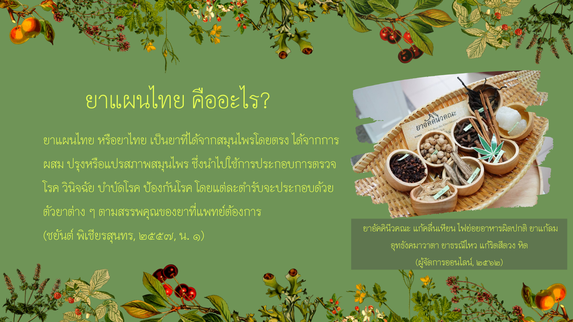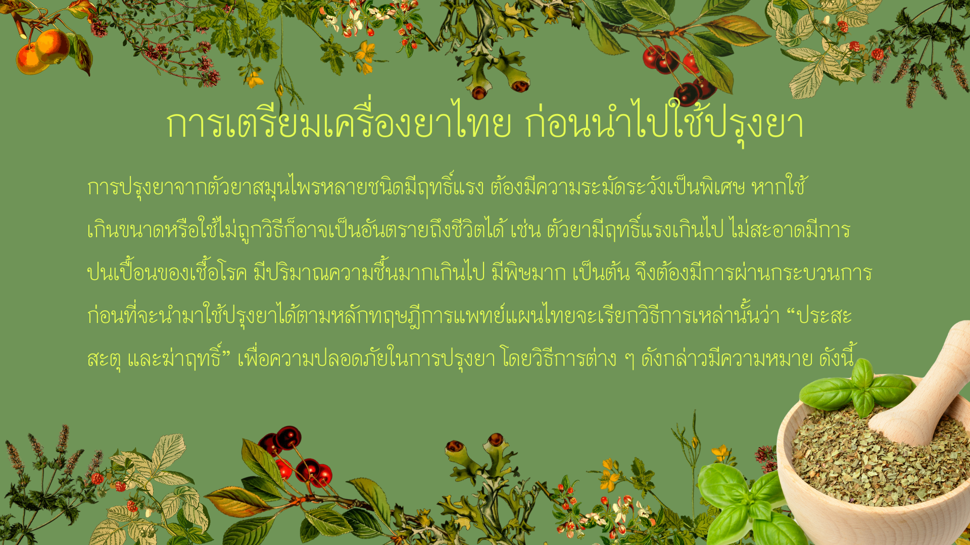 เรื่อง “ยาแผนไทย” : กรรมวิธีการแปรสภาพและเก็บสมุนไพร ตลอดจนการเตรียมเครื่องยาในการ ผลิตยาสมุนไพรไทยอย่างถูกวิธี