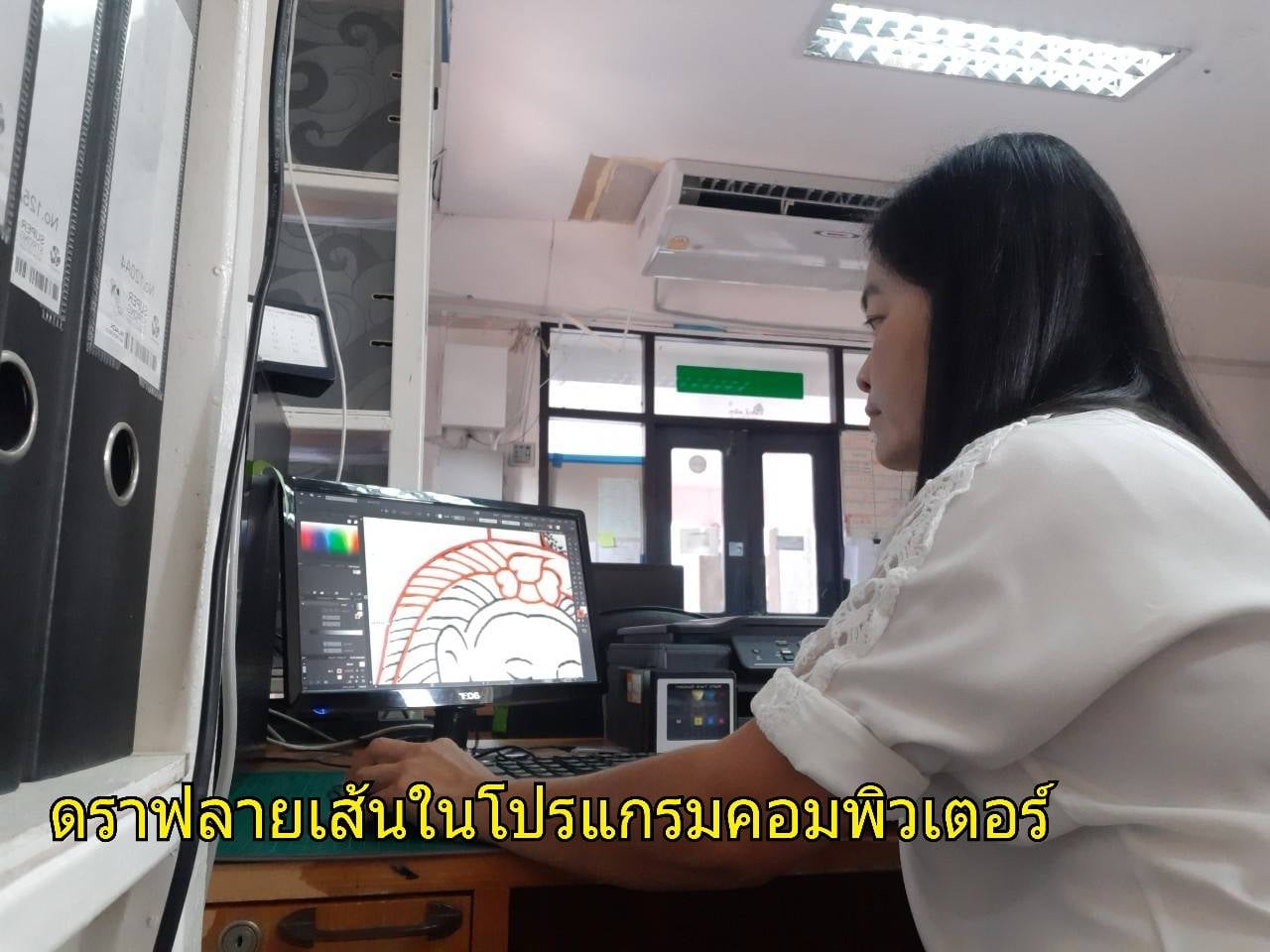 ๗. นำภาพผลงานการวาดลายเส้นลวดลายใบเสมาที่เติมเต็มให้สมบูรณ์ มาดำเนินการวาดเส้นในโปรแกรมคอมพิวเตอร์ Illustrator เพื่อให้สามารถนำไปใช้งานได้หลากหลายต่อไป