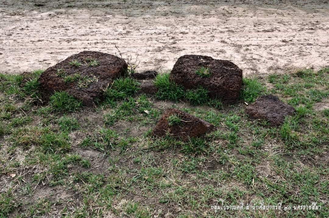 บนพื้นเนินดินพบชิ้นส่วนภาชนะดินเผาแบบเครื่องถ้วยเขมรกระจายอยู่เบาบางโดยทั่วไป และยังพบก้อนหินศิลาแลงที่ตัดเป็นก้อนสำหรับก่อสร้างอาคาร มีขนาดประมาณ 80X65X36 เซนติเมตร วางตัวกระจายอยู่ชายเนินด้านตะวันตกและทิศใต้แต่ไม่เรียงกันเป็นฐานอาคาร ก้อนศิลาแลงสี่เหลี่ยมกระจายอยู่ทางด้านทิศตะวันออกที่ถูกขยับมาวางทิ้งไว้ที่คันนาห่างออกจากเนินดินประมาณ 20 เมตร พบชิ้นส่วนแท่นหินบดยา 1 ชิ้นอยู่บนเนินดิน ไม่พบโบราณวัตถุอื่นในพื้นที่นาที่อยู่โดยรอบ แต่เดิมเป็นพื้นที่ป่า ต่อมาจับจองเป็นพื้นที่ทำการเกษตรและปรับพื้นที่เป็นที่นาเมื่อประมาณ 20 ปีมาแล้ว จึงมีการไถปรับพื้นที่ทำให้พื้นที่เนินดินหดเล็กลงเรื่องๆ ชาวบ้านเล่าว่า เท่าที่จำได้เดิมเนินดินนี้ มีขนาด 2 งาน เเต่ถูกไถปรับจนเหลือเท่าที่เห็นในปัจจุบัน ก้อนหินที่พบเกิดจากการไถและดุนมากองรวมกัน มีก้อนหินแลงบางส่วนนำไปไว้ที่วัดทุ่งสว่างนารุ่ง ตำบลนารุ่ง อำเภอศีขรภูมิ ที่อยู่ใกล้เคียงกัน