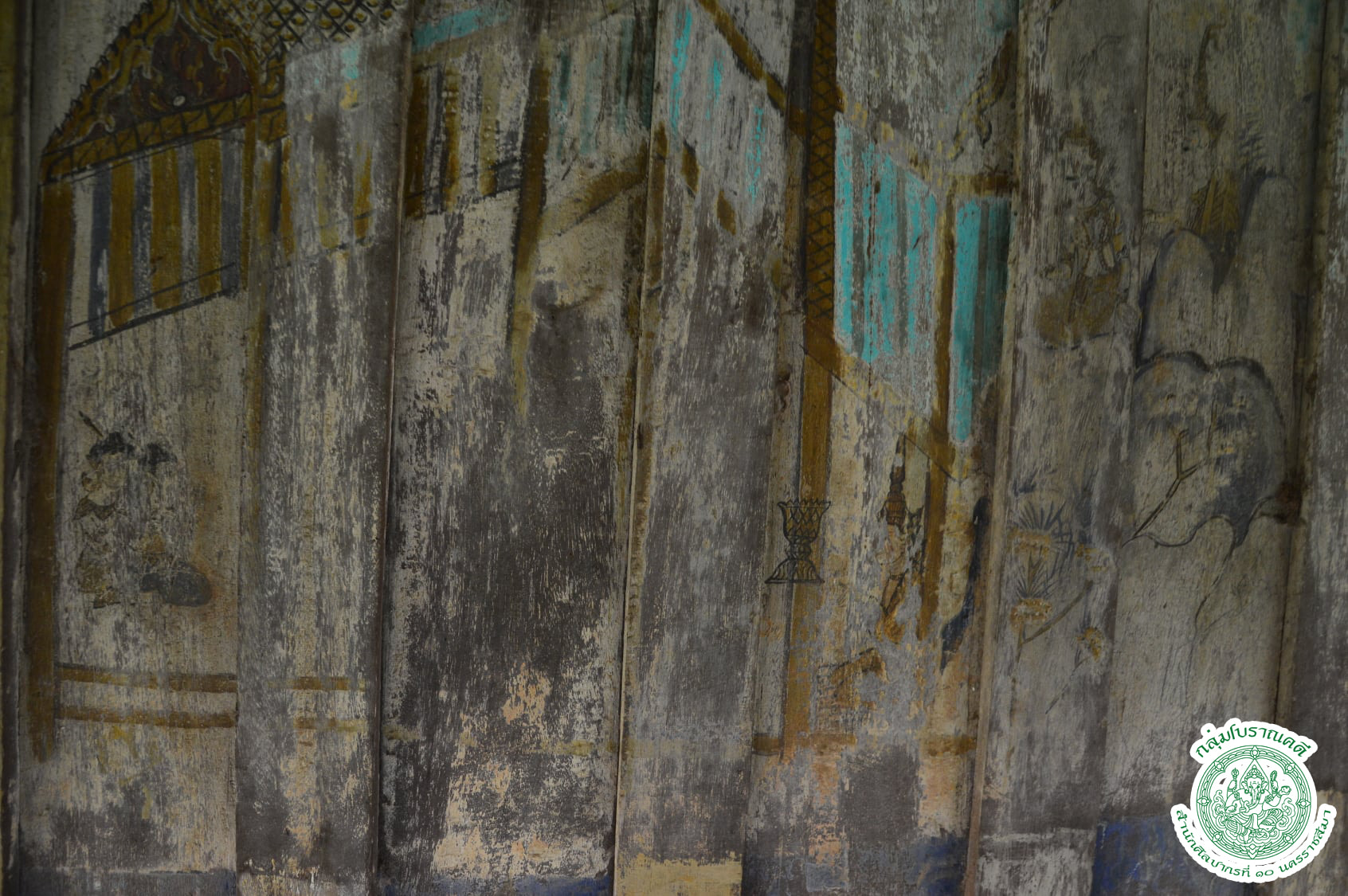 จิตรกรรมแบ่งออกเป็นสองตอนคือตอนบนจะเขียนภาพเล่าเรื่อง จากการสำรวจน่าจะเป็นเรื่องในเวสสันดรชาดกและตอนล่างเขียนเป็นภาพเทวดาและลายผูก โดยเขียนตลอดแนวผนังทั้งสี่ด้าน แต่ด้านในไม่มีภาพเขียน ผนังอาคารทั้งสี่ด้านยังคงสภาพดีอยู่ มีร่องรอยสะพานจมอยู่ในน้ำทางด้านทิศเหนือ หลังคาเป็นทรงจั่วสองชั้นมุงด้วยสังกะสี แต่เดิมเป็นไม้แป้นเกล็ด ที่หน้าบันมีร่องรอยการและสลักไม้และเขียนสีประดับแต่ภาพลบเลือนไปเกือบหมดแล้ว