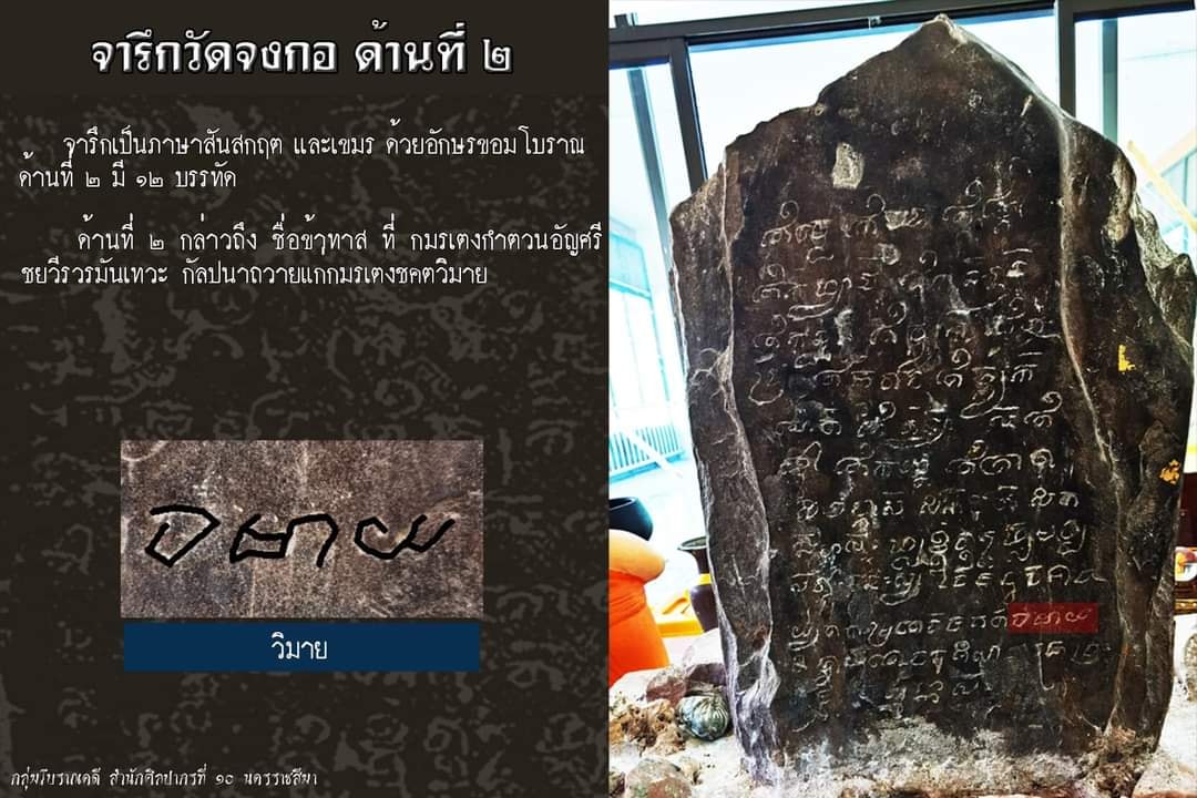 #จารึกวัดจงกอ เป็น จารึกหินทราย สลักด้วยอักษรขอมโบราณ ภาษาสันสกฤตและภาษาเขมร ข้อความกล่าวถึง ธุลีพระบาทกมรเตงกำตวนอัญศรีชยวีรวรมันเทวะ (พระเจ้าชัยวีรวรมัน) มีพระบรมราชโองการ ให้ดำเนินการรังวัดและปักเขตที่ดิน เพื่อกัลปนาพร้อมด้วยข้าทาส ถวายแด่ #กมรเตงชคตวิมาย ระบุ มหาศักราช 930 ซึ่งตรงกับปี พ.ศ. 1551 ซึ่งนับเป็นจารึกที่เอ่ยถึง “วิมายฺ” หรือ “พิมาย” ที่เก่าแก่ที่พบอยู่ในปัจจุบัน