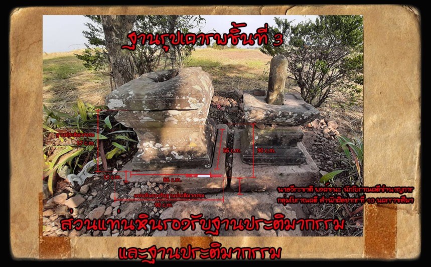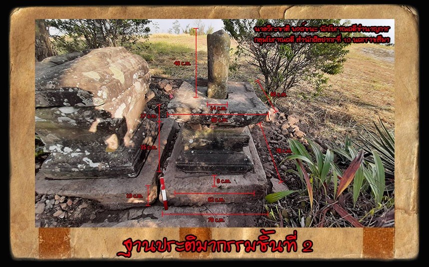 1.1 #ฐานรูปเคารพชิ้นที่1 พบเฉพาะส่วนแท่นหินรองรับฐานประติมากรรม เรียกว่า “ปีฐะ” หรือ “ปิณฑิกา” ลักษณะรูปทรงสี่เหลี่ยมจัตุรัส จำนวน 1 ฐาน สภาพแท่นหินรองรับฐานประติมากรรมชำรุด ส่วนขอบแตกหักหายไป