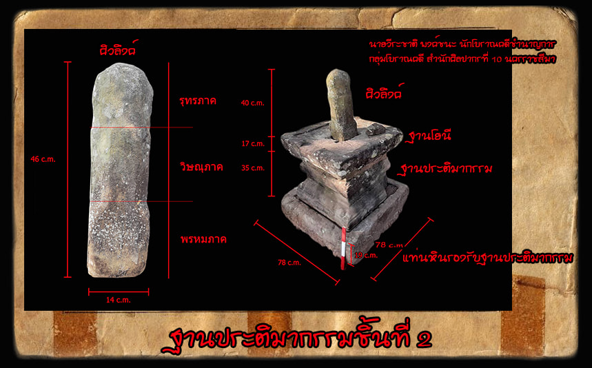 1.2.4 ส่วนศิวลึงค์ รูปทรงกระบอก สภาพด้านชำรุดหายไปบางส่วน สภาพปัจจุบันศิวลึงค์ แบ่งออก 3 ส่วน ได้แก่ ส่วนฐานสี่เหลี่ยมจัตุรัส เรียกว่า “พรหมภาค” ส่วนกลางรูปทรงแปดเหลี่ยม เรียกว่า “วิษณุภาค”เส้นแบ่งด้านค่อนข้างลบเลือน ส่วนบนรูปทรงกระบอก เรียกว่า “รุทรภาค” ส่วนปลายชำรุดหายไปบางส่วน