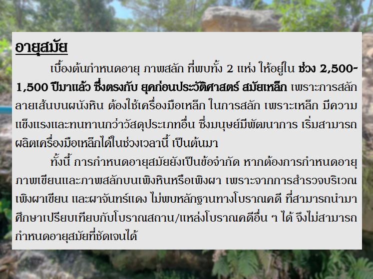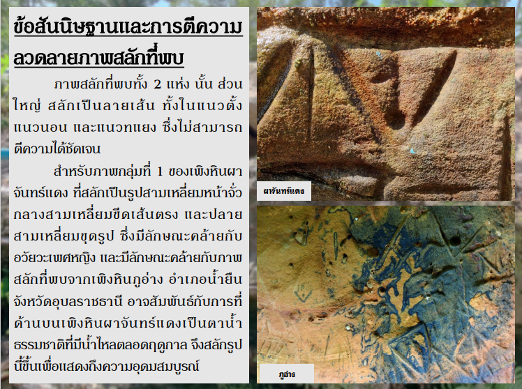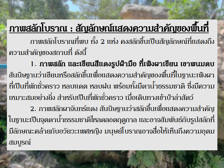 ความพิเศษของพื้นที่ทั้ง 2 แห่ง ที่พบ ภาพสลัก นั้น คือ เป็นพื้นที่ที่มนุษย์โบราณ สามารถเข้ามาใช้ประโยชน์เพื่อดำรงชีพ ได้ ดังนั้น มนุษย์โบราณอาจสลักภาพเหล่านี้ขึ้นเพื่อเป็นสัญลักษณ์ หรือแสดงความสำคัญของพื้นที่ดังกล่าวให้กลายเป็น Landmark หรือจุดหมายตา ของมนุษย์โบราณ ได้อย่างชัดเจน