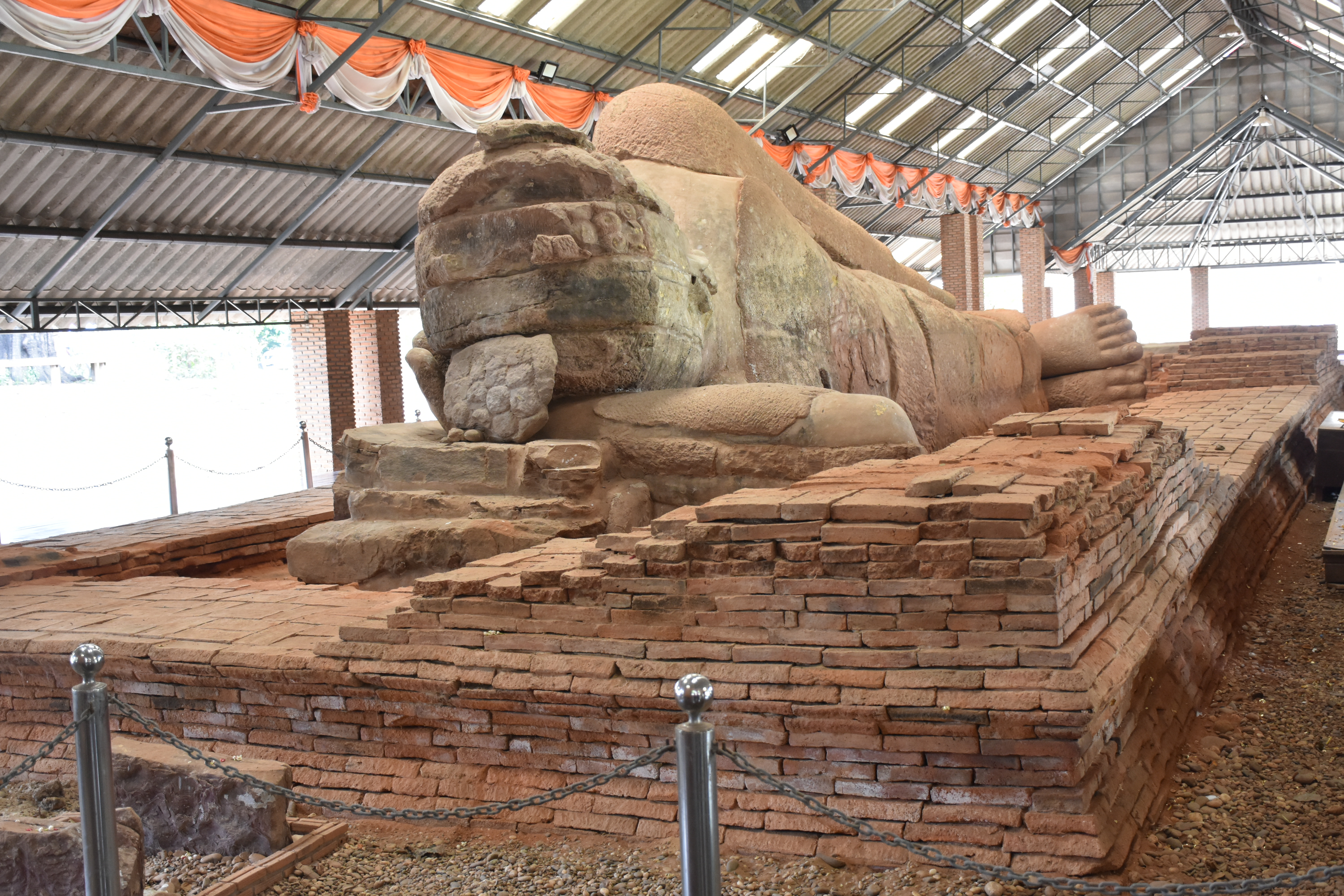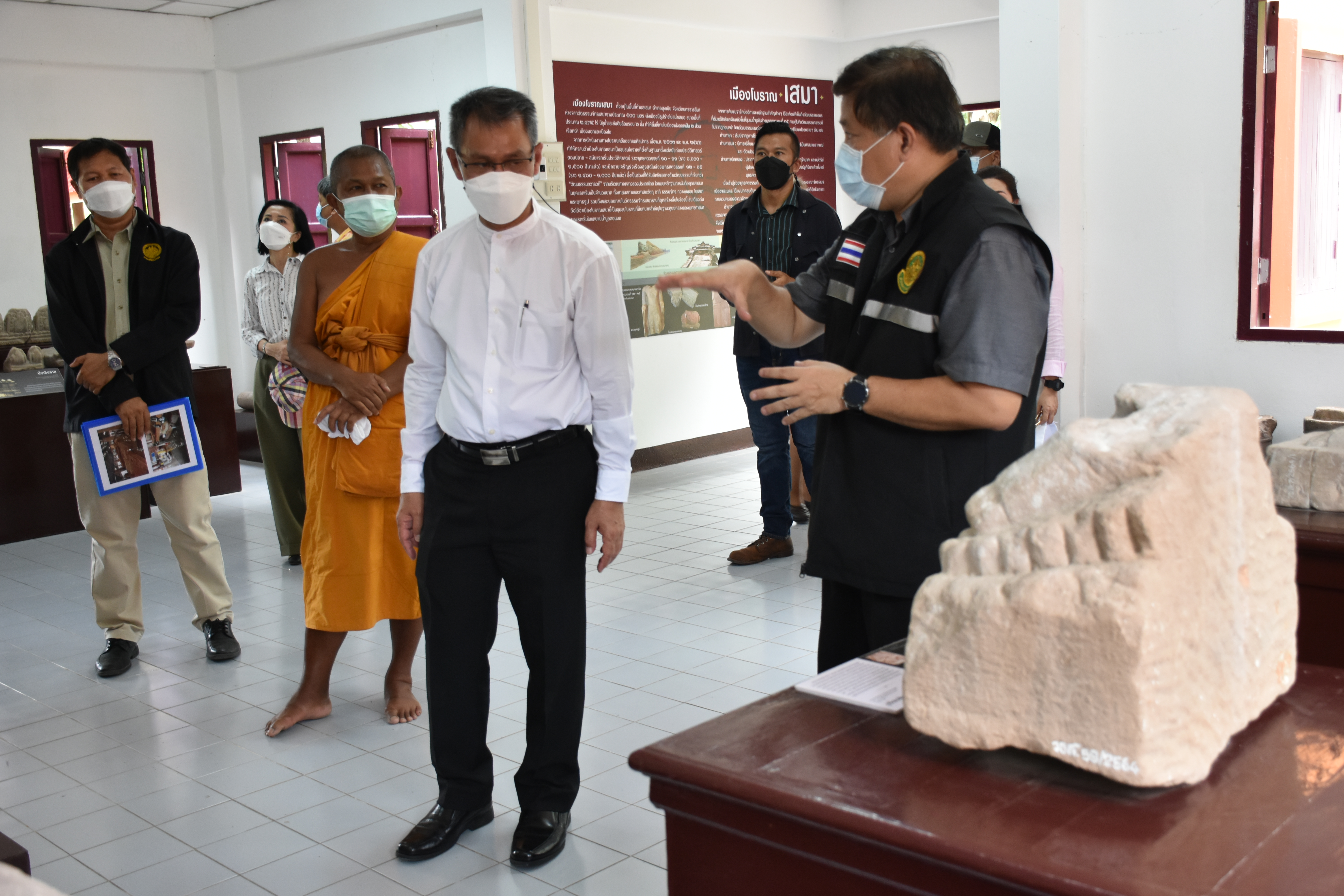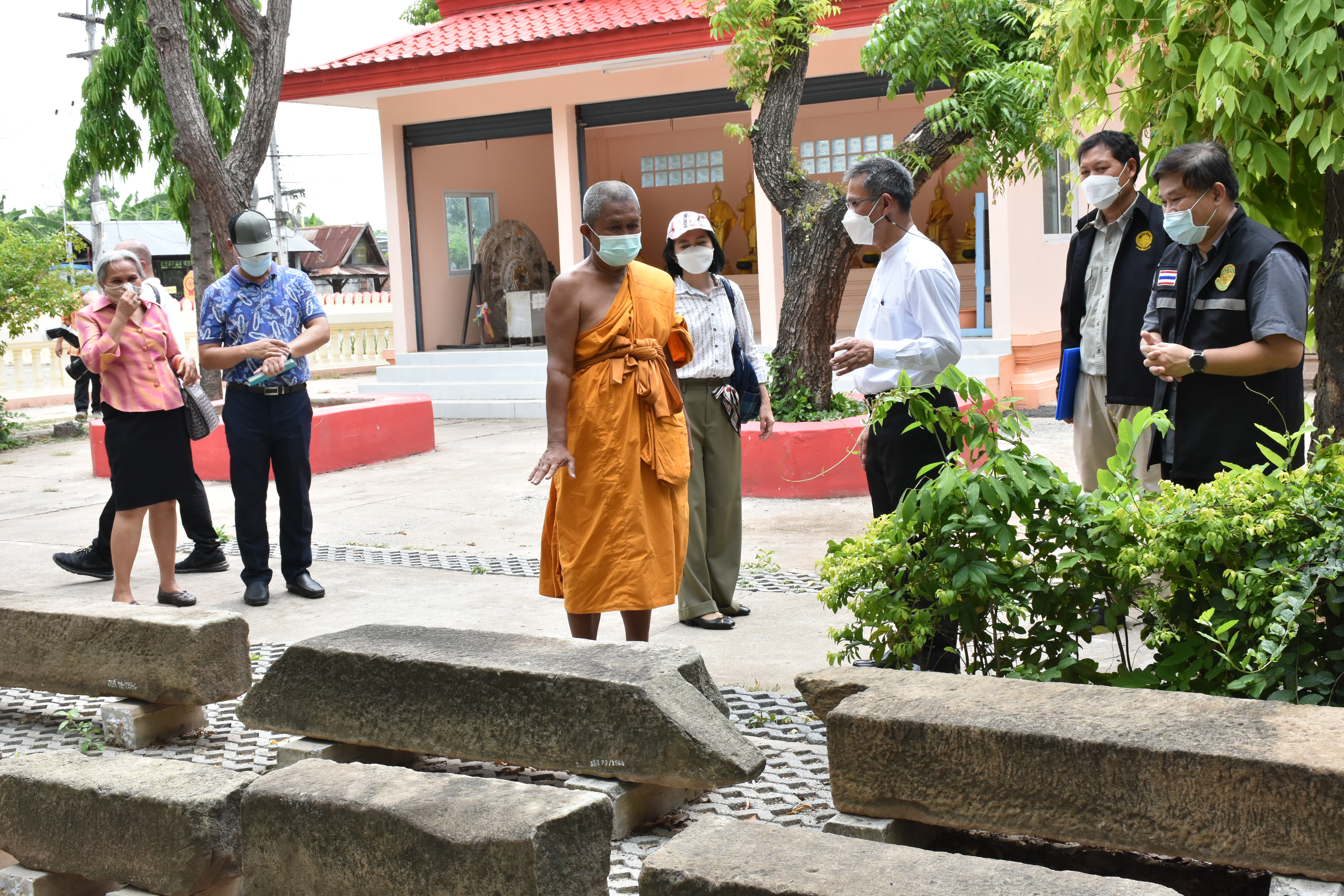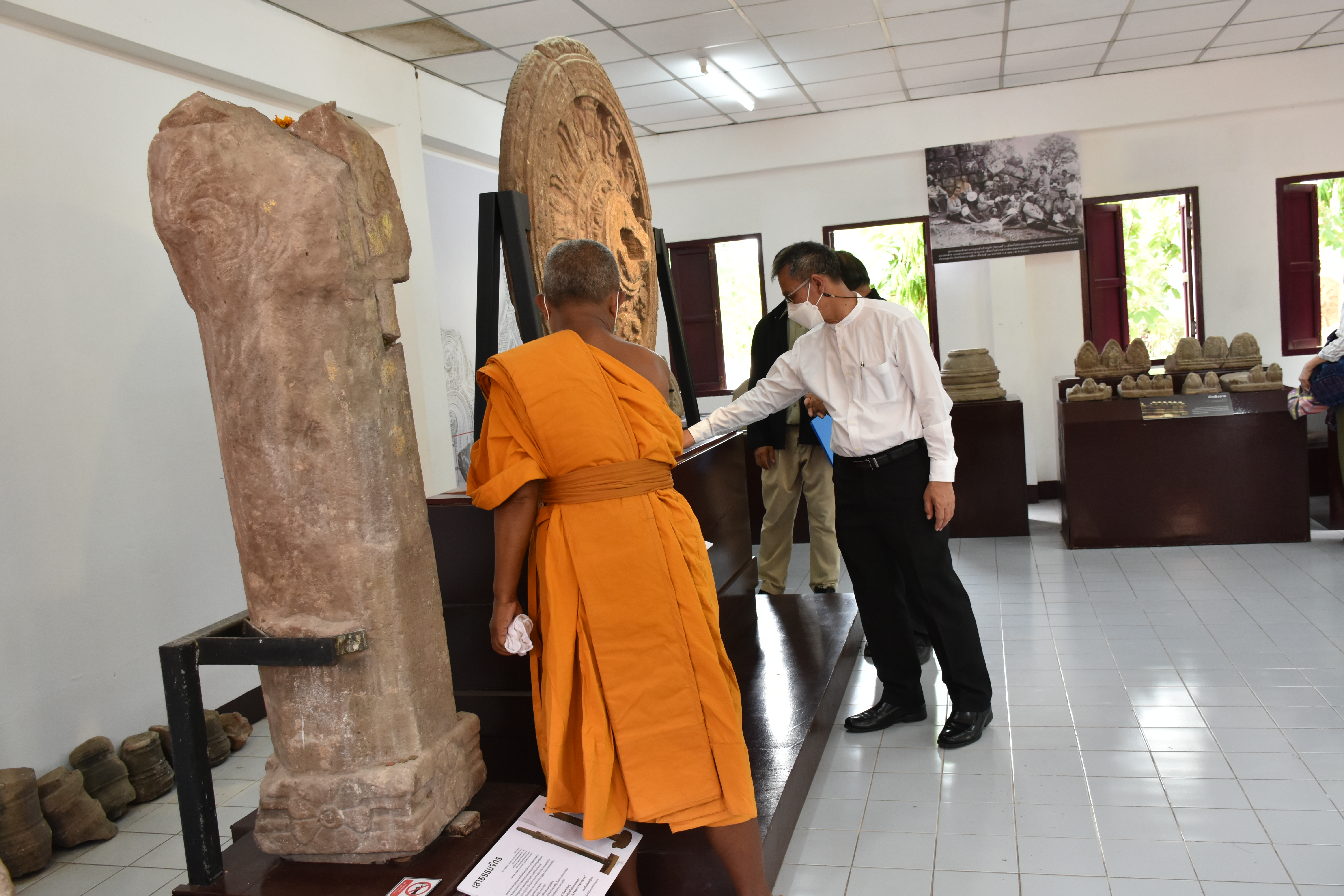 นายกิตติพันธ์ พานสุวรรณ อธิบดีกรมศิลปากร ลงพื้นที่ตรวจดูความเสียหายและหาแนวทางการบูรณะพระนอนหินทรายสมัยทวารวดี ที่เกิดความชื้นขององค์พระ สาเหตุจากระดับนํ้าใต้ดิน