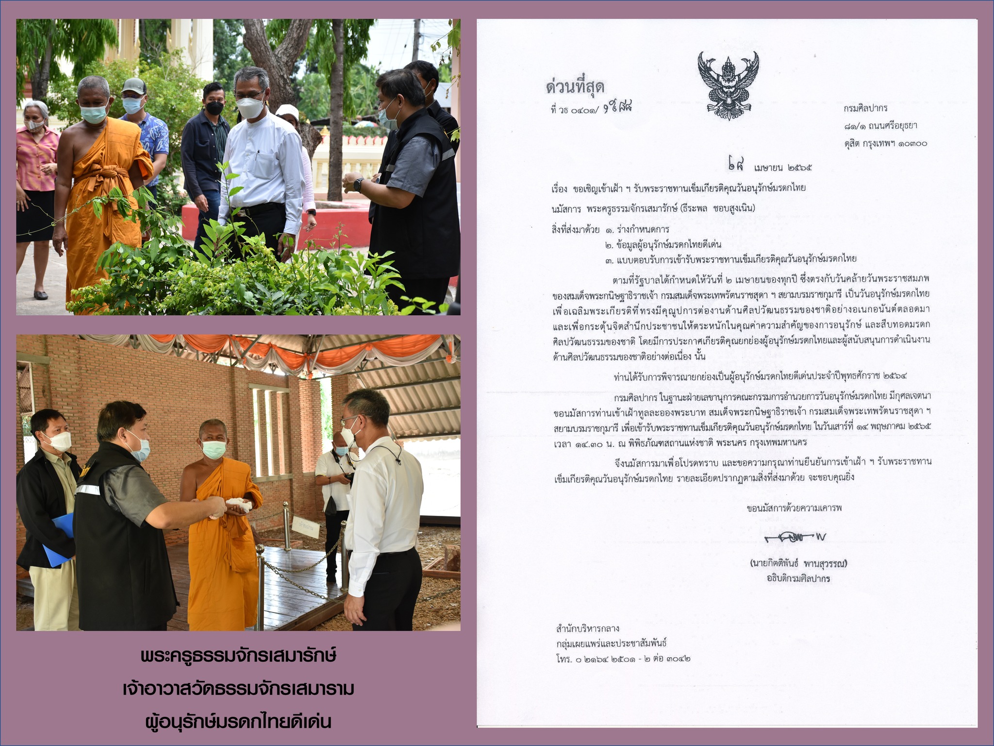 โดยทั้ง 5 บุคคล/หน่วยงาน ที่ได้รับการประกาศเกียรติคุณยกย่องนี้ จะเข้าเฝ้าทูลละอองพระบาท สมเด็จพระกนิษฐาธิราชเจ้า กรมสมเด็จพระเทพรัตนราชสุดาฯ สยามบรมราชกุมารี เพื่อเข้ารับพระราชทานเข็มเกียรติคุณวันอนุรักษ์มรดกไทย ในวันเสาร์ที่ 14 พฤษภาคม 2565 ณ พิพิธภัณฑสถานแห่งชาติ พระนคร กรุงเทพมหานคร ต่อไป