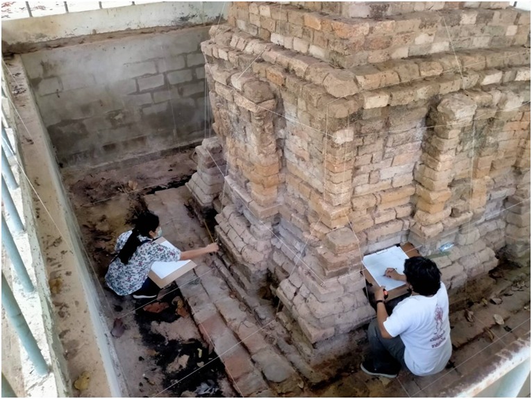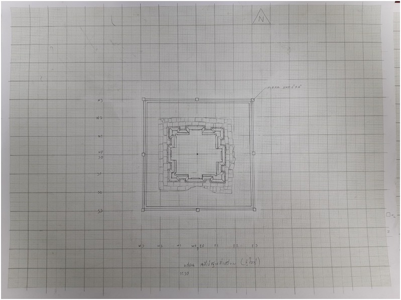 การดำเนินงานวางผังตีกริด และเขียนแบบสภาพปัจจุบันโบราณสถานกู่แก้วสี่ทิศ ๑. กู่แก้วสี่ทิศ ๒. ซากอาคารเจดีย์ฐานสี่เหลี่ยม (กู่ใหญ่) ๓. ซากอาคารเจดีย์ฐานหกเหลี่ยม (กู่น้อย) ตำบลหว้านคำ อำเภอราษีไศล จังหวัดศรีสะเกษ ระหว่างวันที่ ๑๘ – ๒๒ เมษายน ๒๕๖๕