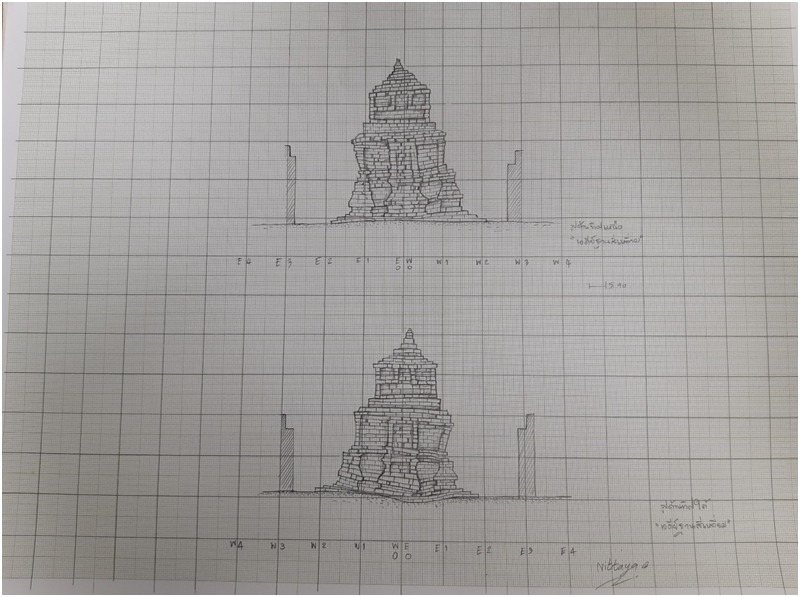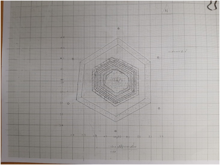 ๕. แปลน แผนผัง รูปตัดเจดีย์ฐานสี่เหลี่ยม (กู่ใหญ่) เจดีย์ฐานหกเหลี่ยม (กู่น้อย)