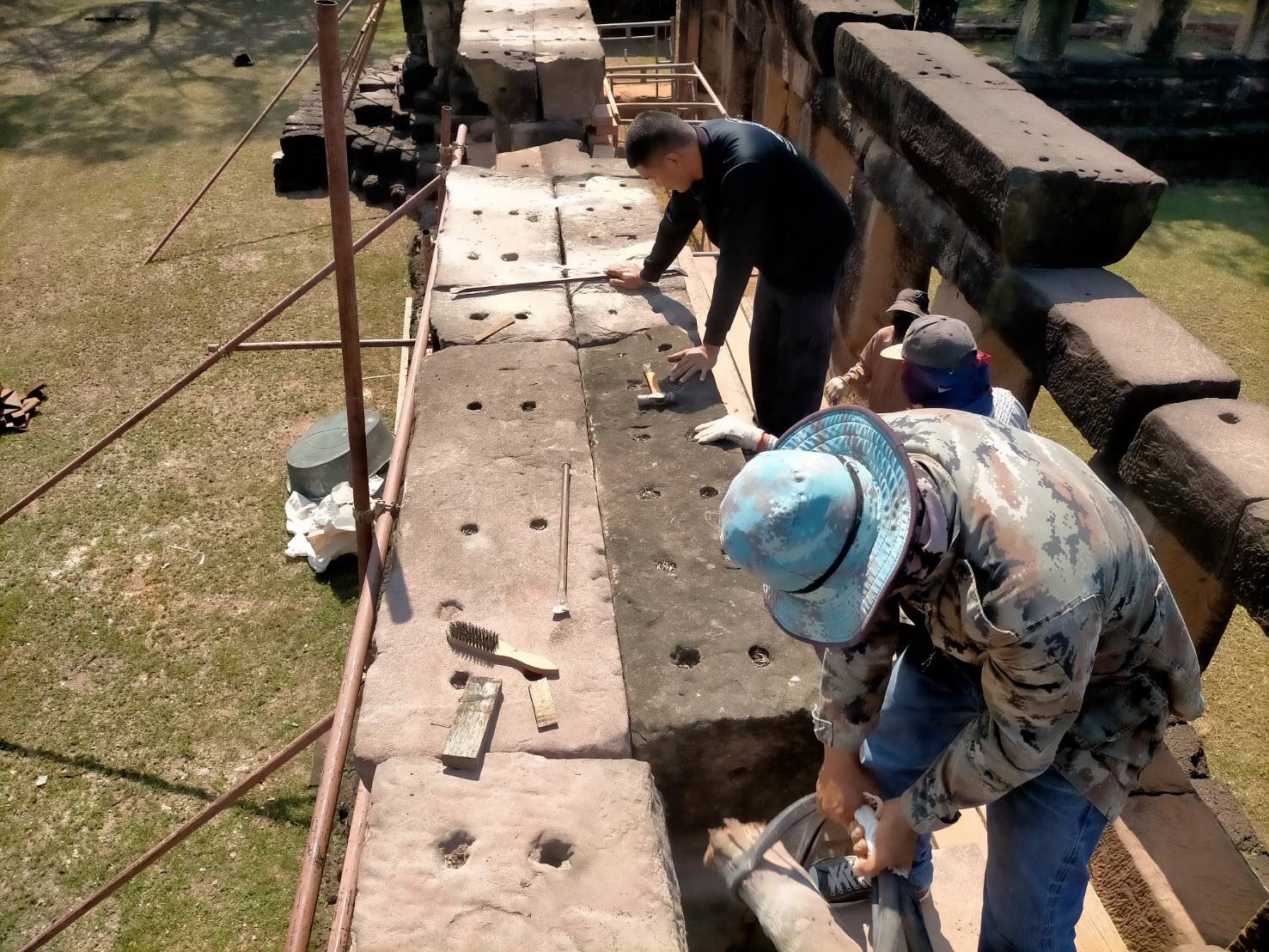 - ก่ออิฐเสริมผนังระเบียงคตเพื่อช่วยรับน้ำหนักชิ้นส่วนด้านบน