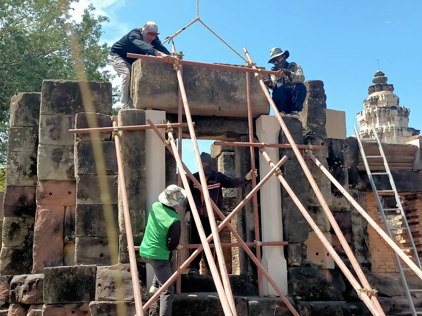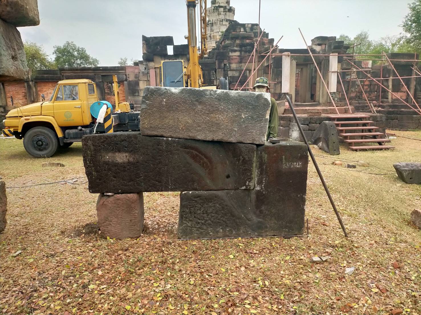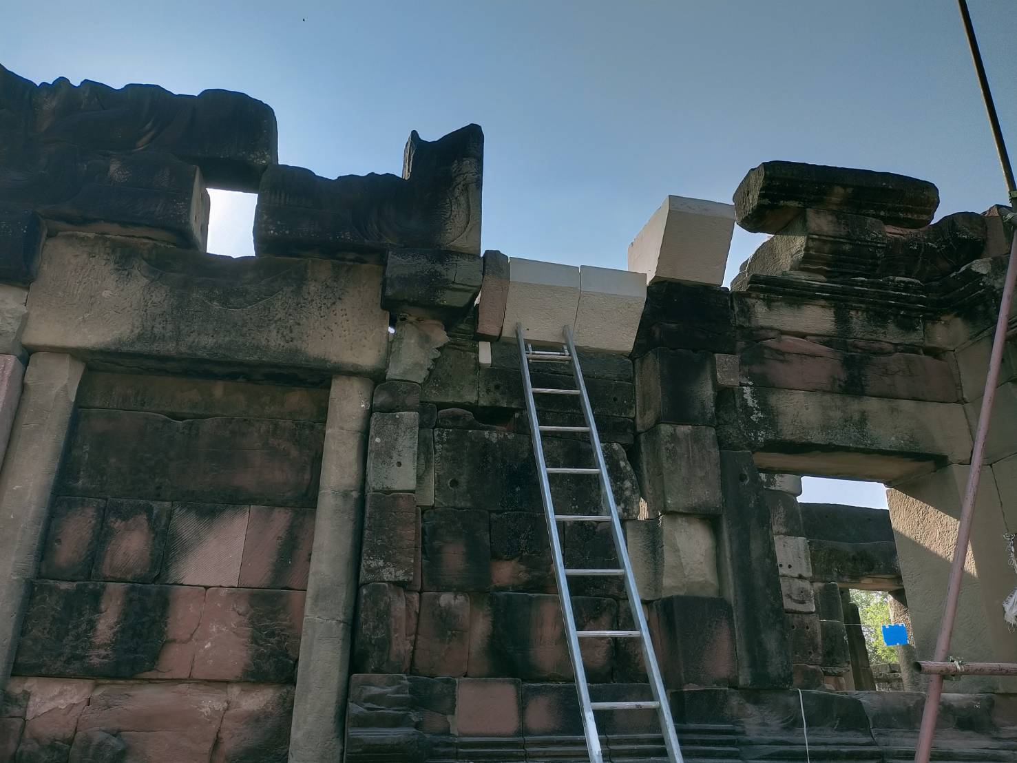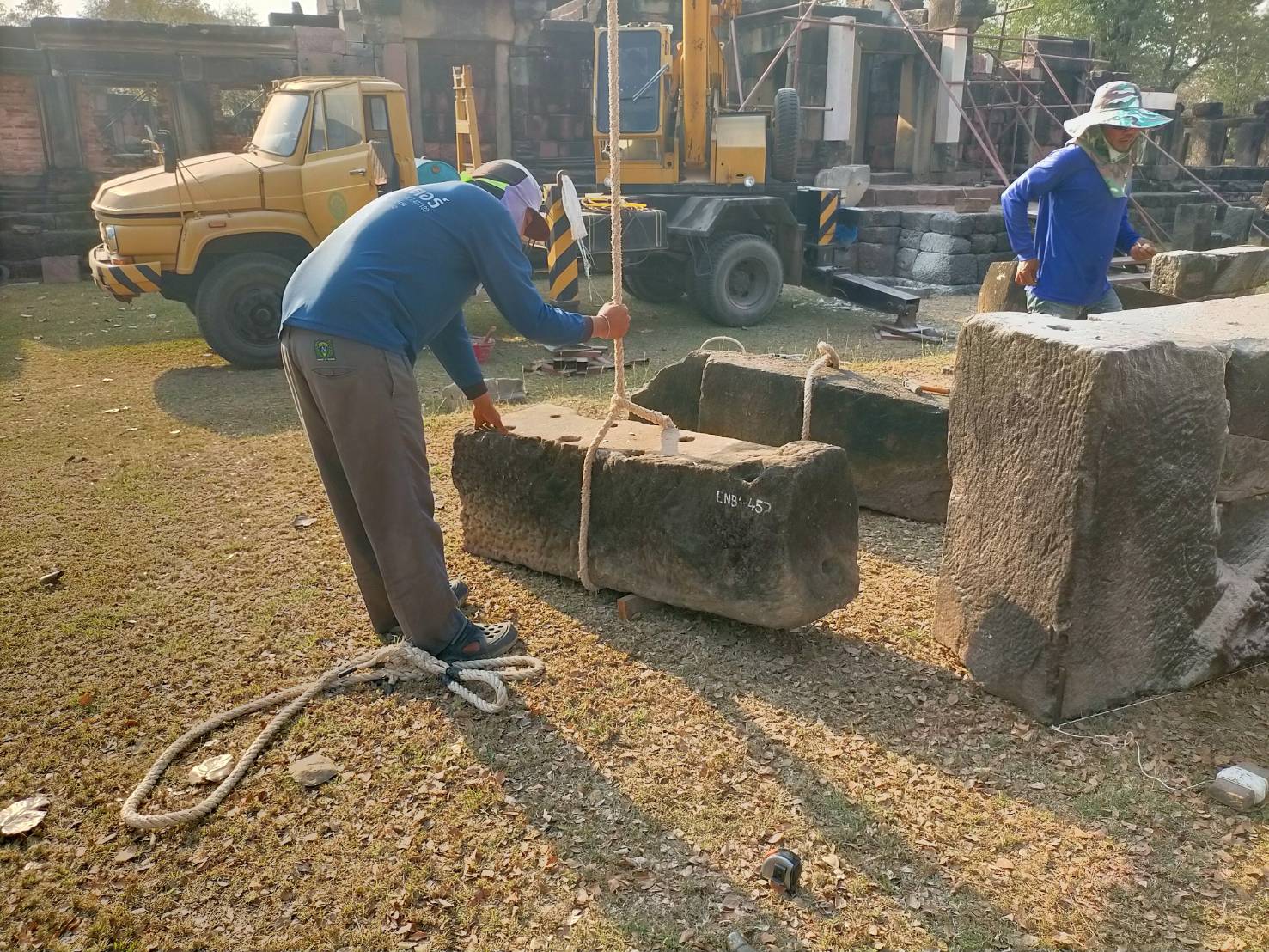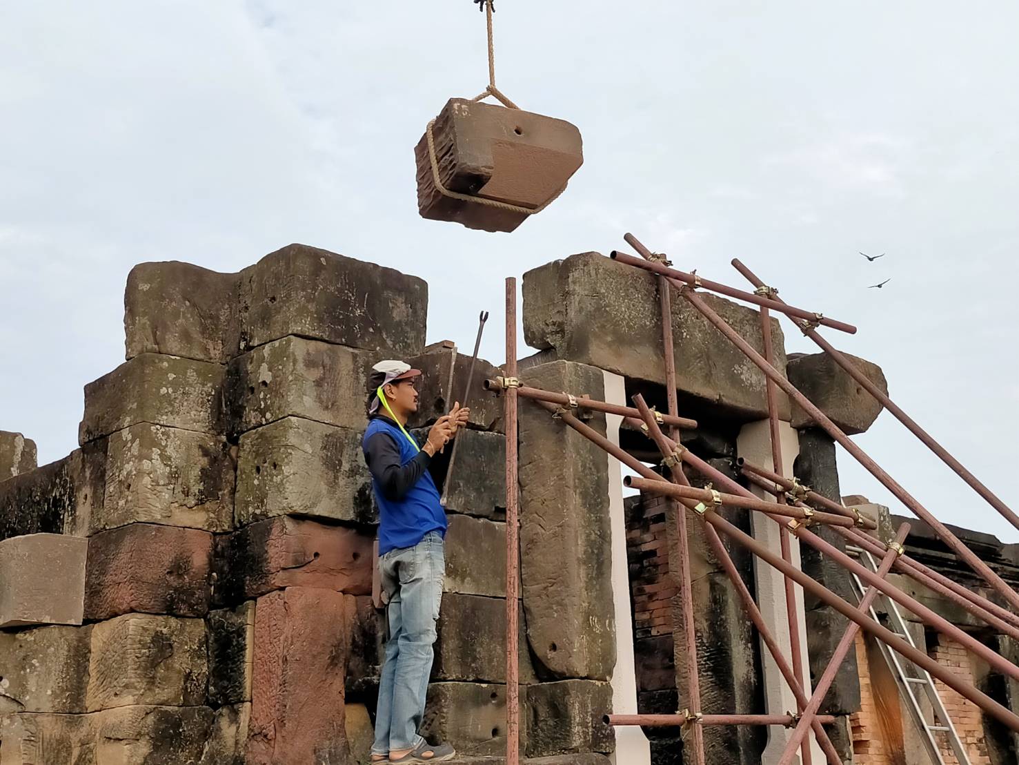 - นำหินเก่าและหินใหม่มาตัดแต่งแล้วนำขึ้นติดตั้งตามส่วนของผนังและย่อมุมโคปุระ